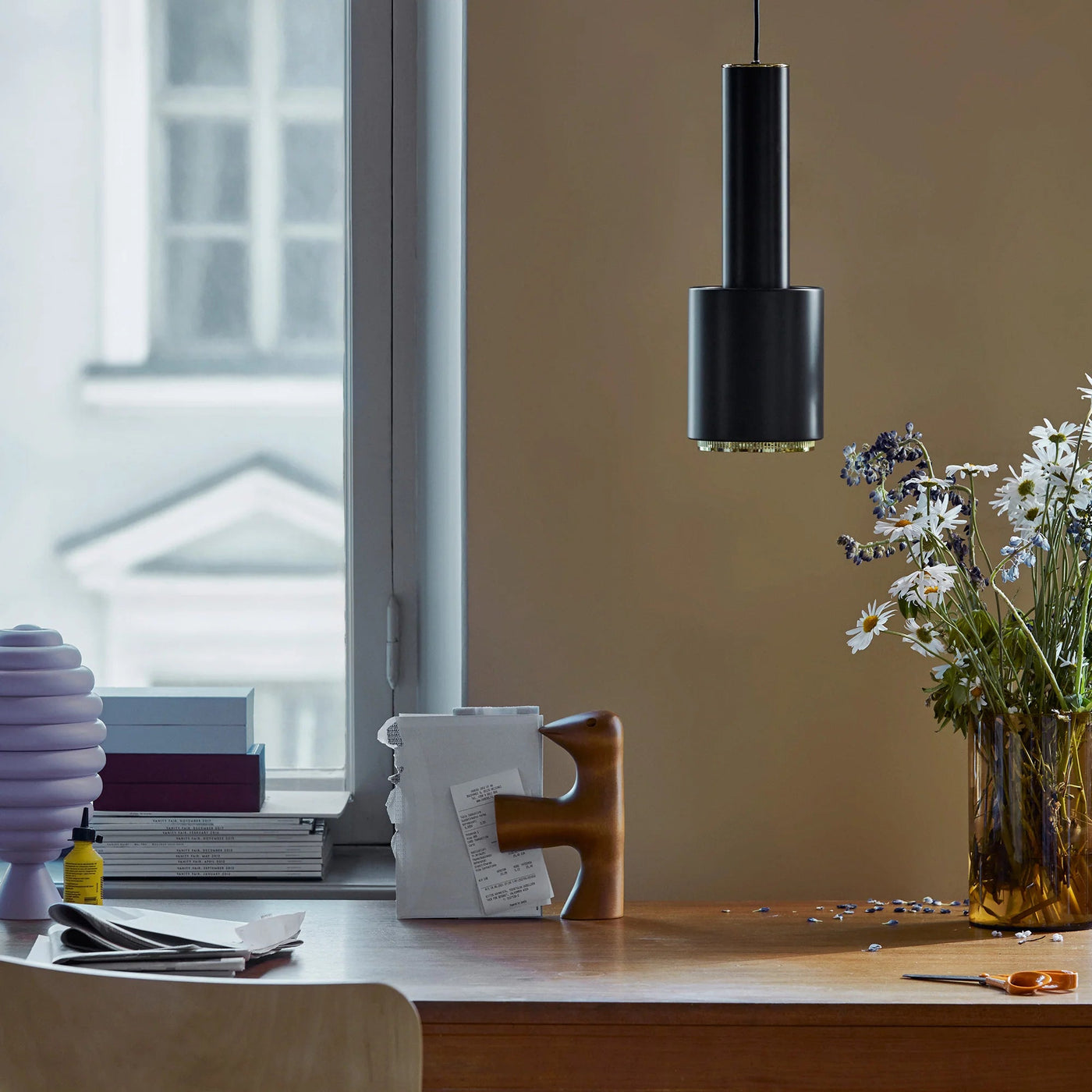 The Artek A110 Pendant by Alvar Aalto was designed in 1952. Originally created for the Finnish Engineers Association, it blends modern design with functionality. The A110 Pendant provides focused illumination, making it ideal for dining areas, kitchens, or living rooms. It enhances the ambiance while being efficient. Made of aluminum and steel, the A110 Pendant features a removable brass ring in white, black, or polished brass. It comes with an 8.2-foot adjustable cord, allowing you to customize the fixture to suit your space. The A110 Pendant works well in various interior settings, from compact to large. Artek, founded in 1935, leads the world of modern lighting and Scandinavian design. Known for clarity and simplicity, Artek continues to create iconic pieces like the A110 Pendant. Their work combines beauty with function, ensuring lasting elegance in every space.