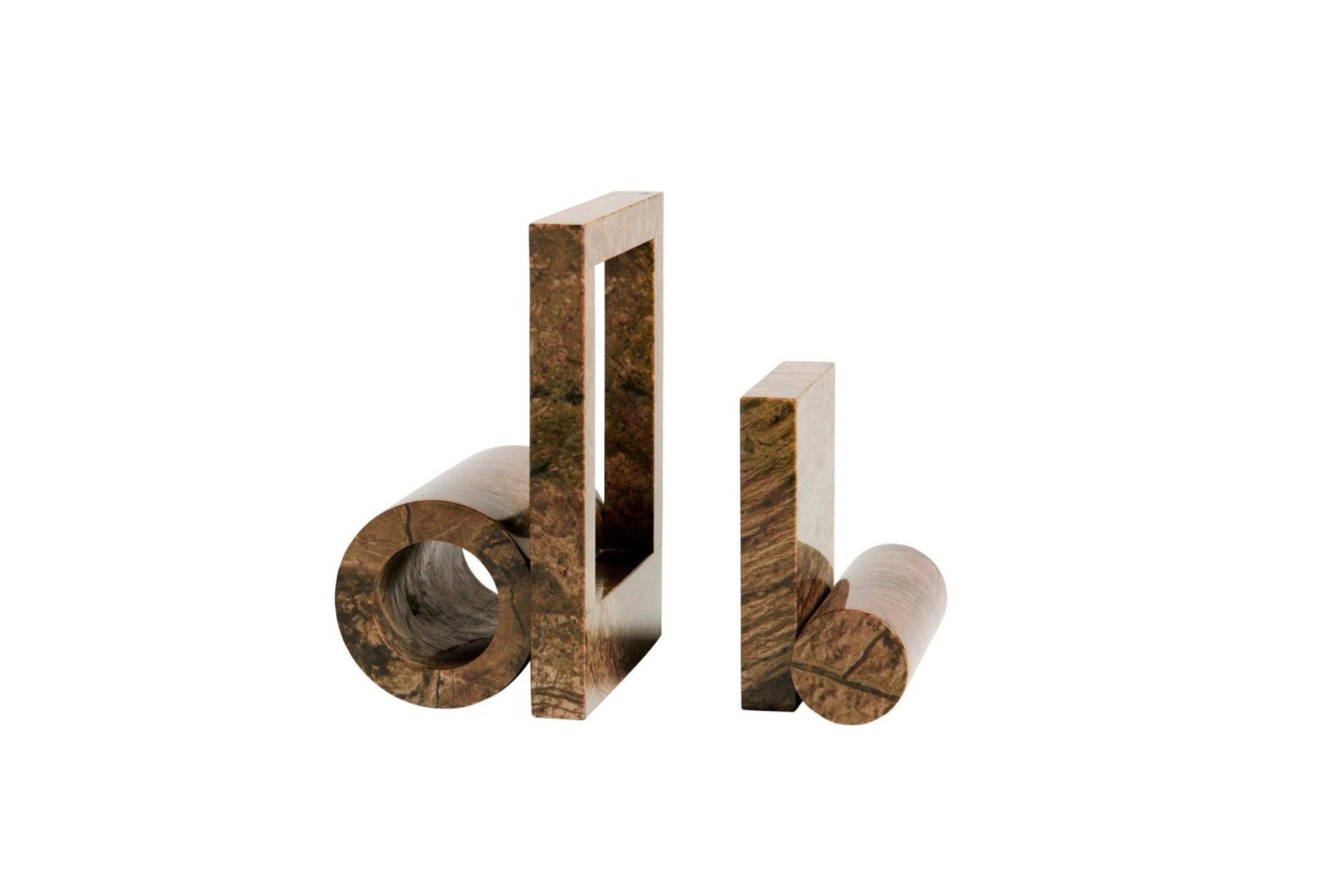 The Woud Booknd takes the basic concept of holding books upright and turns it into this smart sculptural solution that actually makes your shelves more interesting to look at. Designer Roel Vandebeek created two marble pieces - one small, one large - that combine soft cylindrical shapes with clean straight lines, and the genius is in how they stay visually connected even when you've got a whole row of books between them. Available in rich brown, deep black, and striking green marble finishes, each set weighs over 6 pounds total, so these aren't going anywhere when you lean heavy coffee table books against them. The larger bookend features strategic cutouts that keep the design feeling light despite the substantial marble construction, while the smaller piece provides the perfect counterbalance on the other end. What makes Booknd really clever is how it works as both functional storage and decorative art depending on how you use it. When you need them as actual bookends, the two pieces create this satisfying visual dialogue across your book collection - the repeated geometric forms tie everything together instead of just being random objects stuck on either end. But you can also use them separately as sculptural accents on different shelves or surfaces, since each piece looks intentional on its own. The smooth marble surface feels substantial and cool to the touch, and the natural stone patterns mean every set has unique variations and character. Whether you're organizing a small collection of favorite reads or anchoring a serious library, the weight distribution and stable base design handle everything from lightweight paperbacks to massive art books without tipping or sliding around. Woud builds from Denmark with founders Mia and Torben Koed connecting international design talent with Scandinavian principles, and Belgian designer Roel Vandebeek represents this collaboration perfectly. Working across art, industrial design, and interior design, Vandebeek brings his focus on user-centered design and sustainability to create pieces that solve real problems while looking beautiful. The Booknd is part of his HIDN collection concept, which explores "hidden connections in plain sight" - exactly what these bookends demonstrate by maintaining visual unity even when separated. Since founding in 2014, Woud has built their reputation on working with designers who understand that the best accessories should enhance daily routines rather than just taking up space, creating pieces that work as both functional tools and meaningful objects that bring intentionality to whatever room they inhabit.