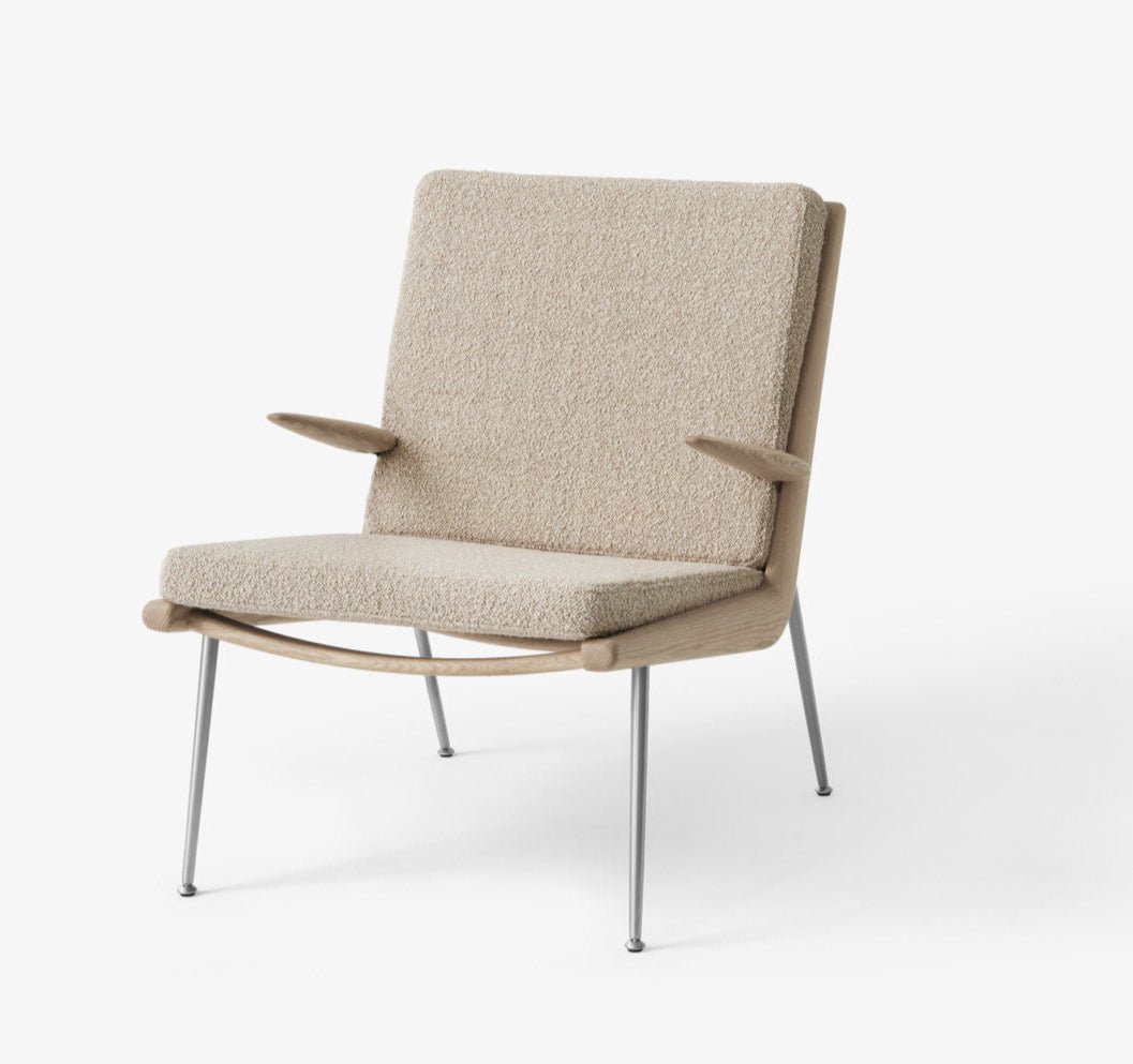 The &Tradition Boomerang Lounge Chair is a striking example of mid-century Danish design. First introduced in 1956 by renowned duo Hvidt & Mølgaard, the chair blends elegance with minimalist precision. Its silhouette is bold yet graceful, making it a standout piece in any interior. Crafted with a hand-polished wooden frame, the &Tradition Boomerang Lounge Chair showcases the beauty of natural materials. The frame curves gently, resembling the namesake boomerang. Its legs—available in either slender brass or stainless steel—add a refined, modern touch while offering strength and stability. Despite its sculptural appeal, the chair does not sacrifice comfort. The angled backrest and supportive seat create an inviting place to relax. It’s well-suited for both lounging in a quiet reading nook or elevating the look of a modern living room. The Boomerang Lounge Chair is more than furniture—it’s a design statement. Every detail, from the smooth wood finish to the seamless metal legs, reflects the legacy of Danish craftsmanship. With its no-frills construction and timeless profile, this chair continues to impress decades after its debut. The &Tradition Boomerang Lounge Chair brings enduring style and character to any space, proving that great design never goes out of fashion.