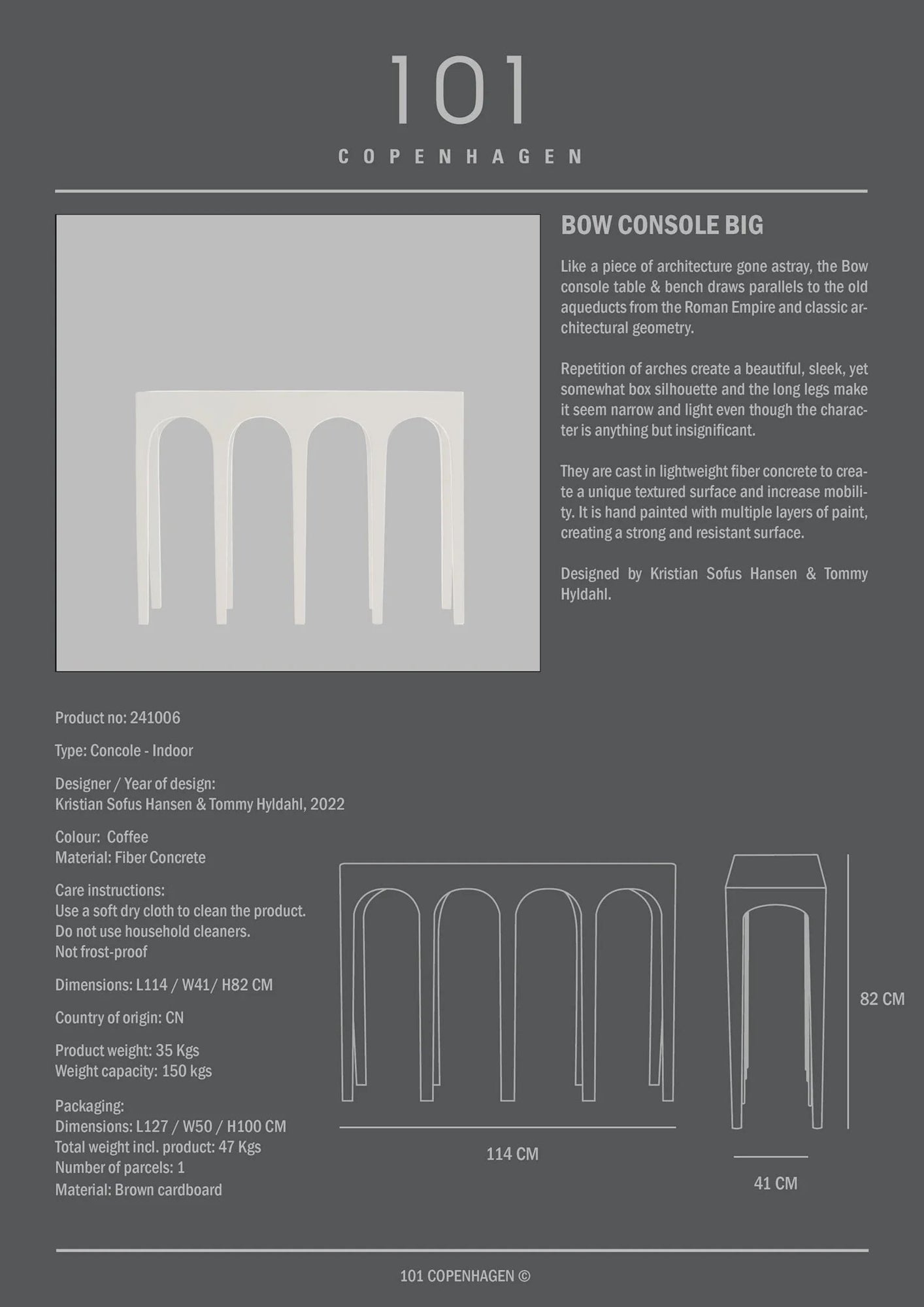 The 101 Copenhagen Bow Console brings curved sophistication to storage furniture, delivering a sculptural console that combines flowing design elements with practical functionality while providing the perfect storage solution that enhances entryways, living rooms, or any space with contemporary character. This console understands that curved furniture should offer both visual elegance and genuine utility - providing beautiful surfaces and refined construction that elevate room aesthetics while offering reliable storage for organizing items, displaying objects, or simply serving as sculptural presence that makes spaces truly distinctive. The Bow design achieves this through quality materials and flowing proportions that create substantial presence without overwhelming interior arrangements, making it ideal for entryways, living room displays, hallway storage, or any location that benefits from furniture with curved character and modern functionality. What's particularly striking about this console is how it manages to feel both sculpturally sophisticated and practically useful, providing the storage solution that makes organization effortless while adding flowing sophistication that makes spaces feel harmoniously designed and thoughtfully appointed. The construction quality becomes evident when this console handles regular use while maintaining its refined appearance through daily interaction with storage needs, display styling, and seasonal changes. The surfaces provide dependable organization for various items, while the materials maintain their clean aesthetic through regular use and environmental exposure. The flowing proportions work perfectly with different room configurations and storage needs - substantial enough to provide meaningful storage but scaled appropriately for residential settings that celebrate both function and curved aesthetic. The console encourages practical organization rather than precious treatment - providing reliable functionality for everything from daily essentials to decorative displays without feeling fragile or overly designed. The overall form manages to feel both substantial and gracefully curved, offering the kind of dependable functionality that makes storage furniture essential while maintaining the flowing beauty that makes harmonious spaces feel intentional and sophisticatedly appointed. 101 Copenhagen approaches curved console design with the understanding that flowing furniture should enhance both practical storage and organic sophistication, creating pieces that support daily living while contributing to the overall elegance and visual harmony of thoughtfully designed spaces. They recognize that the best curved furniture serves multiple functions while maintaining the flowing design elements that make contemporary spaces feel systematically coherent and visually refined. The Bow Console collection reflects this philosophy perfectly, creating storage solutions that honor organic design principles while providing the functionality and curved appeal that make flowing furniture essential for how people actually want to organize and live in spaces that celebrate both practical utility and the enduring appeal of graceful, contemporary design.