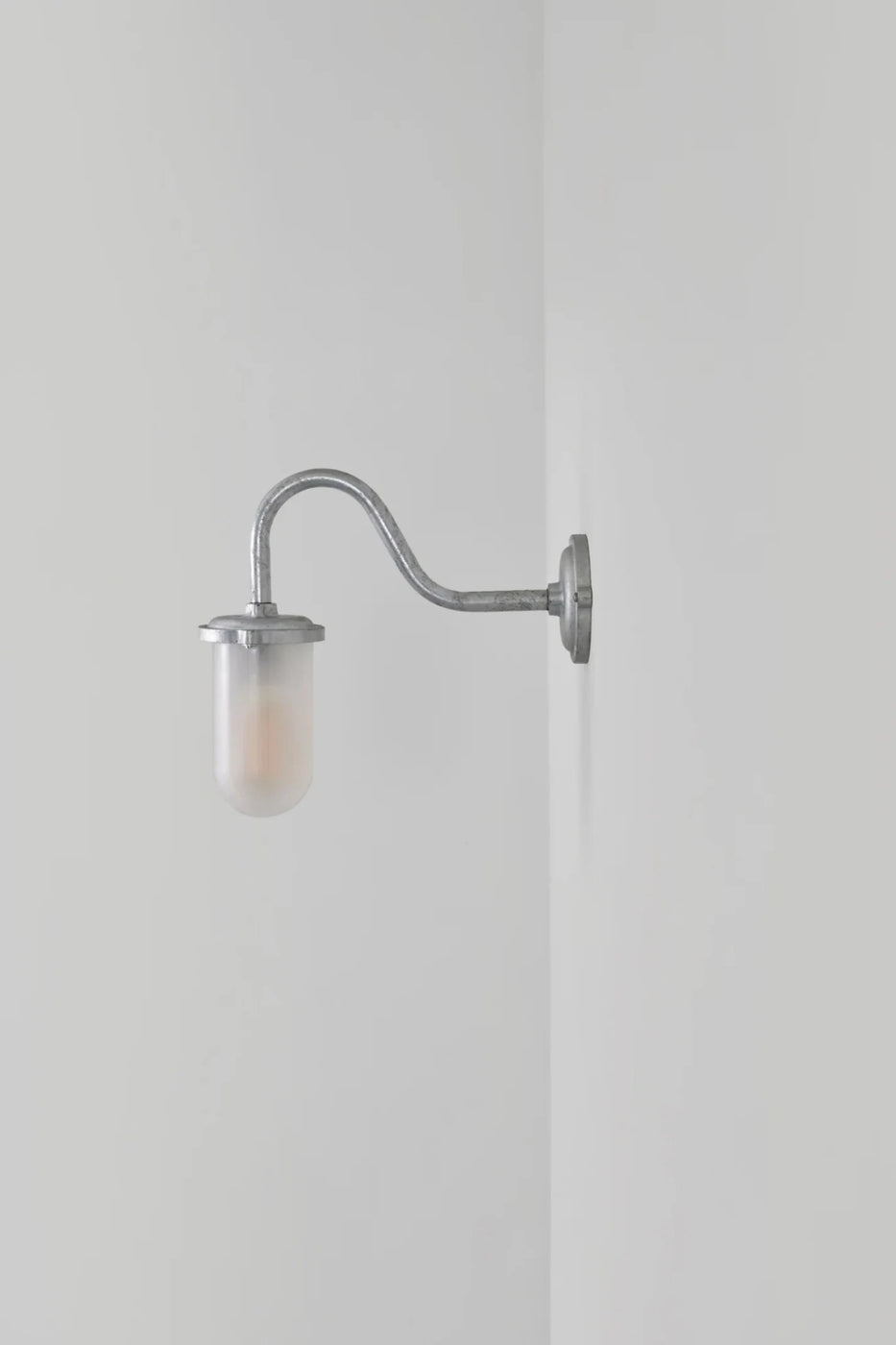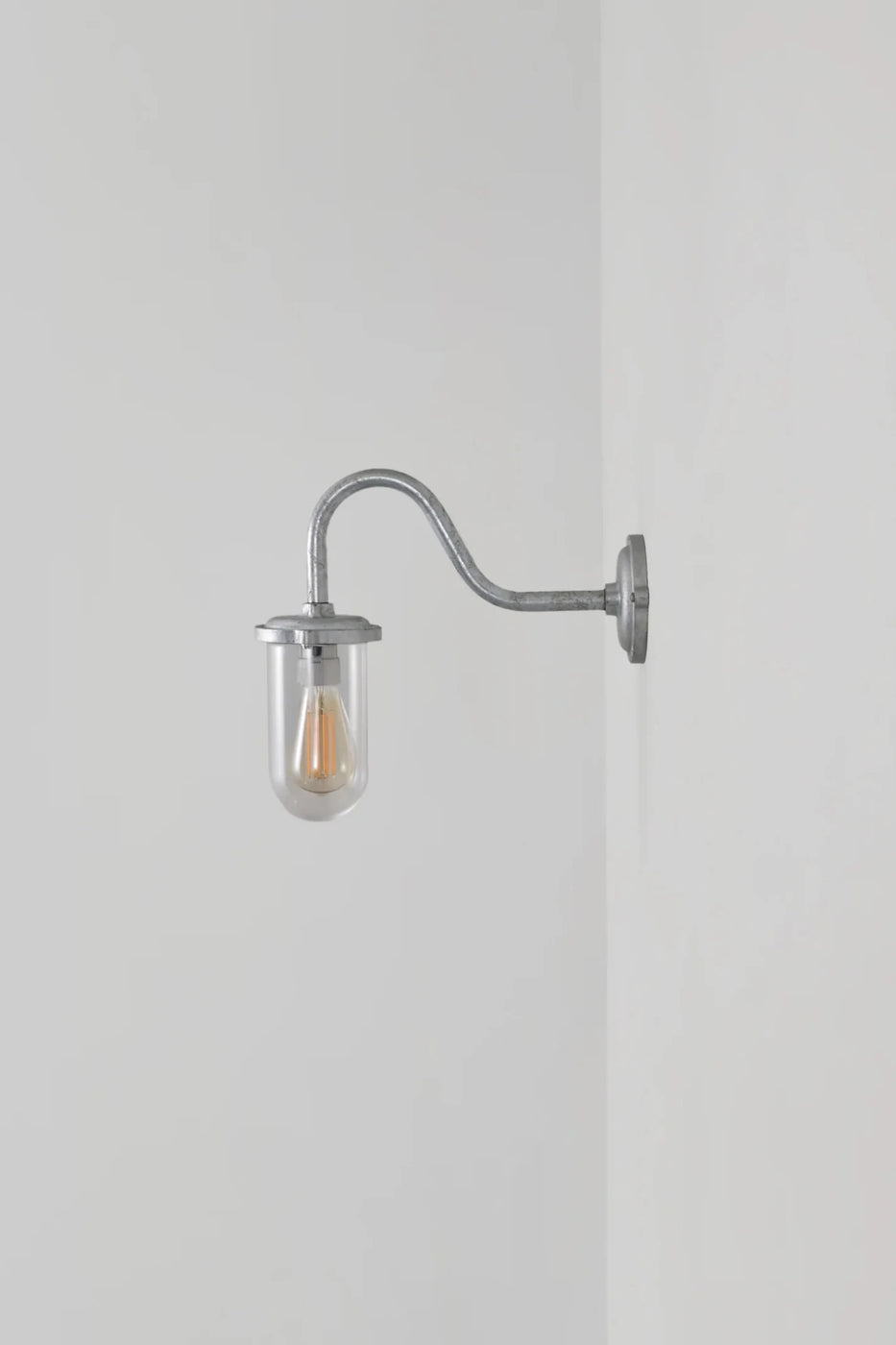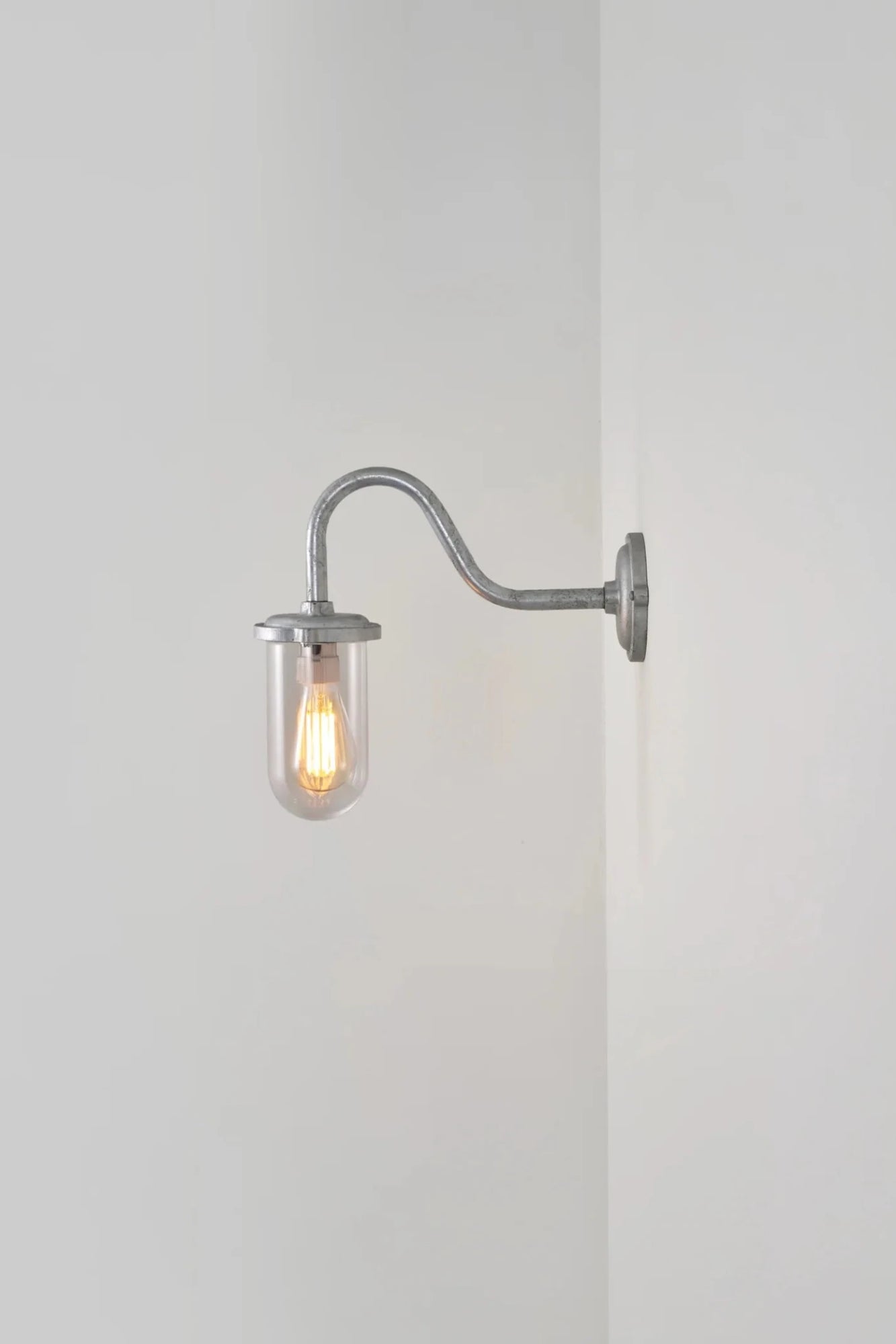 Skillfully cast at Birmingham metalworks and rated IP54, this fixture ensures reliable performance in challenging weather conditions while maintaining its refined aesthetic appeal. The heavy cast construction uses galvanized iron and steel with clear or frosted glass options, while the swan neck arm design provides both functional light direction and architectural elegance. E27 compatibility supports up to 100W bulbs with standard, energy-saving, or LED options, and the robust mounting system ensures lasting stability. Available in galvanized finish for authentic industrial appeal or black painted finish for contemporary integration. The fixture can be mounted with either a round base or corner fork configuration to suit different architectural applications.