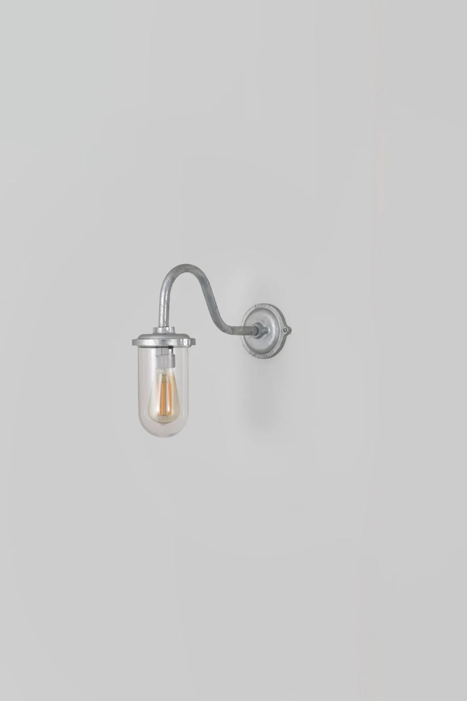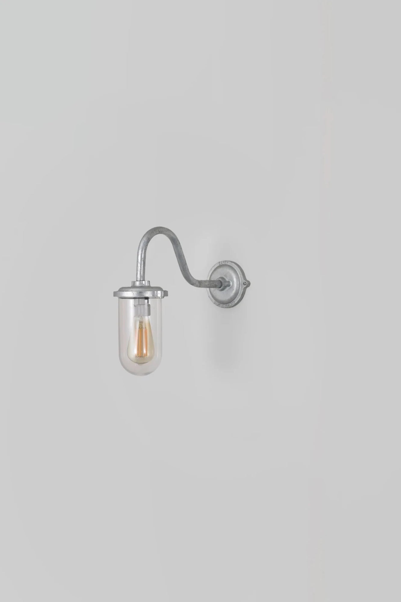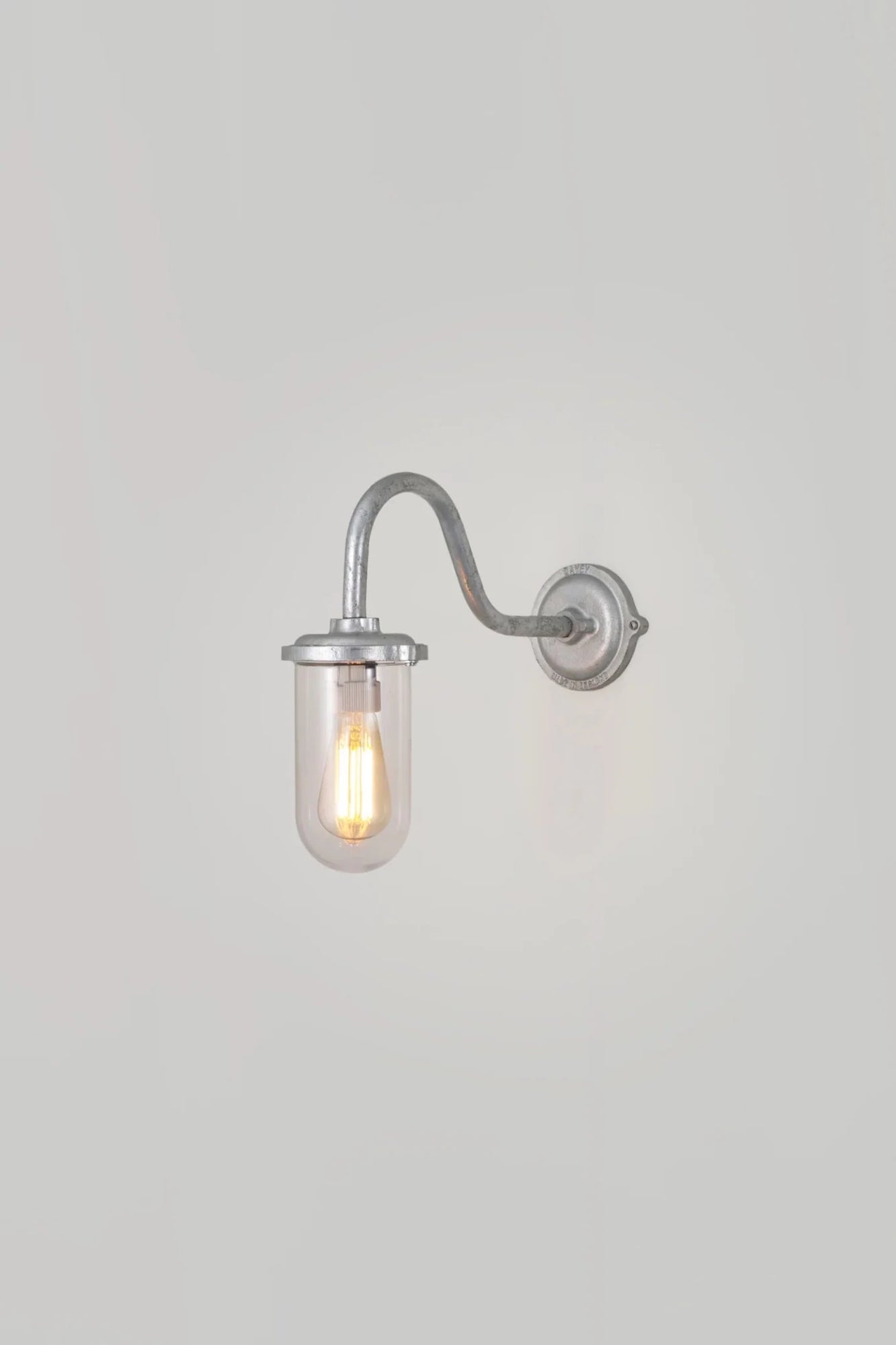 Skillfully cast at Birmingham metalworks and rated IP54, this fixture ensures reliable performance in challenging weather conditions while maintaining its refined aesthetic appeal. The heavy cast construction uses galvanized iron and steel with clear or frosted glass options, while the swan neck arm design provides both functional light direction and architectural elegance. E27 compatibility supports up to 100W bulbs with standard, energy-saving, or LED options, and the robust mounting system ensures lasting stability. Available in galvanized finish for authentic industrial appeal or black painted finish for contemporary integration. The fixture can be mounted with either a round base or corner fork configuration to suit different architectural applications.