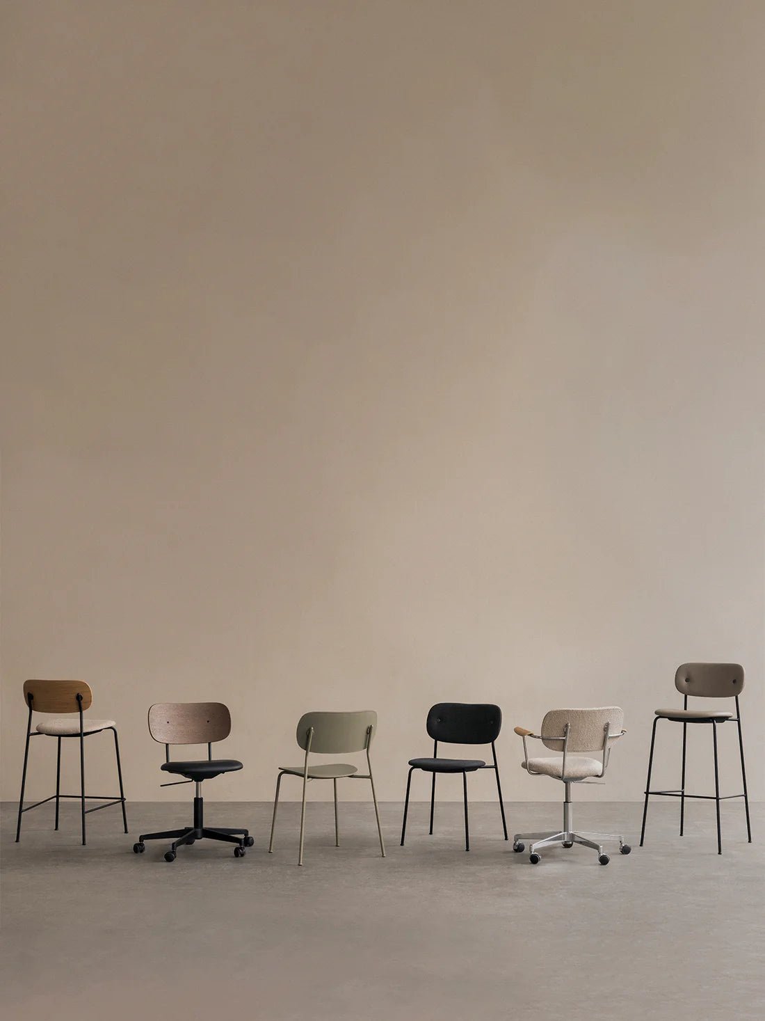The Audo Copenhagen Co Task Chair with upholstered seat and armrests transforms the typical office chair experience by prioritizing both ergonomic function and aesthetic integration in spaces where work and life intersect. This chair recognizes that contemporary work happens in dining rooms, bedrooms, and kitchen nooks just as much as dedicated offices, so it needs to provide professional-level support while looking like intentional furniture rather than corporate equipment. The upholstered seat offers genuine comfort for extended computer sessions, while the armrests support natural typing posture without the bulky, mechanical appearance that makes most office chairs feel intrusive in residential settings. What's particularly thoughtful is how the design maintains the Co collection's refined aesthetic while delivering the ergonomic performance that prevents fatigue during long work days. The functional performance becomes clear during those marathon work sessions where inferior chairs start causing back pain or restless shifting. The seat cushioning provides proper support without being too firm or too soft, maintaining its shape and comfort level even after hours of use. The armrests are positioned at the optimal height for reducing shoulder tension while typing, and the swivel and height adjustment mechanisms operate smoothly without the squeaking or sticking that plague cheaper office chairs. The black base gives it a sophisticated appearance that complements different desk styles and room aesthetics, while the upholstery handles daily use beautifully. Unlike typical office chairs that announce "workspace" from across the room, this one integrates seamlessly into living spaces while delivering superior ergonomic support. Audo Copenhagen designs task chairs with the Danish understanding that work furniture should enhance both productivity and the spaces where it lives, rather than requiring aesthetic compromises for functionality. They recognize that modern work life demands seating that supports focused productivity while respecting the design integrity of homes where professional and personal activities overlap throughout the day. The Co Task collection reflects this philosophy perfectly, creating chairs that facilitate effective work while maintaining the comfort and visual appeal that make them welcome additions to thoughtfully designed spaces rather than necessary but unwelcome functional intrusions.