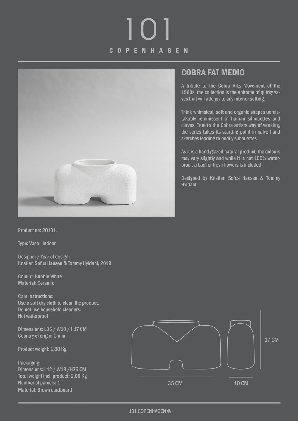 The 101 Copenhagen Cobra Vase Fat brings sculptural drama to any space, delivering contemporary elegance that works perfectly for showcasing full arrangements, bold florals, or standing alone as striking modern art. The bubble white finish adds soft luminosity and sophisticated texture while providing the perfect vessel for both dramatic bouquets and architectural branches on console surfaces, dining tables, or floor displays. What's particularly appealing about the Cobra Fat is how its flowing, serpentine form manages to feel both dramatically artistic and surprisingly versatile, creating substantial visual presence without overwhelming intimate spaces or competing with delicate arrangement styles. The construction quality becomes evident through regular use, with the bubble white finish maintaining its pristine appearance through daily interaction with water, varied stem types, and seasonal styling changes. The carefully considered proportions work beautifully for different floral elements - the generous opening accommodates full bouquets and mixed arrangements while the substantial base provides excellent stability for heavy or top-heavy displays. The curved form creates natural visual flow that enhances both bold and subtle botanical compositions. The vase encourages creative arrangement styles rather than precious treatment, offering reliable functionality for everything from casual wildflower bunches to elaborate seasonal displays while maintaining its sculptural beauty through constant repositioning and styling experiments. 101 Copenhagen approaches contemporary vase design with the understanding that modern accessories should enhance both functional beauty and artistic expression. They recognize that the best sculptural vessels serve as both practical containers and conversation-starting design elements while maintaining the refined aesthetic qualities that make statement pieces feel intentionally curated rather than merely decorative. The Cobra Vase Fat collection reflects this philosophy perfectly, creating pieces that honor both organic form and practical function while providing the versatility and dramatic appeal that make artistic accessories essential for how people actually want to create bold botanical displays and sculptural beauty in their contemporary homes.