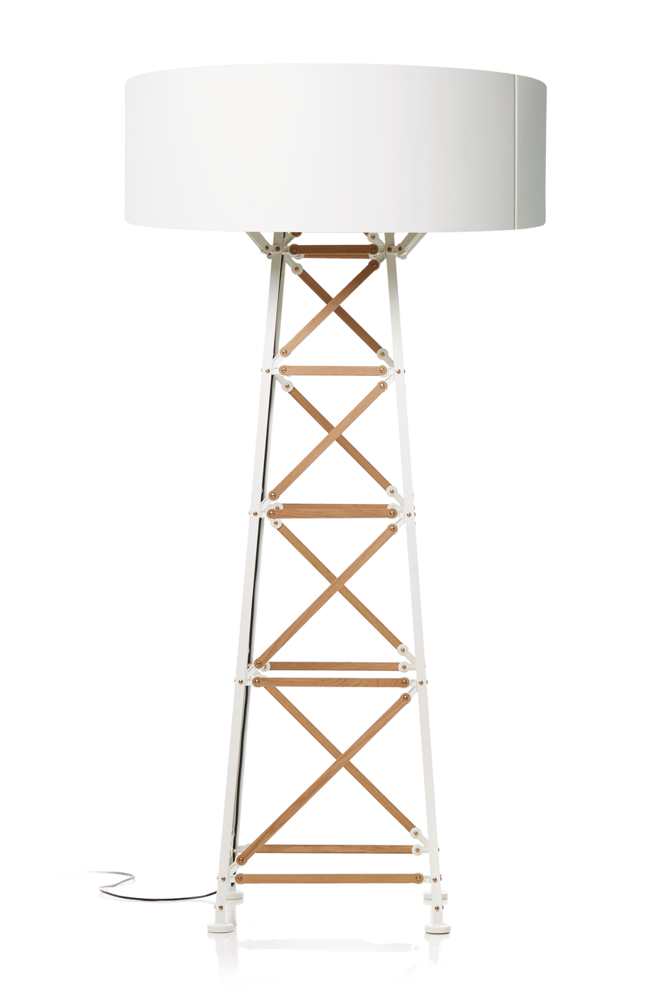 The Moooi Construction Lamp Floor takes inspiration from those classic erector sets and vintage construction toys you probably played with as a kid, but scales it up into something that actually works as sophisticated lighting. Designer Joost van Bleiswijk basically looked at telephone poles, Victorian cast iron components, and industrial scaffolding and thought "what if we turned this into a lamp that doesn't look like every other floor lamp out there?" The result is this 54.7-inch tall statement piece that resembles a miniature electricity pole, complete with intricate details like brass screws and, in the white version, actual wooden slats that give it this authentic construction site vibe. Available in both black and white powder-coated aluminum finishes, it manages to feel both industrial and playful without overwhelming your space. This thing is built like actual construction equipment - the diecast aluminum construction means it's sturdy enough to handle daily use while the bent steel shade directs light exactly where you need it. The inline dimmer gives you control over how much illumination you want, whether you're using it for ambient lighting or focused task work. At 26.4 inches square and weighing about 24 pounds, it has a substantial presence but won't dominate smaller rooms. What's really cool is that each lamp is assembled by hand, just like those vintage toys that inspired it, so there's actual craftsmanship involved rather than just mass production. The brass hardware and attention to detail make it feel more like functional art than basic lighting. Moooi, founded by Marcel Wanders in 2001, approaches design with this philosophy that beautiful objects should also spark conversation and bring unexpected joy into daily life. Working with designers like Joost van Bleiswijk, who's known for his "no glue no screw" furniture collections and architectural approach to everyday objects, they create pieces that challenge what lighting can be. The Dutch company (Moooi means "beautiful" in Dutch, with that extra "o" showing they're trying to do one better) focuses on transforming functional items into design statements that reflect personality rather than just providing basic illumination. Through collaborations with international creative minds, Moooi helps you build spaces that feel personal and imaginative rather than predictable.