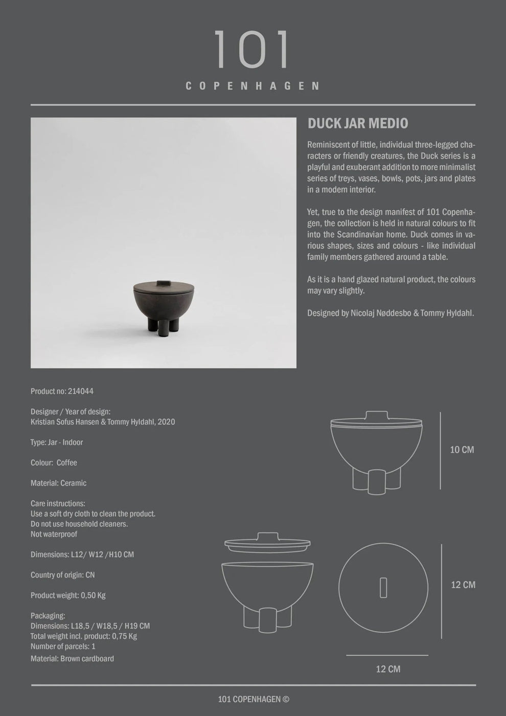 The 101 Copenhagen Duck Jar brings sculptural storage to any space, delivering contemporary elegance that works perfectly for organizing essentials, displaying collections, or simply adding organic character to kitchen counters, bathroom vanities, or shelving arrangements. The coffee finish adds rich warmth and sophisticated depth while providing the perfect vessel for everything from pantry staples to decorative objects or everyday storage needs. What's particularly appealing about the Duck is how its flowing, organic form manages to feel both naturally inspired and artistically refined, creating substantial visual interest without overwhelming intimate spaces or disrupting clean surface compositions. The construction quality becomes evident through daily use, with the coffee finish maintaining its beautiful appearance through regular interaction with contents, cleaning, and environmental changes. The carefully considered proportions work beautifully for different storage needs - spacious enough for practical organization while sized appropriately for residential surfaces and display areas. The smooth interior makes filling and cleaning effortless, while the organic form provides natural grip areas that make handling comfortable and secure. The sculptural curves create visual interest while maintaining functional reliability. The jar encourages versatile storage rather than single-purpose treatment, offering reliable organization for everything from kitchen ingredients to bathroom essentials while celebrating the inherent beauty of organic design. 101 Copenhagen approaches functional storage with the understanding that contemporary containers should enhance both practical utility and natural sophistication. They recognize that the best organizational objects serve as both useful vessels and sculptural elements while maintaining the organic design qualities that make statement accessories feel fresh and timeless. The Duck Jar collection reflects this philosophy perfectly, creating pieces that honor both natural form and practical function while providing the versatility and visual appeal that make artistic storage essential for how people actually want to organize and display in their contemporary homes.