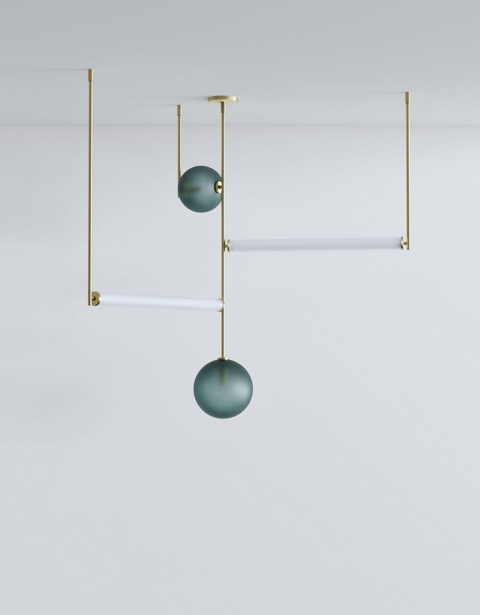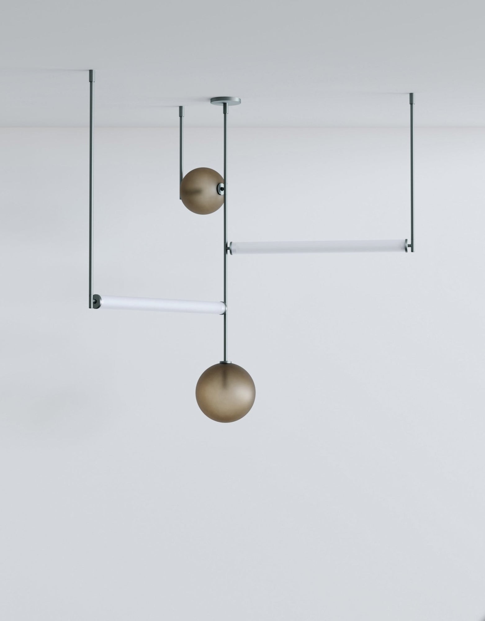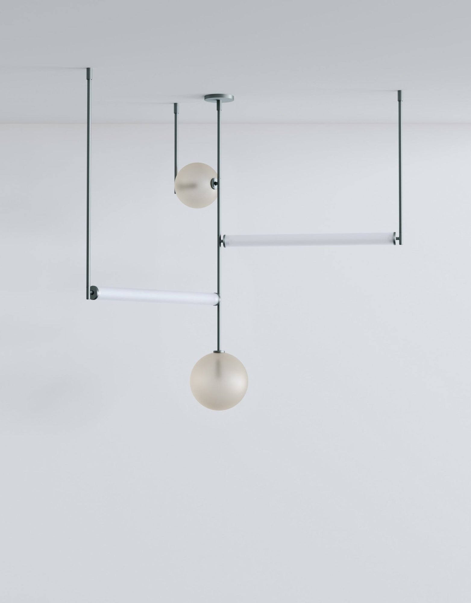 The L&G Equalizer 4 Piece Axial takes the Equalizer system and arranges it in a cross or radial configuration instead of running straight across like the linear version. You still get four glass globes suspended from anodized aluminum tubing, but the axial setup works better for centering over square tables, in corners, or anywhere you want light distributed in multiple directions from a central point rather than along one axis. The fixture mounts to two 12-inch round canopies on your ceiling, with the tubes radiating outward to create this architectural statement that's more sculptural than a standard linear pendant. The connecting tubes use frosted scalloped glass - always, not optional - which adds this diffused glow along the structure itself beyond just the end globes. Each globe delivers 550 lumens at 2700K, and with four of them arranged in different directions, you get well-distributed ambient lighting that reaches the whole space evenly. Same finish lineup as the rest of the Equalizer family: anodized aluminum in Olive, Bronze, Black, or Gold, paired with translucent glass globes in Smokey Green, Cream, Grey, Bronze, or Chameleon. The GY 6.35 bi-pin LED bulbs (5 watts, 24 volts, rated for 30,000 hours) come standard, and the linear tubes have integrated 12-volt LEDs. Dimming's built in, so you can dial brightness from full task lighting down to subtle ambient glow. UL certification available on request, compatible with most international electrical systems, and the whole thing's custom-built to your specifications with that 10-12 week lead time. Ladies & Gentlemen Studio designed the Equalizer collection in 2016 with John Hogan, and the axial configuration shows their interest in creating lighting that doubles as spatial sculpture. Dylan Davis and Jean Lee's Brooklyn studio approaches fixtures as jewelry for architectural spaces - geometric forms softened by warm materials and light diffusion. The axial arrangement works particularly well in open-plan spaces where you want a central focal point that distributes light in multiple directions, or over square dining tables where linear fixtures always feel slightly off. Everything's customizable for materials, finishes, and sizing, so you're working with the studio to build something tailored to your specific space rather than adapting standard products to fit.