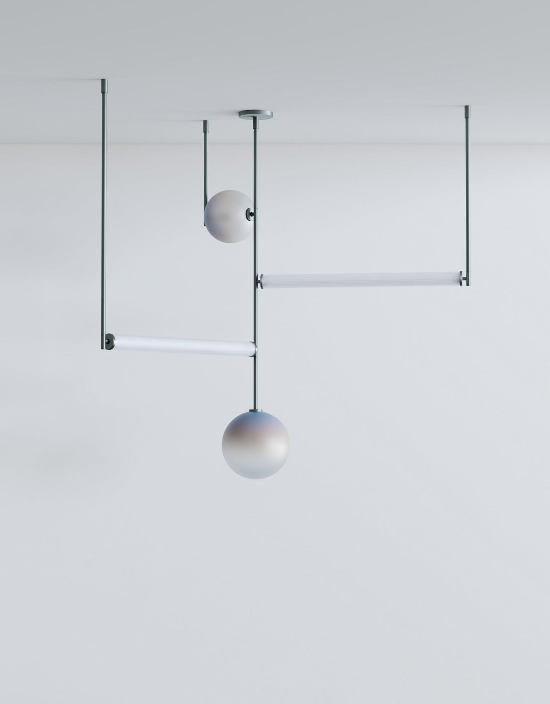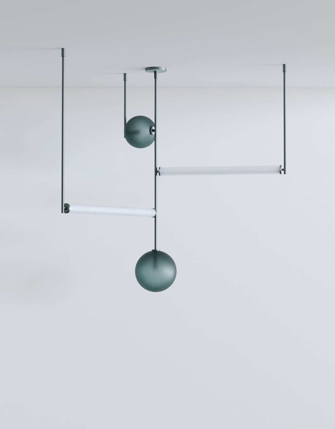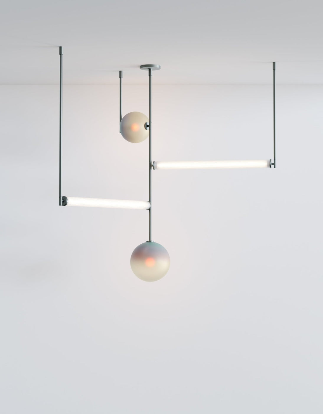 The L&G Equalizer 4 Piece Axial takes the Equalizer system and arranges it in a cross or radial configuration instead of running straight across like the linear version. You still get four glass globes suspended from anodized aluminum tubing, but the axial setup works better for centering over square tables, in corners, or anywhere you want light distributed in multiple directions from a central point rather than along one axis. The fixture mounts to two 12-inch round canopies on your ceiling, with the tubes radiating outward to create this architectural statement that's more sculptural than a standard linear pendant. The connecting tubes use frosted scalloped glass - always, not optional - which adds this diffused glow along the structure itself beyond just the end globes. Each globe delivers 550 lumens at 2700K, and with four of them arranged in different directions, you get well-distributed ambient lighting that reaches the whole space evenly. Same finish lineup as the rest of the Equalizer family: anodized aluminum in Olive, Bronze, Black, or Gold, paired with translucent glass globes in Smokey Green, Cream, Grey, Bronze, or Chameleon. The GY 6.35 bi-pin LED bulbs (5 watts, 24 volts, rated for 30,000 hours) come standard, and the linear tubes have integrated 12-volt LEDs. Dimming's built in, so you can dial brightness from full task lighting down to subtle ambient glow. UL certification available on request, compatible with most international electrical systems, and the whole thing's custom-built to your specifications with that 10-12 week lead time. Ladies & Gentlemen Studio designed the Equalizer collection in 2016 with John Hogan, and the axial configuration shows their interest in creating lighting that doubles as spatial sculpture. Dylan Davis and Jean Lee's Brooklyn studio approaches fixtures as jewelry for architectural spaces - geometric forms softened by warm materials and light diffusion. The axial arrangement works particularly well in open-plan spaces where you want a central focal point that distributes light in multiple directions, or over square dining tables where linear fixtures always feel slightly off. Everything's customizable for materials, finishes, and sizing, so you're working with the studio to build something tailored to your specific space rather than adapting standard products to fit.