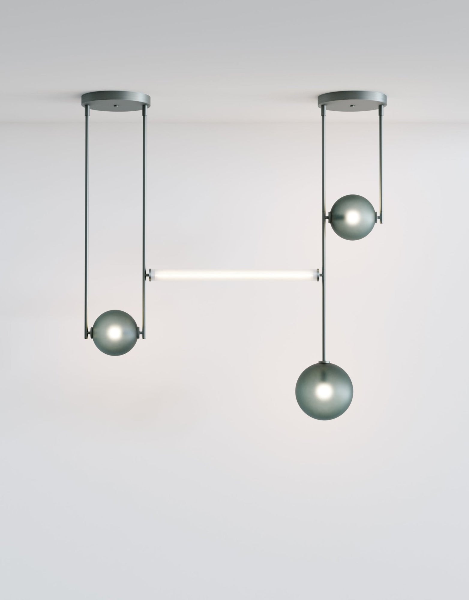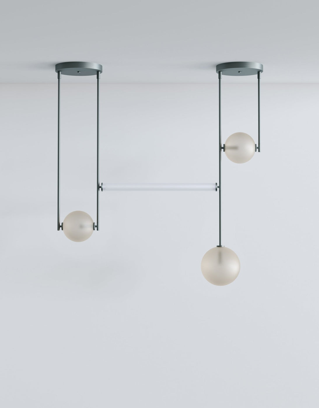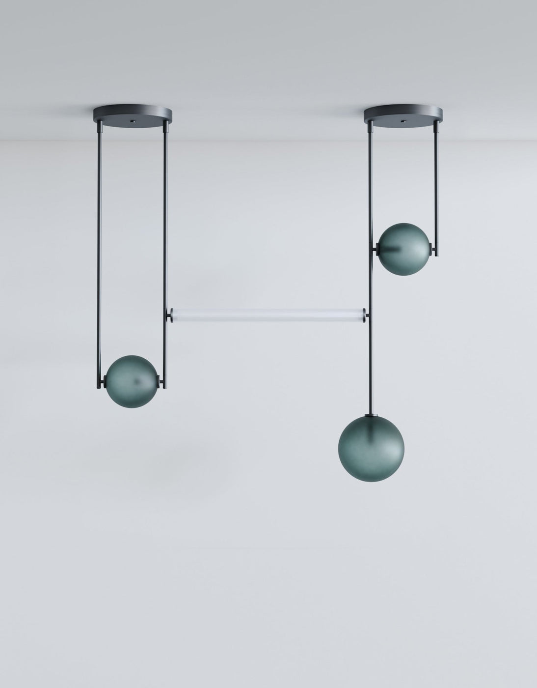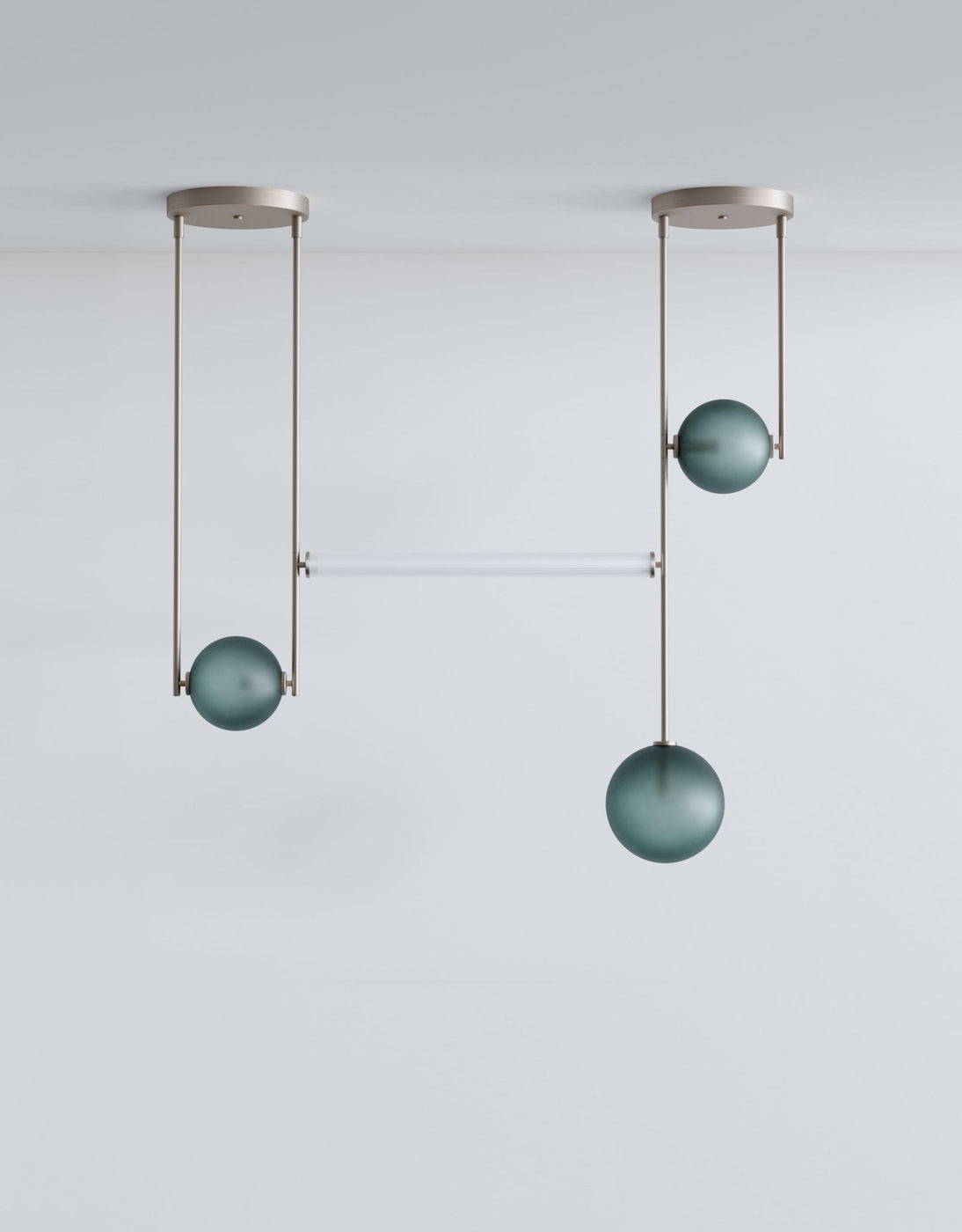 The L&G Equalizer 4 Piece Linear takes the original Equalizer concept and stretches it into a horizontal configuration that works over dining tables, kitchen islands, or long countertops. Instead of individual pendants, you get four glass globes suspended along anodized aluminum tubing that runs horizontally across your space. The setup mounts to two 12-inch round canopies on your ceiling, creating this clean linear installation that doesn't need a massive single junction box in the center. The linear tube connecting everything is frosted scalloped glass - always, not optional - which diffuses light along the whole length instead of just from the end globes. The whole thing gets sized to your specifications during ordering, so you're getting something that fits your actual table or counter length rather than making do with whatever standard size exists. The four globes each pump out 550 lumens at 2700K, giving you enough combined light for task work without feeling like you're under interrogation lamps. Same anodized aluminum finish options as the rest of the Equalizer line: Olive, Bronze, Black, or Gold for the hardware and canopy, with translucent glass globe choices in Smokey Green, Cream, Grey, Bronze, or Chameleon. The GY 6.35 bi-pin bulbs (5 watts, 24 volts, rated for 30,000 hours) come included, and dimming's standard so you can adjust brightness from full output when you're cooking to softer ambient light during meals. UL certification available on request, works with most international electrical systems, and the whole fixture's built to order with that 10-12 week lead time that comes with custom manufacturing. Ladies & Gentlemen Studio designed the Equalizer series back in 2016 with their collaborator John Hogan, and the 4-piece linear version extends that "playful austerity" approach to longer installations. Dylan Davis and Jean Lee's Brooklyn-based studio specializes in lighting that balances geometric precision with warmth - the rigid aluminum tubing paired with soft glass diffusion, industrial materials handled with craft-level attention. The linear configuration works particularly well over kitchen islands or dining tables where you need distributed light across length rather than concentrated downward from one point. Everything's customizable for materials, finishes, and sizing, so you're getting a fixture built specifically for your space rather than adapting your room to fit standard product dimensions.