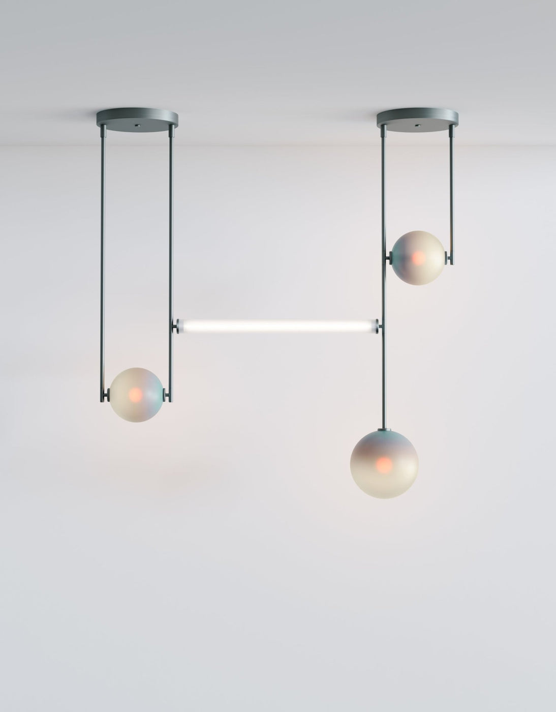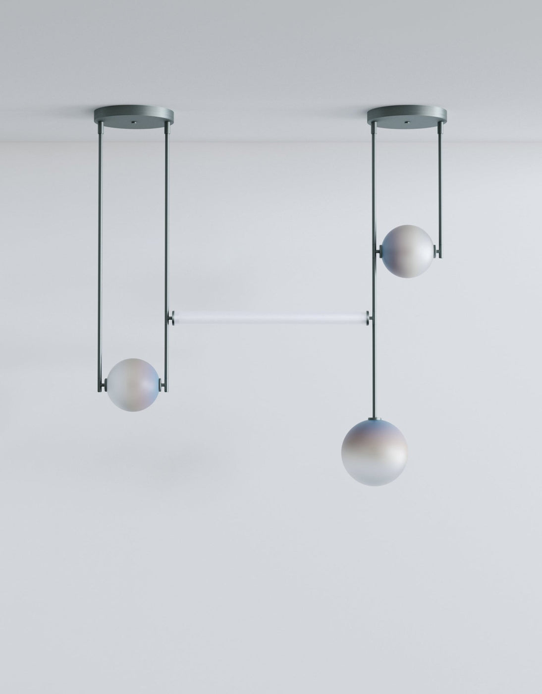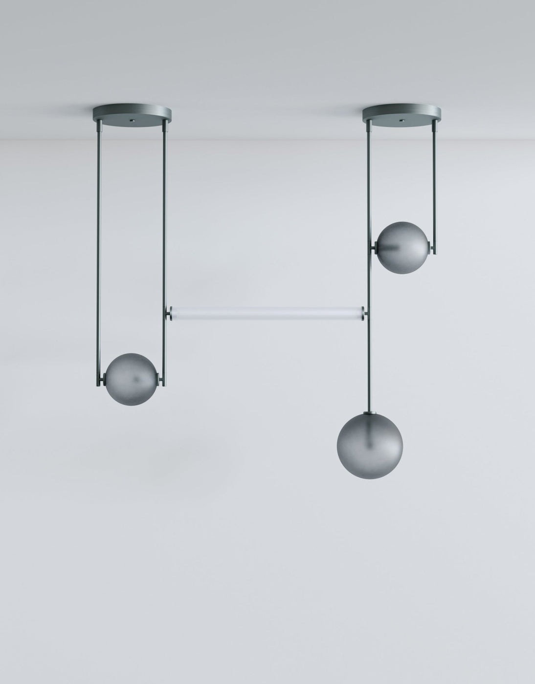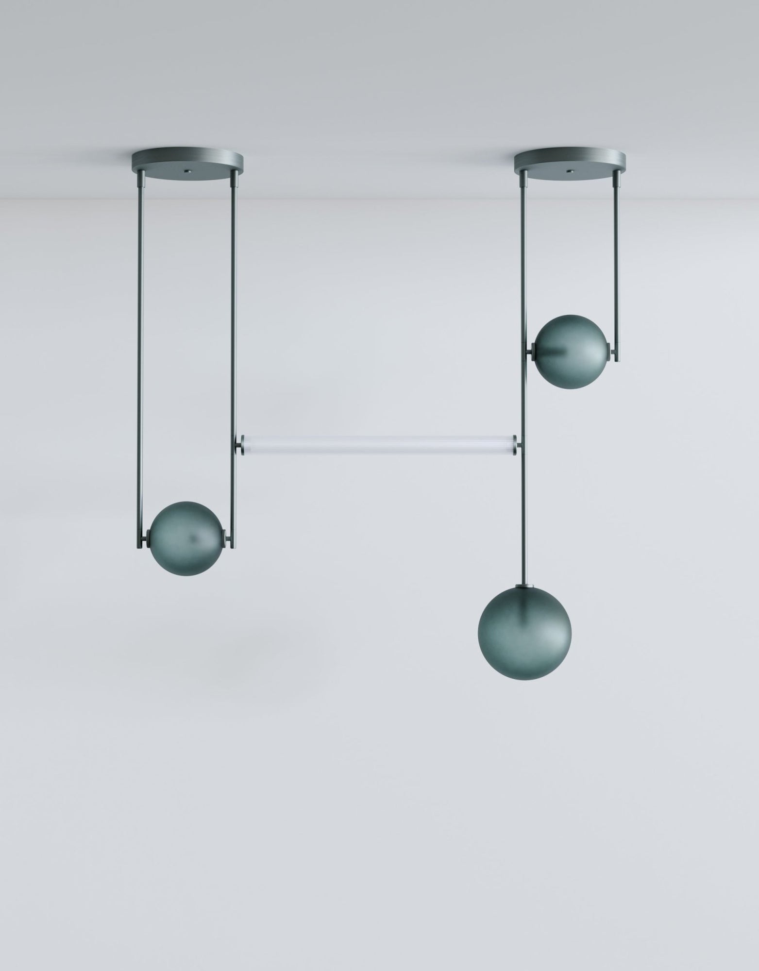 The L&G Equalizer 4 Piece Linear takes the original Equalizer concept and stretches it into a horizontal configuration that works over dining tables, kitchen islands, or long countertops. Instead of individual pendants, you get four glass globes suspended along anodized aluminum tubing that runs horizontally across your space. The setup mounts to two 12-inch round canopies on your ceiling, creating this clean linear installation that doesn't need a massive single junction box in the center. The linear tube connecting everything is frosted scalloped glass - always, not optional - which diffuses light along the whole length instead of just from the end globes. The whole thing gets sized to your specifications during ordering, so you're getting something that fits your actual table or counter length rather than making do with whatever standard size exists. The four globes each pump out 550 lumens at 2700K, giving you enough combined light for task work without feeling like you're under interrogation lamps. Same anodized aluminum finish options as the rest of the Equalizer line: Olive, Bronze, Black, or Gold for the hardware and canopy, with translucent glass globe choices in Smokey Green, Cream, Grey, Bronze, or Chameleon. The GY 6.35 bi-pin bulbs (5 watts, 24 volts, rated for 30,000 hours) come included, and dimming's standard so you can adjust brightness from full output when you're cooking to softer ambient light during meals. UL certification available on request, works with most international electrical systems, and the whole fixture's built to order with that 10-12 week lead time that comes with custom manufacturing. Ladies & Gentlemen Studio designed the Equalizer series back in 2016 with their collaborator John Hogan, and the 4-piece linear version extends that "playful austerity" approach to longer installations. Dylan Davis and Jean Lee's Brooklyn-based studio specializes in lighting that balances geometric precision with warmth - the rigid aluminum tubing paired with soft glass diffusion, industrial materials handled with craft-level attention. The linear configuration works particularly well over kitchen islands or dining tables where you need distributed light across length rather than concentrated downward from one point. Everything's customizable for materials, finishes, and sizing, so you're getting a fixture built specifically for your space rather than adapting your room to fit standard product dimensions.