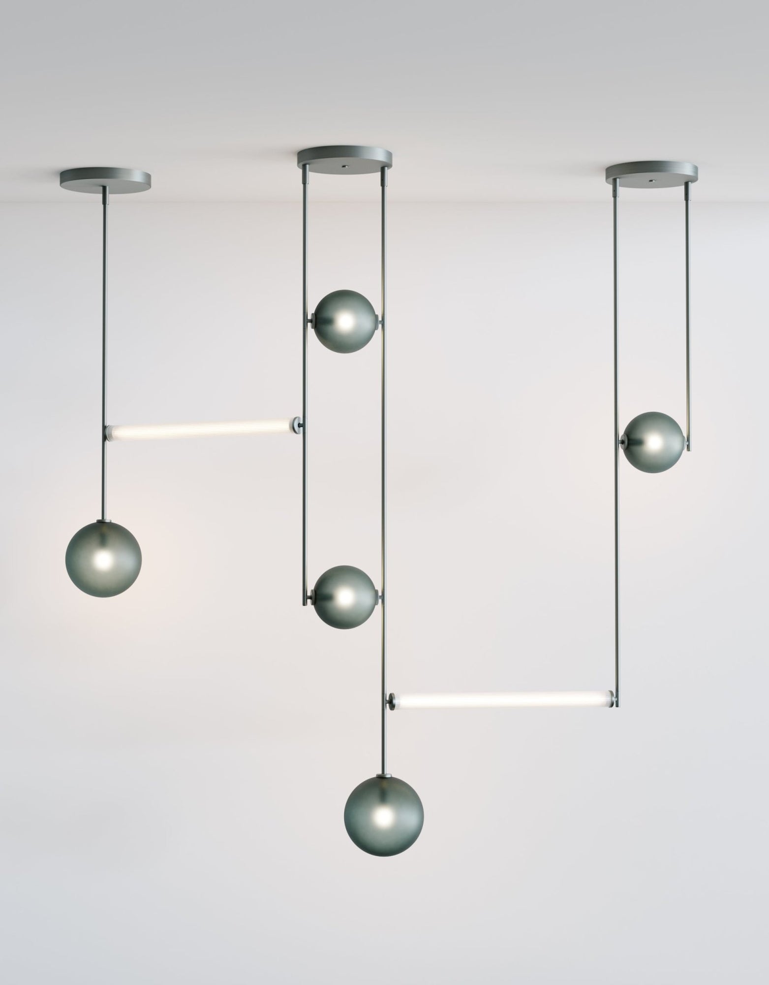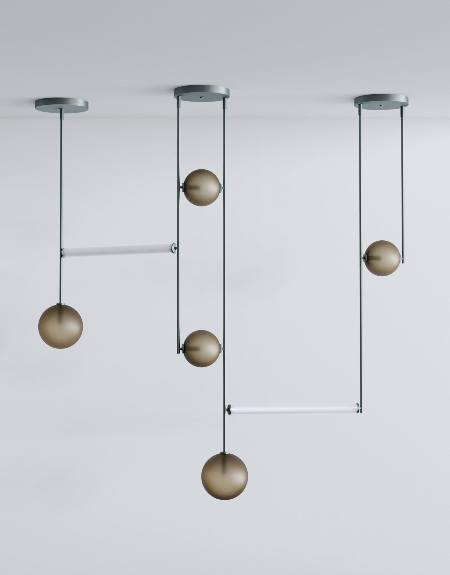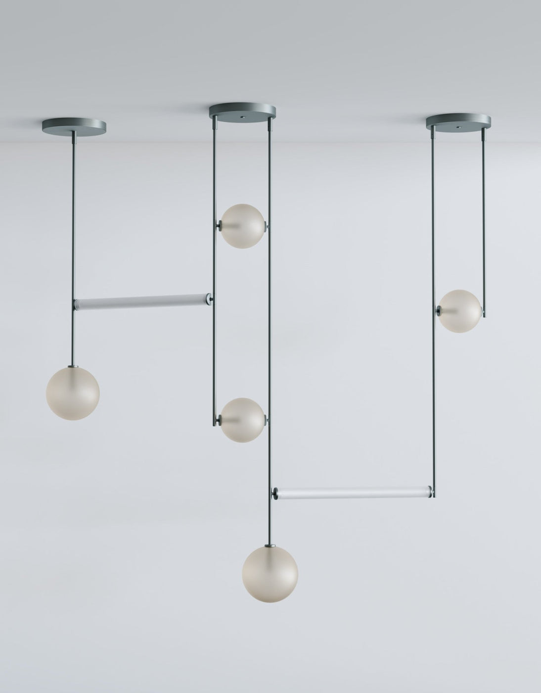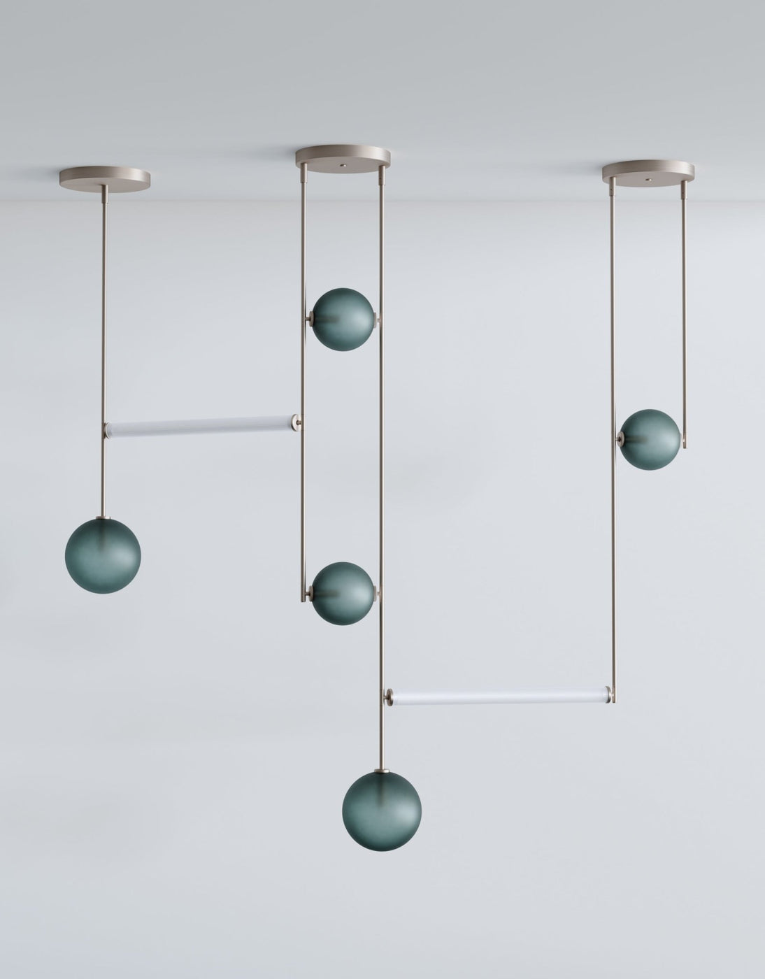 The L&G Equalizer Custom Screen throws out the pre-configured layouts and lets you work directly with the studio to build whatever arrangement your space actually needs. Instead of choosing between 2-piece, 4-piece linear, or radial configurations, this option creates custom compositions using multiple aluminum tubes and glass globes arranged however makes sense for your installation. Could be a vertical screen dividing a space, a cascading stairwell arrangement, an asymmetrical lobby statement, or whatever else your architect dreamed up that doesn't fit standard product templates. Uses multiple 12-inch round canopies positioned across your ceiling to support the structure, so you're not limited to hanging everything from one or two points. The frosted scalloped glass linear tubes (always included, not optional) create diffused glow along the connecting structure, while the glass globes at the ends provide 550 lumens each at 2700K. The integrated 12-volt LEDs in the linear tubes add ambient light beyond just the globe output. Same finish options as the rest of the Equalizer line: anodized aluminum in Olive, Bronze, Black, or Gold, paired with translucent glass globes in Smokey Green, Cream, Grey, Bronze, or Chameleon. All the GY 6.35 bi-pin bulbs come included, dimming's standard, works with most international electrical systems. UL certification available on request, but expect a 16-week lead time instead of the usual 10-12 since you're essentially commissioning a bespoke installation. Ladies & Gentlemen Studio's Custom Screen option shows how Dylan Davis and Jean Lee think about the Equalizer system as a toolkit rather than fixed products. Their Brooklyn studio specializes in working directly with architects, designers, and clients who need site-specific installations that standard configurations can't address - staircases with irregular dimensions, rooms with unusual ceiling heights, spaces requiring specific light distribution patterns. The custom approach means you're collaborating with the studio during the design phase to figure out tube lengths, globe positions, canopy placements, and overall composition before anything gets built. Everything's customizable for configuration, materials, and finishes, making this the option when you've got a specific vision that doesn't fit off-the-shelf solutions.