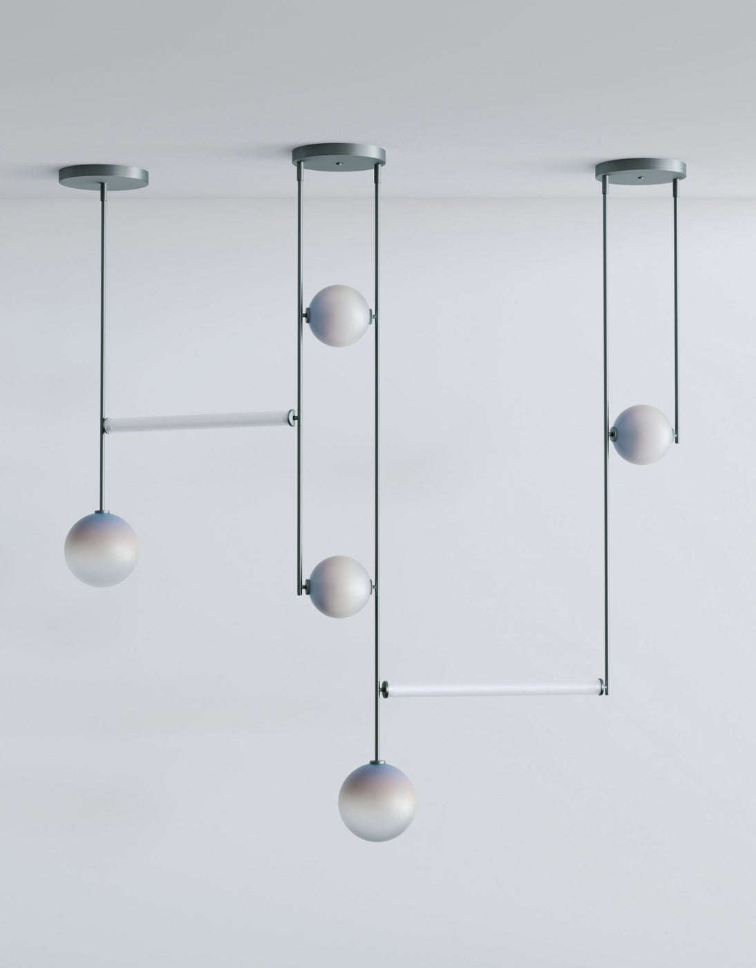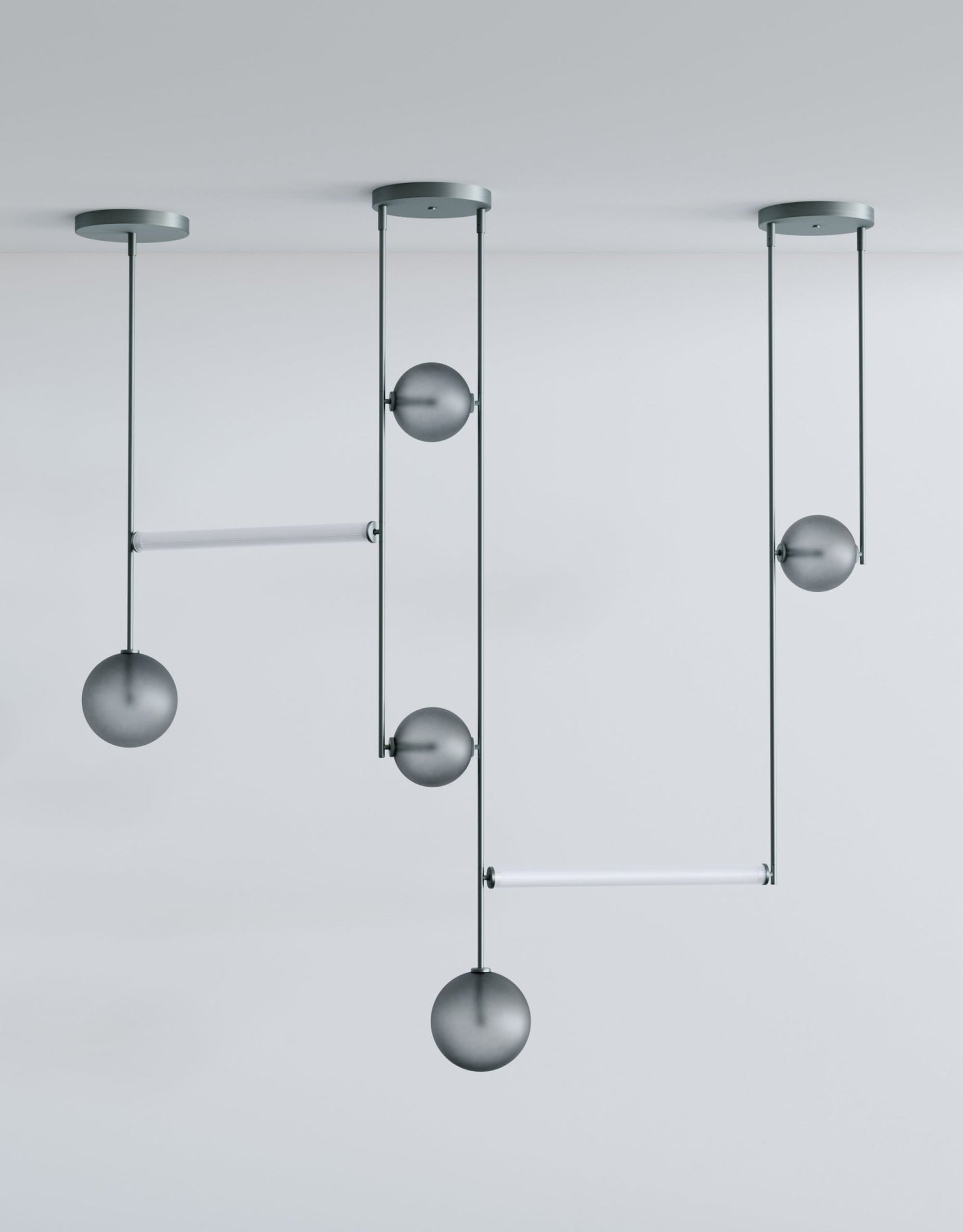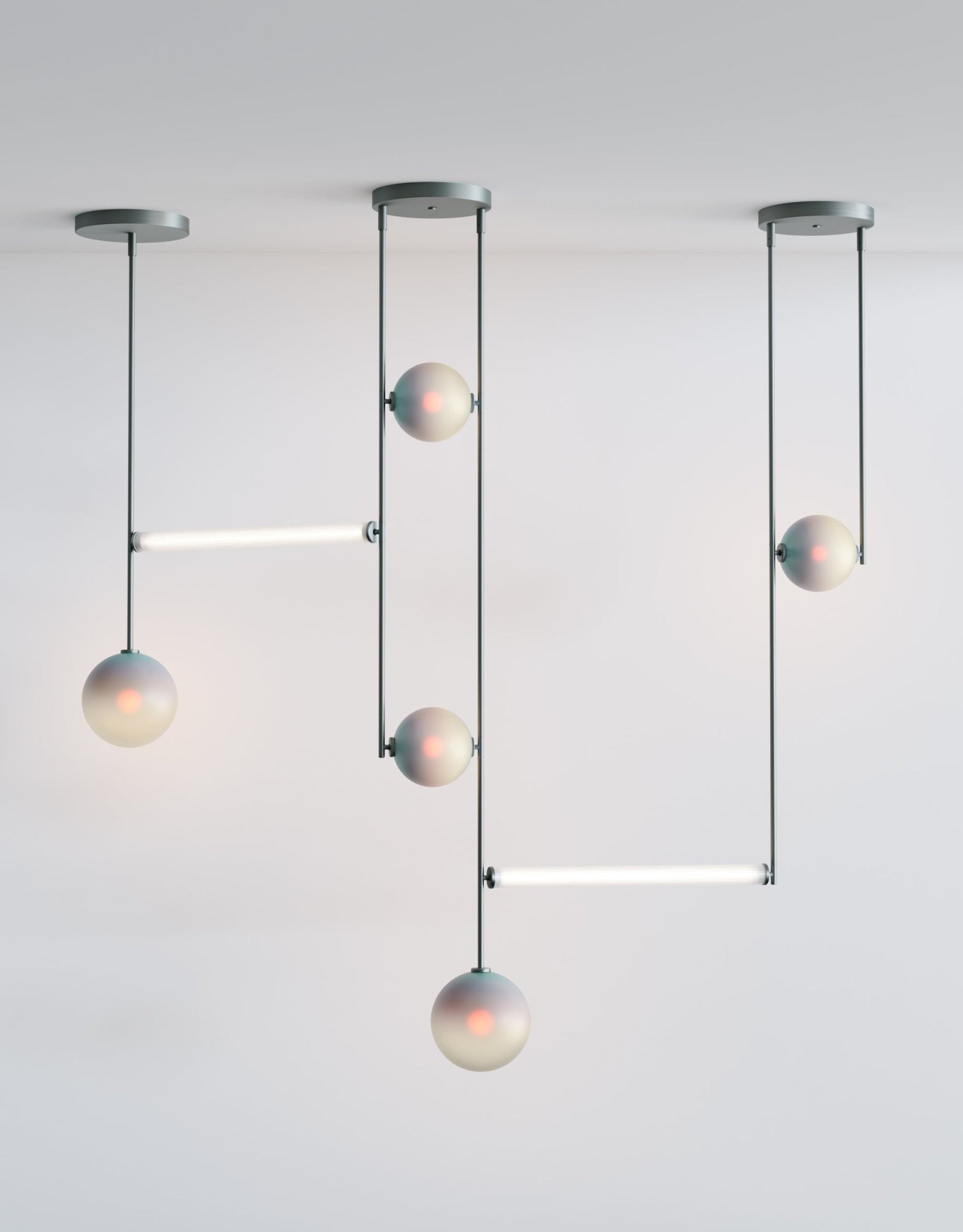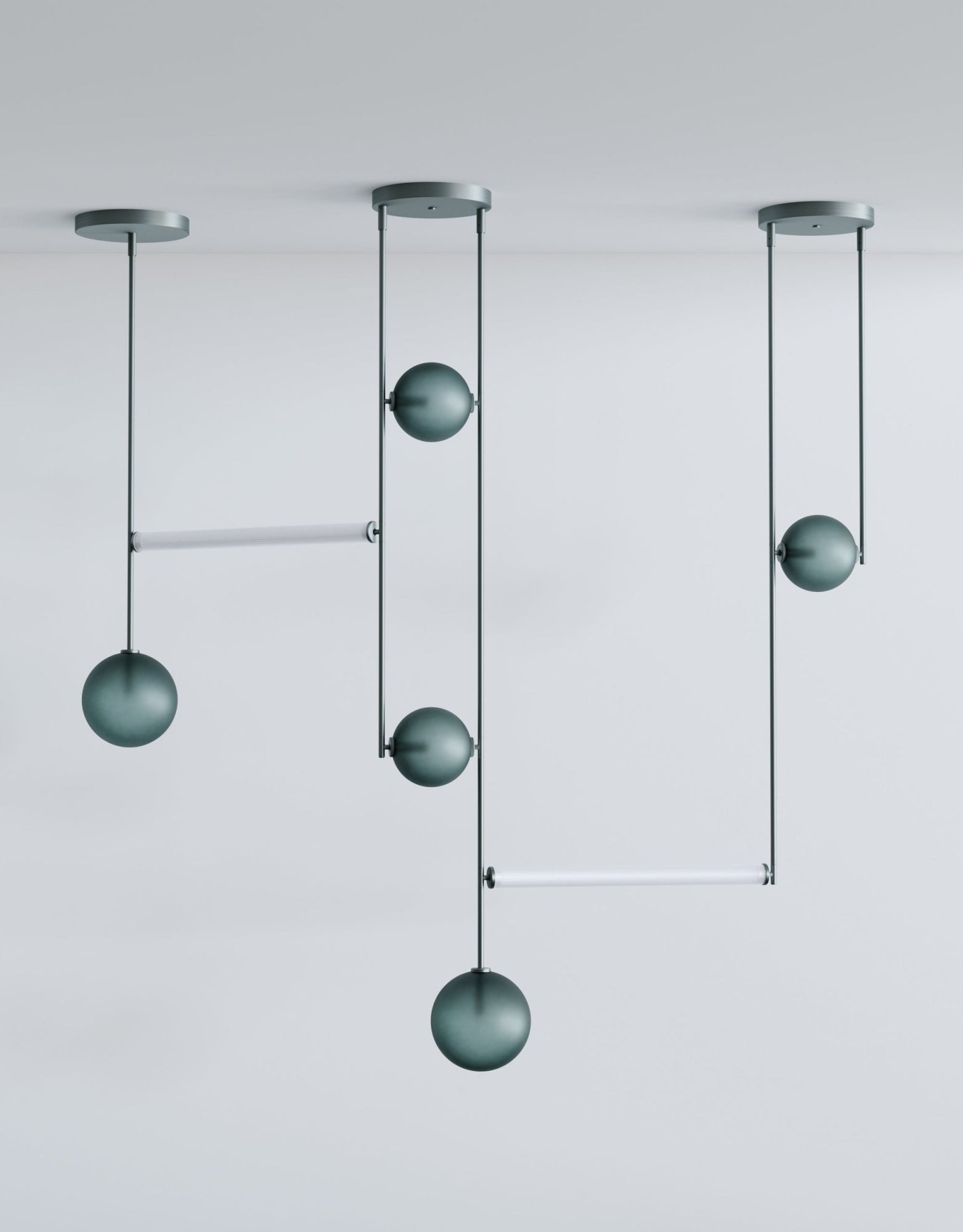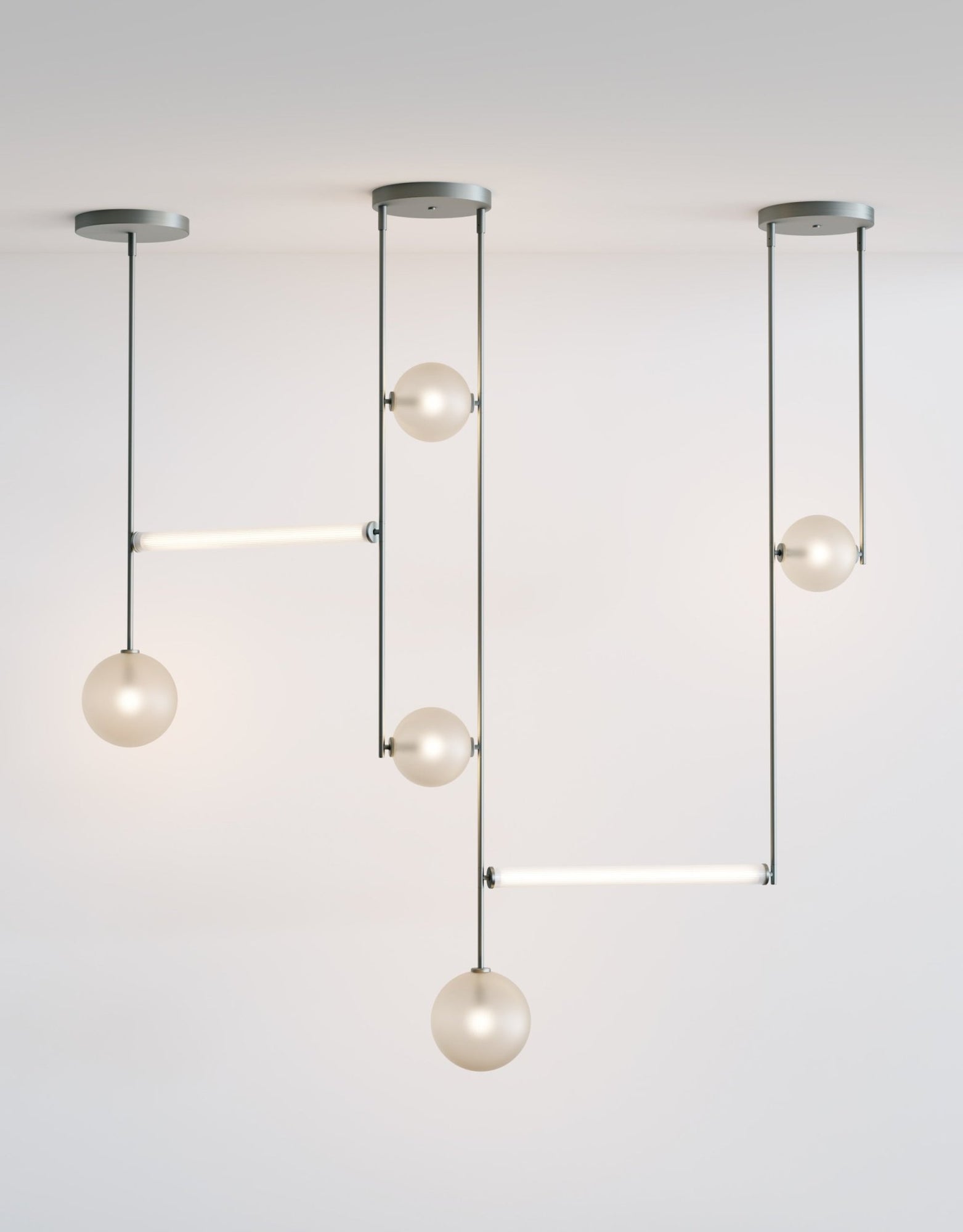 The L&G Equalizer Custom Screen throws out the pre-configured layouts and lets you work directly with the studio to build whatever arrangement your space actually needs. Instead of choosing between 2-piece, 4-piece linear, or radial configurations, this option creates custom compositions using multiple aluminum tubes and glass globes arranged however makes sense for your installation. Could be a vertical screen dividing a space, a cascading stairwell arrangement, an asymmetrical lobby statement, or whatever else your architect dreamed up that doesn't fit standard product templates. Uses multiple 12-inch round canopies positioned across your ceiling to support the structure, so you're not limited to hanging everything from one or two points. The frosted scalloped glass linear tubes (always included, not optional) create diffused glow along the connecting structure, while the glass globes at the ends provide 550 lumens each at 2700K. The integrated 12-volt LEDs in the linear tubes add ambient light beyond just the globe output. Same finish options as the rest of the Equalizer line: anodized aluminum in Olive, Bronze, Black, or Gold, paired with translucent glass globes in Smokey Green, Cream, Grey, Bronze, or Chameleon. All the GY 6.35 bi-pin bulbs come included, dimming's standard, works with most international electrical systems. UL certification available on request, but expect a 16-week lead time instead of the usual 10-12 since you're essentially commissioning a bespoke installation. Ladies & Gentlemen Studio's Custom Screen option shows how Dylan Davis and Jean Lee think about the Equalizer system as a toolkit rather than fixed products. Their Brooklyn studio specializes in working directly with architects, designers, and clients who need site-specific installations that standard configurations can't address - staircases with irregular dimensions, rooms with unusual ceiling heights, spaces requiring specific light distribution patterns. The custom approach means you're collaborating with the studio during the design phase to figure out tube lengths, globe positions, canopy placements, and overall composition before anything gets built. Everything's customizable for configuration, materials, and finishes, making this the option when you've got a specific vision that doesn't fit off-the-shelf solutions.
