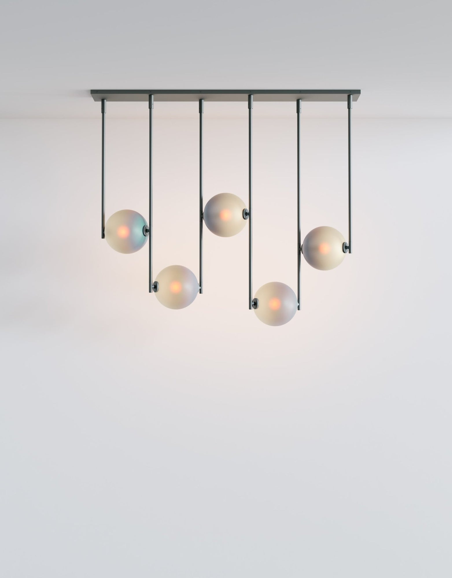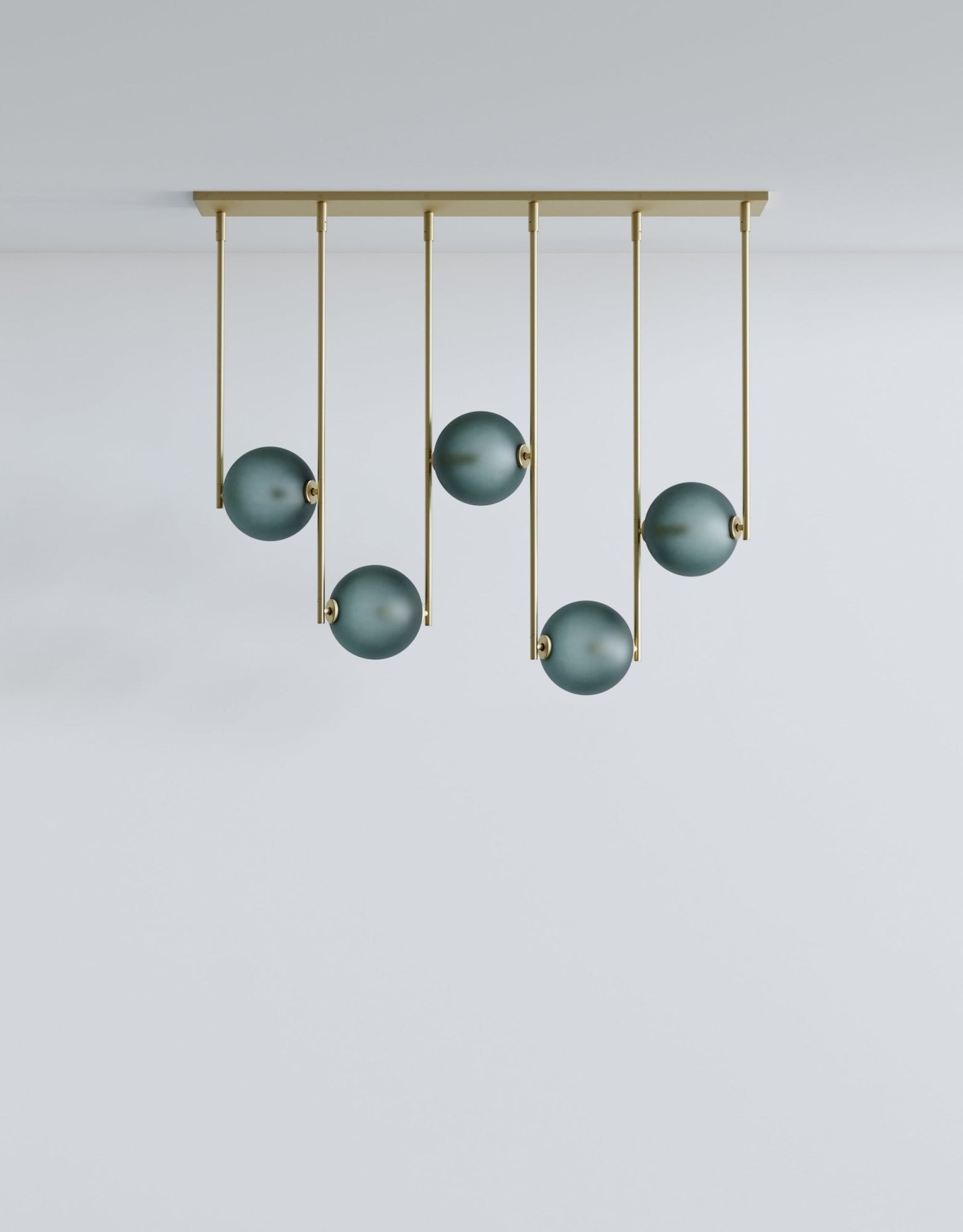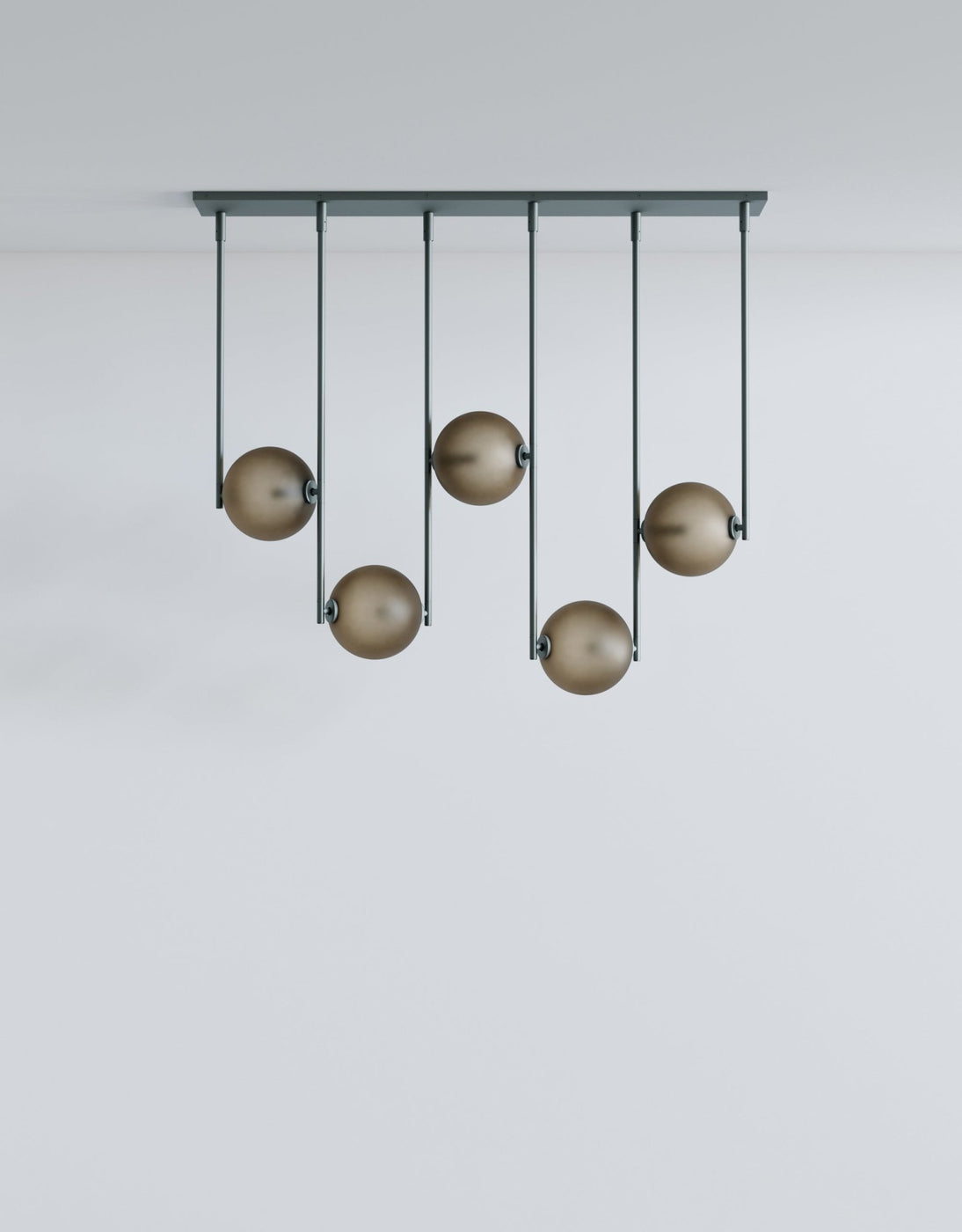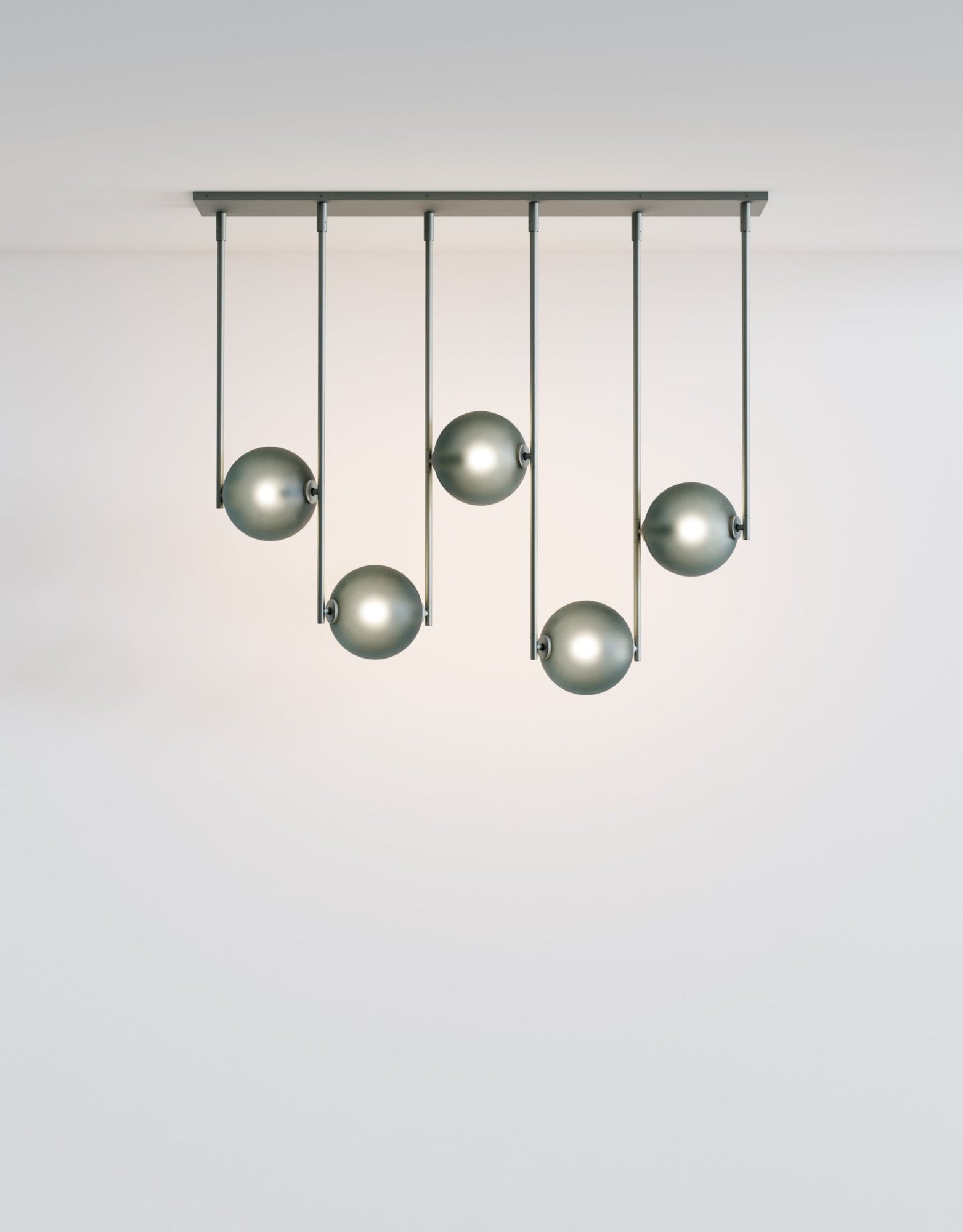 The L&G Equalizer 5 Piece Linear bumps up from four to five glass globes arranged horizontally along anodized aluminum tubing, giving you more coverage for longer dining tables, extended kitchen islands, or lobby desks. The setup mounts to a 48-inch by 10-inch rectangular canopy instead of round ones, creating this clean linear installation that spans about 48 inches total. The fifth globe adds more distributed light across the length, useful when you need illumination that reaches the full span of a large table without dark spots at the ends. Like the 4-piece version, this gets custom-sized to your specifications during ordering, so you're not stuck with whatever standard length the manufacturer decided on. Five globes at 550 lumens each (2700K) give you solid task lighting across a wider area - enough for cooking, working, or dining without harsh shadows. The anodized aluminum finishes stay consistent across the Equalizer line: Olive, Bronze, Black, or Gold for hardware and canopy, with translucent glass globes in Smokey Green, Cream, Grey, Bronze, or Chameleon. The GY 6.35 bi-pin bulbs (5 watts, 24 volts, rated for 30,000 hours) come included, dimming's standard, and the fixture works with most international electrical systems. UL certification available on request, and like all Equalizer pieces, this gets built to order with a 10-12 week lead time. Ladies & Gentlemen Studio's Equalizer collection keeps expanding with different configurations since the 2016 launch with John Hogan. Dylan Davis and Jean Lee's Brooklyn studio treats lighting as customizable systems rather than one-size-fits-all products - the 5-piece linear works for situations where four globes aren't quite enough coverage but a radial configuration doesn't fit your space layout. The extra globe spreads light more evenly across length, preventing those dark zones at table ends that happen with underlit fixtures. Everything's customizable for materials, finishes, and sizing, so you're working directly with the studio to build something that actually fits your specific installation requirements.