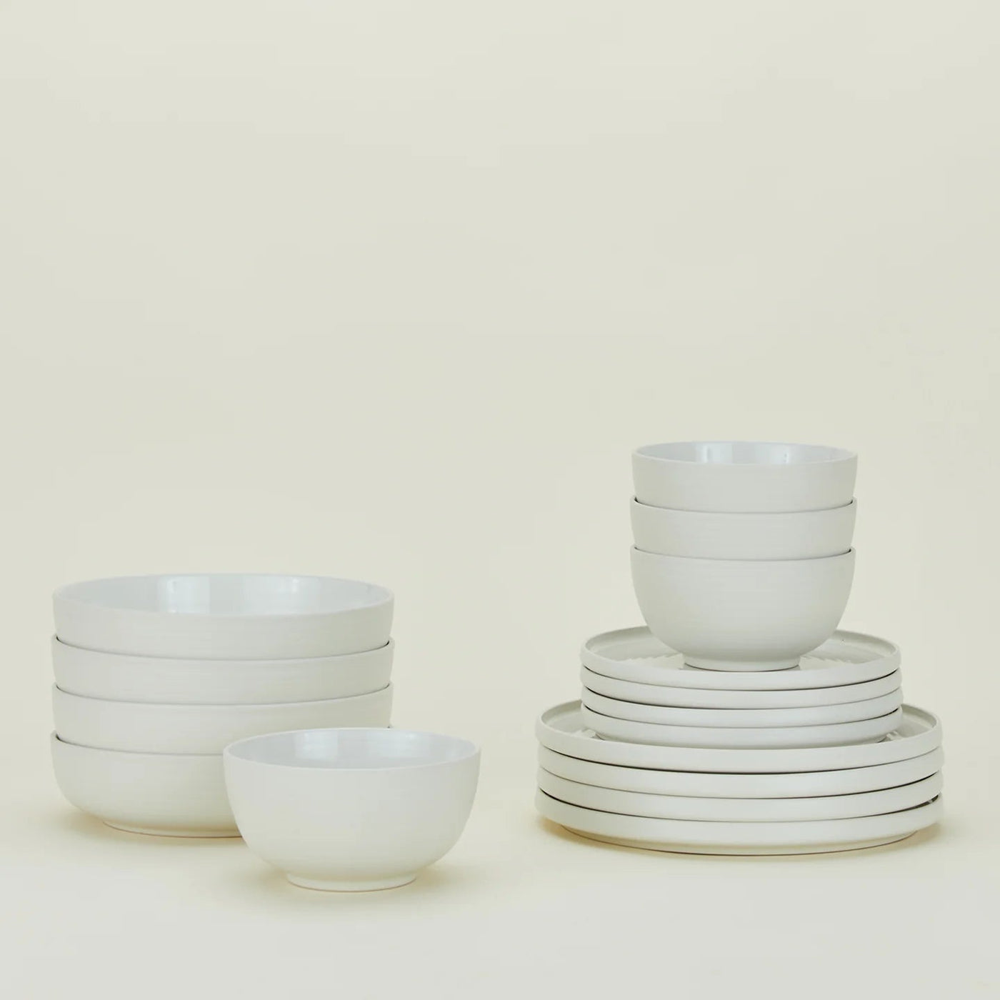 The Hawkins New York Essential Dinnerware - 16 Piece Set beautifully combines elegance and functionality. This set includes 4 large bowls, 4 low bowls, 4 salad plates, and 4 dinner plates, making it a versatile choice for any meal. Additionally, it comes in Bone and five other colors, so you can easily find a perfect match for your table setting. Part of the Essential Collection, this set features a soft ripple texture and a slight raised edge, creating a hand-thrown appearance. This design gives it a handmade feel without the high price tag, making it both affordable and stylish. Whether you're using it for casual dinners or special gatherings, it suits any occasion. Moreover, the Hawkins New York Essential Dinnerware - 16 Piece Set is made from durable stoneware and is dishwasher, microwave, and oven safe up to 450 degrees. However, avoid placing it in extreme temperature changes, such as putting a hot plate on a cold surface. For any minor scratches, you can use Bar Keeper’s Friend along with a Lurex Sponge to keep your dinnerware looking pristine. The Hawkins New York Essential Dinnerware - 16 Piece Set is a practical and elegant addition to your home. It offers lasting durability, ease of care, and timeless design, making it an essential for any household. Hawkins New York's design ethic centers on creating homewares that are both intentional and unexpected, focusing on the intersection of form and function. By collaborating with artisans worldwide, Hawkins New York ensures each piece is unique and thoughtfully crafted, blending seamlessly into daily life with subtle grace. This approach emphasizes quality and timelessness over trendiness, resulting in products that are both aesthetically pleasing and practical. Pair it with the Hawkins New York Essential Cotton Placemat Set.