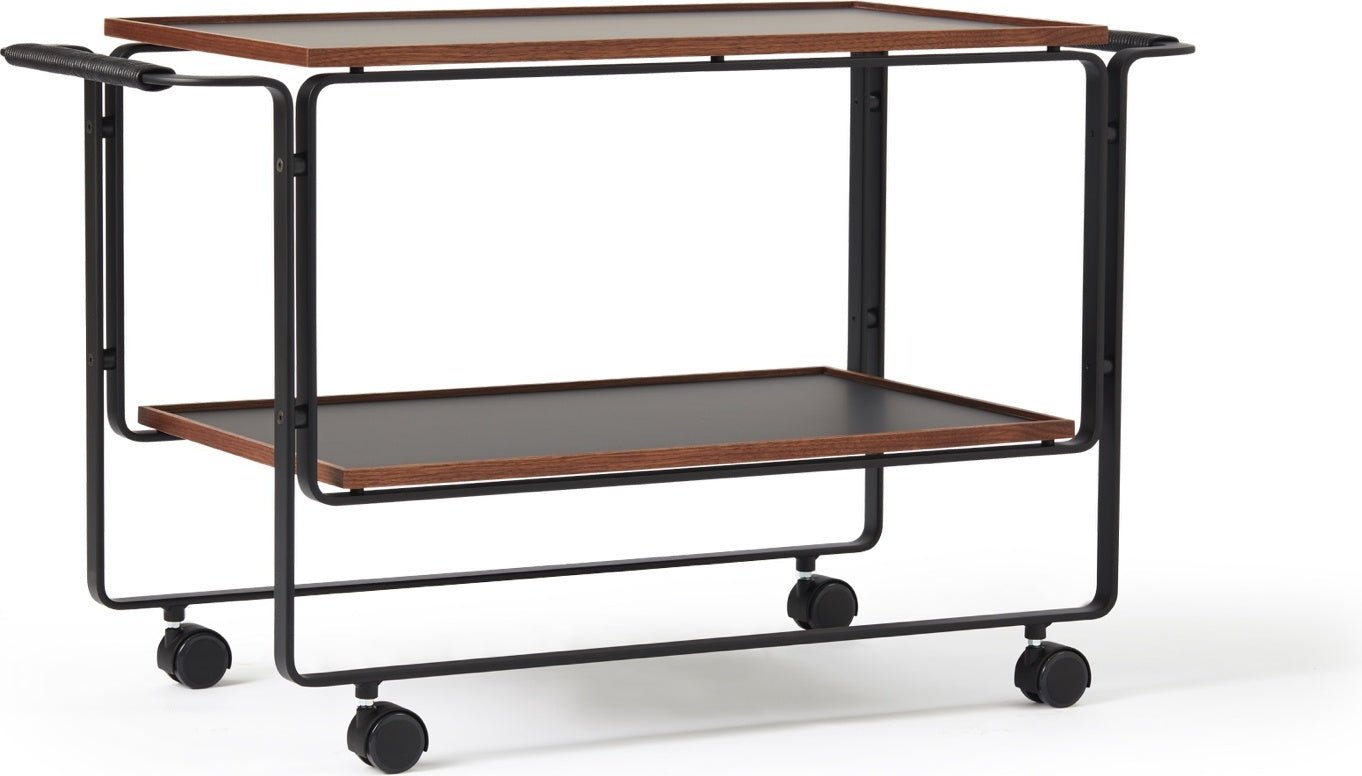 The Lange Production HB 128 Bar Cart brings clean structure and functional elegance into any space. Designed by Horst Brüning in the late 1960s, it features a sleek steel frame, two wooden trays, and a leather-wrapped handle. Its refined materials and minimalist form make the HB 128 Bar Cart perfect for hosting or displaying barware. Whether in use or at rest, it adds sculptural presence to your home. Because of its understated profile, the HB 128 Bar Cart fits easily into both classic and modern interiors. Style it near a credenza, next to a media console, or under warm ceiling lights. It's ideal for showcasing a carafe, a set of champagne glasses, or your favorite spirits. This versatile piece also works beautifully in Scandinavian furniture collections where thoughtful design meets everyday practicality. Lange Production builds each HB 128 Bar Cart in Denmark using authentic 1960s tools. The company values lasting quality over trends. Through their dedication to heritage, Lange Production preserves iconic Danish design while offering heirloom-worthy furniture for the modern home. Every detail reflects their commitment to craftsmanship and timeless Scandinavian sensibility. Details