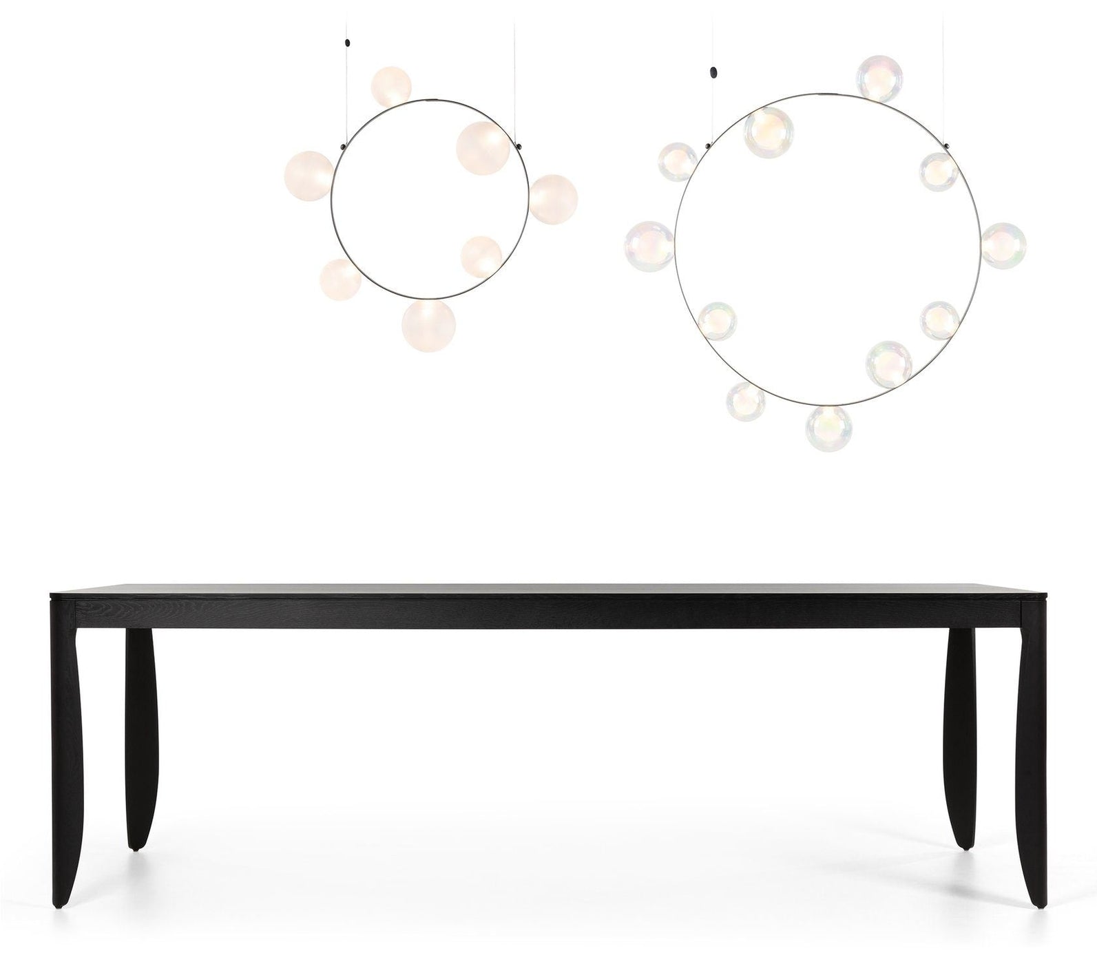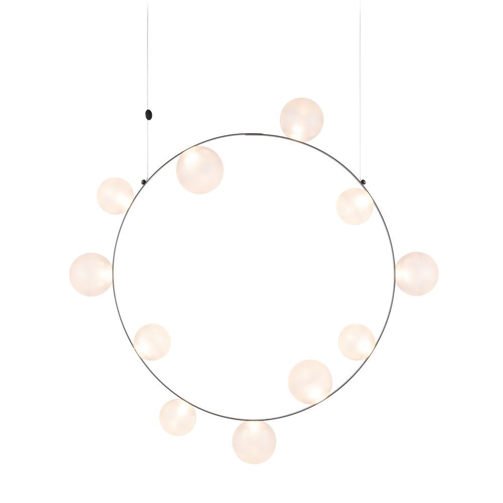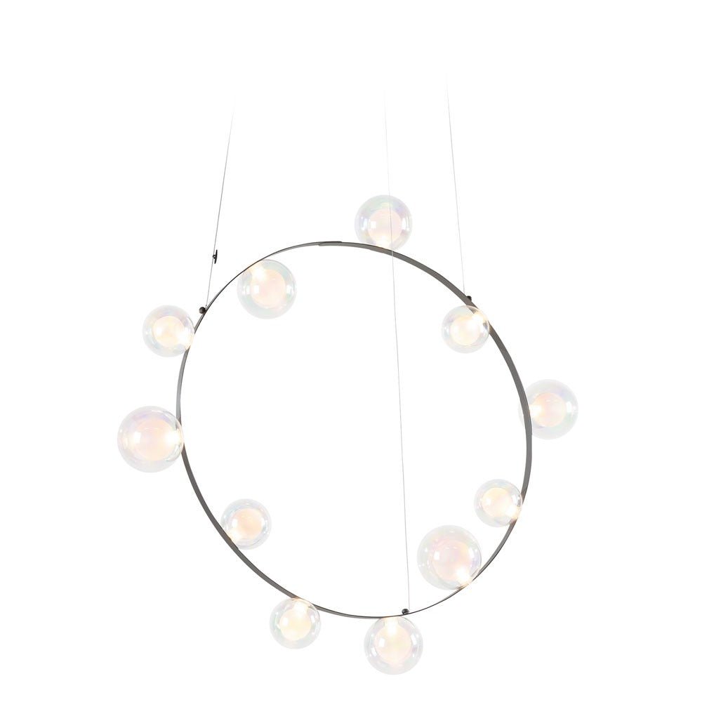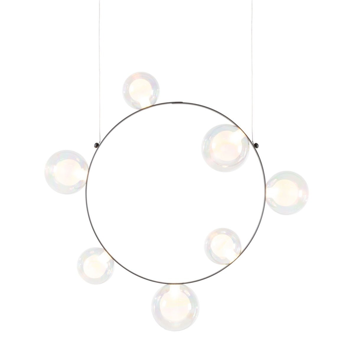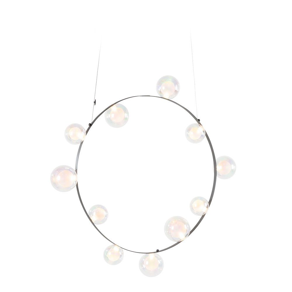 The Moooi Hubble Bubble captures that pure childhood magic of chasing soap bubbles across a summer lawn, but transforms it into seriously sophisticated lighting that somehow never loses its sense of wonder. Marcel Wanders designed this enchanting pendant back in 2020, creating these gorgeous hand-blown glass spheres that seem to float effortlessly around a slim metal ring - available with either 7 or 11 bubbles depending on how dramatic you want to go. The glass comes in your choice of oil-iridescent finish that creates these amazing rainbow reflections, or frosted for a softer, more diffused glow. What's absolutely brilliant is how those bubbles get their power - through Moooi's proprietary Electrosandwich® technology that runs electricity through the frame itself, so there are no visible wires disrupting those clean, magical lines. At about 2.3 feet across for the smaller version and over 3 feet for the larger, it creates this incredible presence without feeling heavy or overwhelming. What makes the Hubble Bubble genuinely versatile is how you can hang it at literally any angle you want - horizontal for a more traditional look, vertical for drama, or somewhere in between for that perfect custom composition. The integrated LEDs provide beautiful ambient lighting that's perfect for dining rooms, living spaces, or anywhere you want to create atmosphere, and the dimming capabilities mean you can dial in exactly the right mood for any occasion. You can even hang multiple Hubble Bubbles together at different heights and angles to create these amazing installations that look like bubbles floating through space. Despite the whimsical concept, the engineering is incredibly refined - that Electrosandwich technology keeps everything clean and minimal while delivering reliable illumination that actually works for daily life, not just special occasions. Moooi continues to pioneer breakthrough technologies like Electrosandwich while working with visionary designers who understand that exceptional lighting should spark joy and wonder in everyday moments. Founded by Marcel Wanders and Casper Vissers, the Dutch company has built its reputation on pieces that blend cutting-edge innovation with deeply human experiences and emotions. The Hubble Bubble perfectly embodies Moooi's philosophy of creating objects that tell stories and evoke memories while serving practical needs in contemporary homes. Along with their groundbreaking furniture, accessories, and other lighting innovations, Moooi provides a platform for designers who approach their craft as both technical achievement and cultural expression, helping you build spaces that feel both sophisticated and genuinely playful.