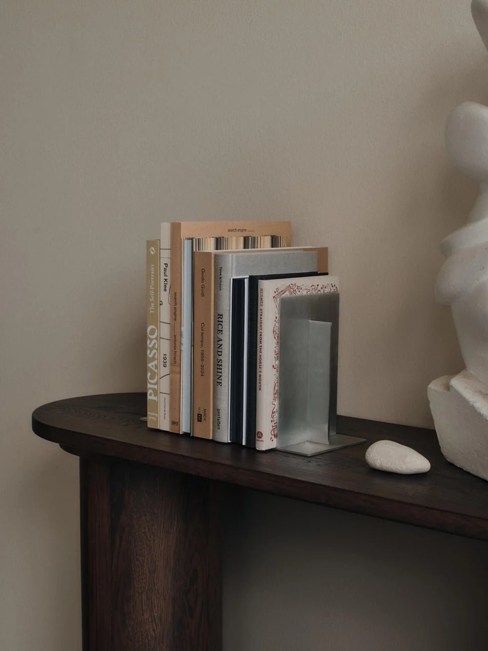 The Ferm Living Lager Bookends blend industrial sophistication with geometric precision through their striking brushed aluminum construction, creating functional sculpture that transforms everyday book organization into an elegant design statement. This isn't just another set of bookends - the Lager represents Ferm Living's mastery of the 90-degree L-profile design, where wide foot sections slide seamlessly beneath your first books while tall fins meet the spines to create an unwavering support system that handles even the heaviest hardcovers with confidence. The clean, geometric silhouette adds architectural presence to any shelf while the brushed surface softens light reflection and conceals fingerprints for lasting beauty. Whether positioned on open shelving in your living room, organizing reference books on your desk, or styling your bedside table collection, the Lager bookends deliver both practical organization and sculptural elegance that enhances your space's modern aesthetic. These bookends demonstrate the thoughtful engineering that defines contemporary Scandinavian design excellence. Each piece weighs 0.8 kilograms, providing the substantial heft needed to anchor book collections without sliding or toppling, while the low, solid profile ensures visual calm rather than clunky interference with your book display. The brushed aluminum finish creates subtle texture that feels both industrial and refined, complementing everything from minimalist interiors to more eclectic styling approaches. When shelves are only half-full, these bookends read like small architectural elements rather than purely functional objects, making them perfect for styling vintage record collections, art books, or any curated display where form matters as much as function. The set of two provides versatility for multiple shelves or creating symmetrical arrangements that bring order and visual coherence to your home library. Ferm Living, based in Copenhagen, designs with balance, simplicity, and soul through their commitment to creating accessories that enhance daily living while respecting the principles of authentic Scandinavian design. The Lager Bookends reflect the brand's passion for finding beauty in utilitarian objects, transforming necessary items into sculptural elements that contribute to your space's overall design narrative. Not only do they create exceptional organizational tools, but they also offer furniture, lighting, textiles, and storage solutions all designed with the same attention to geometric form and material integrity. Through brushed aluminum construction, substantial weight distribution, and that distinctly Danish approach to balancing industrial materials with refined proportions, Ferm Living helps you build spaces that feel personal, warm, and deeply considered while bringing structure and quiet strength to your everyday surroundings through objects that work as hard as they look good.