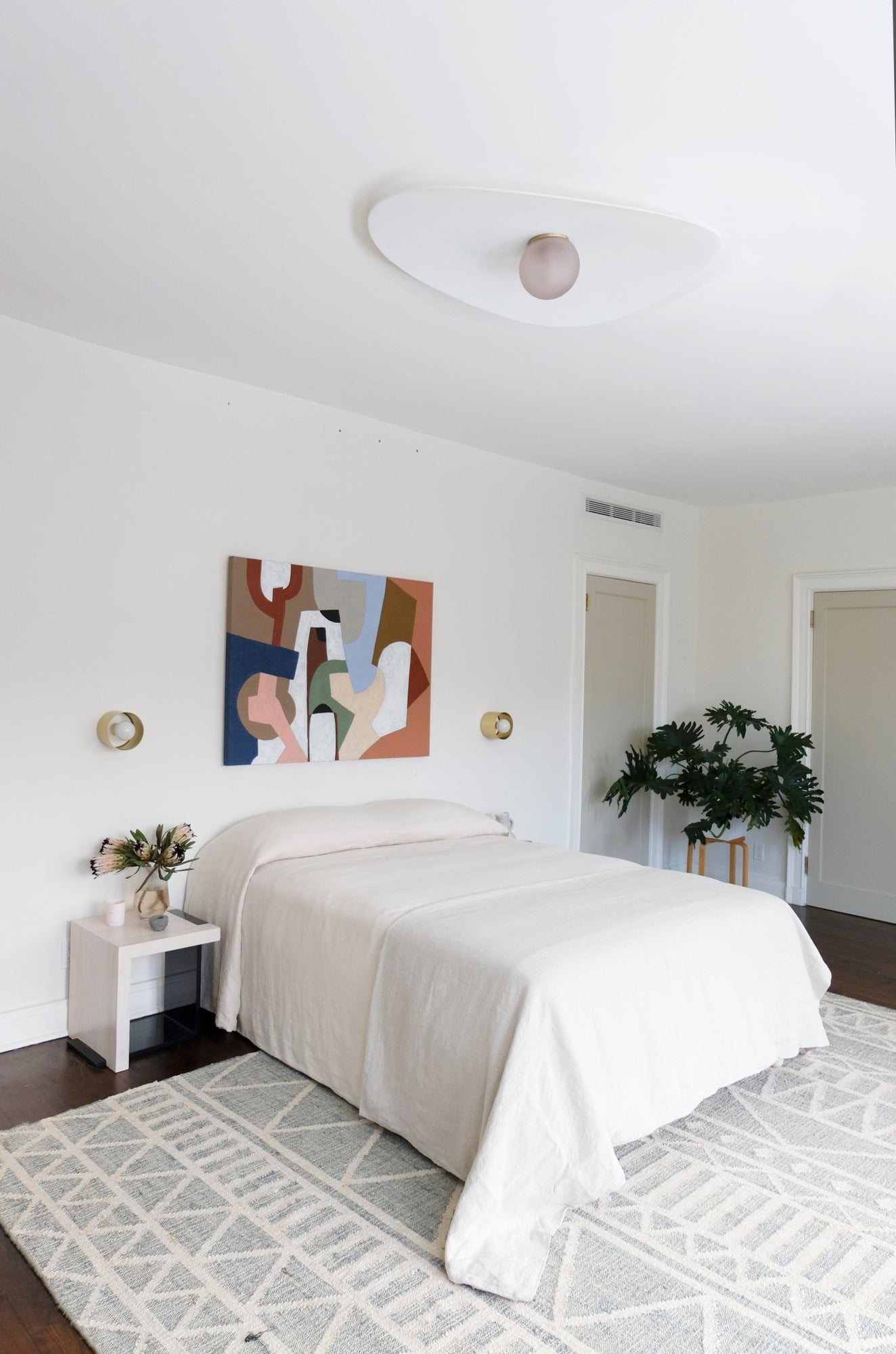 The L&G Myrna Surface Mount solves a problem a lot of people don't even realize they have until they see it - how do you get interesting lighting in rooms with low ceilings or where pendants just don't work? This flush mount version keeps that sculptural Myrna aesthetic but sits tight against the ceiling instead of hanging down. You still get the layered lighting from the shade and globe working together, just oriented horizontally so it creates this linear presence across your ceiling. Works great in hallways where pendants would be a head-bumping disaster, or entryways where you want something more interesting than those generic dome fixtures that come standard. The three sizes mean you're not stuck trying to make one proportion work everywhere - small for powder rooms and closets, medium for bedrooms, large for living rooms or lobbies where the ceiling needs some personality. Here's where it gets fun: the customization options are kind of ridiculous in the best way. You're not picking from three finishes and calling it done. Brushed brass if you want that warm traditional look, blackened brass if you're going for something moodier that'll develop character over time. Shades range from basic opaque white (which honestly looks anything but basic when the light's on) to perforated options that throw these cool shadow patterns across your ceiling. Then there's the specialty stuff - brass or stainless steel brushstroke finishes that catch light differently throughout the day, marbled glass globes, glacier glass, amber glass. You can genuinely dial in exactly the light quality and vibe you want. Takes standard E26 bulbs up to 25 watts, needs to be hardwired with a wall dimmer. The whole thing weighs 7 pounds, so installation isn't some major structural project. L&G is a Brooklyn-based studio that treats lighting more like sculpture that happens to light up your space. They're not churning out variations on the same basic fixture - each piece feels like someone actually thought about how light moves through a room and how hardware ages and how different materials work together. The Myrna collection in particular shows that approach - it's not trying to be everything to everyone, just really excellent at what it does.