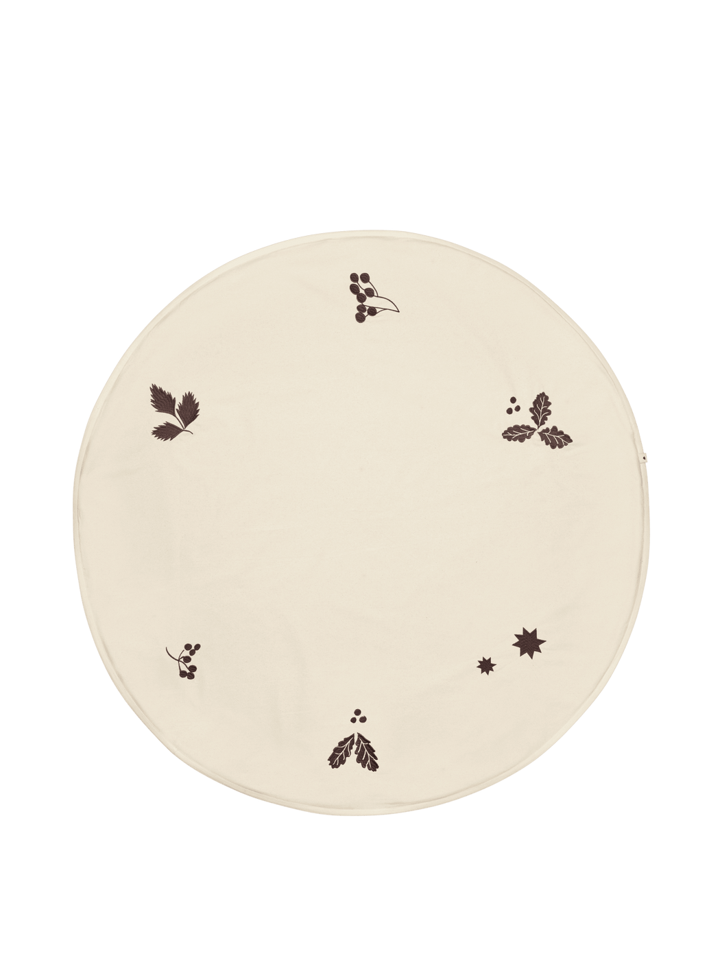 Crafted from 100% GOTS-certified organic cotton, the Oak Christmas Tree Blanket features dense machine embroidery in a rich, tactile finish. Oak leaves, berries and stars in a deep, dark chocolate tone are delicately scattered along the outer edge, creating a striking contrast against the neutral base. Expertly finished with a cotton hem, its generous circular shape suits a wide range of tree sizes with effortless elegance.