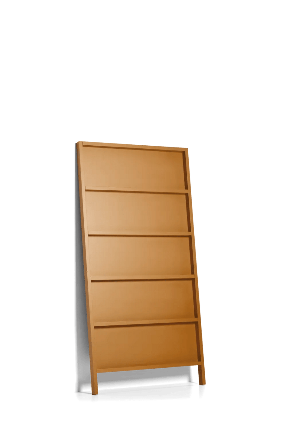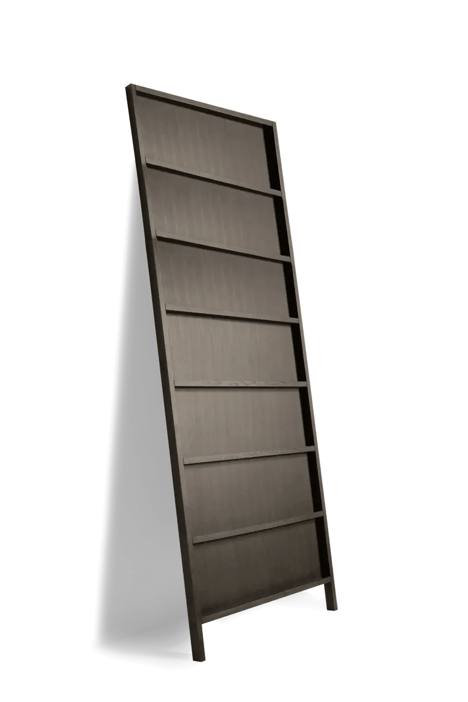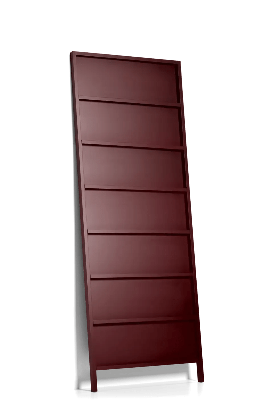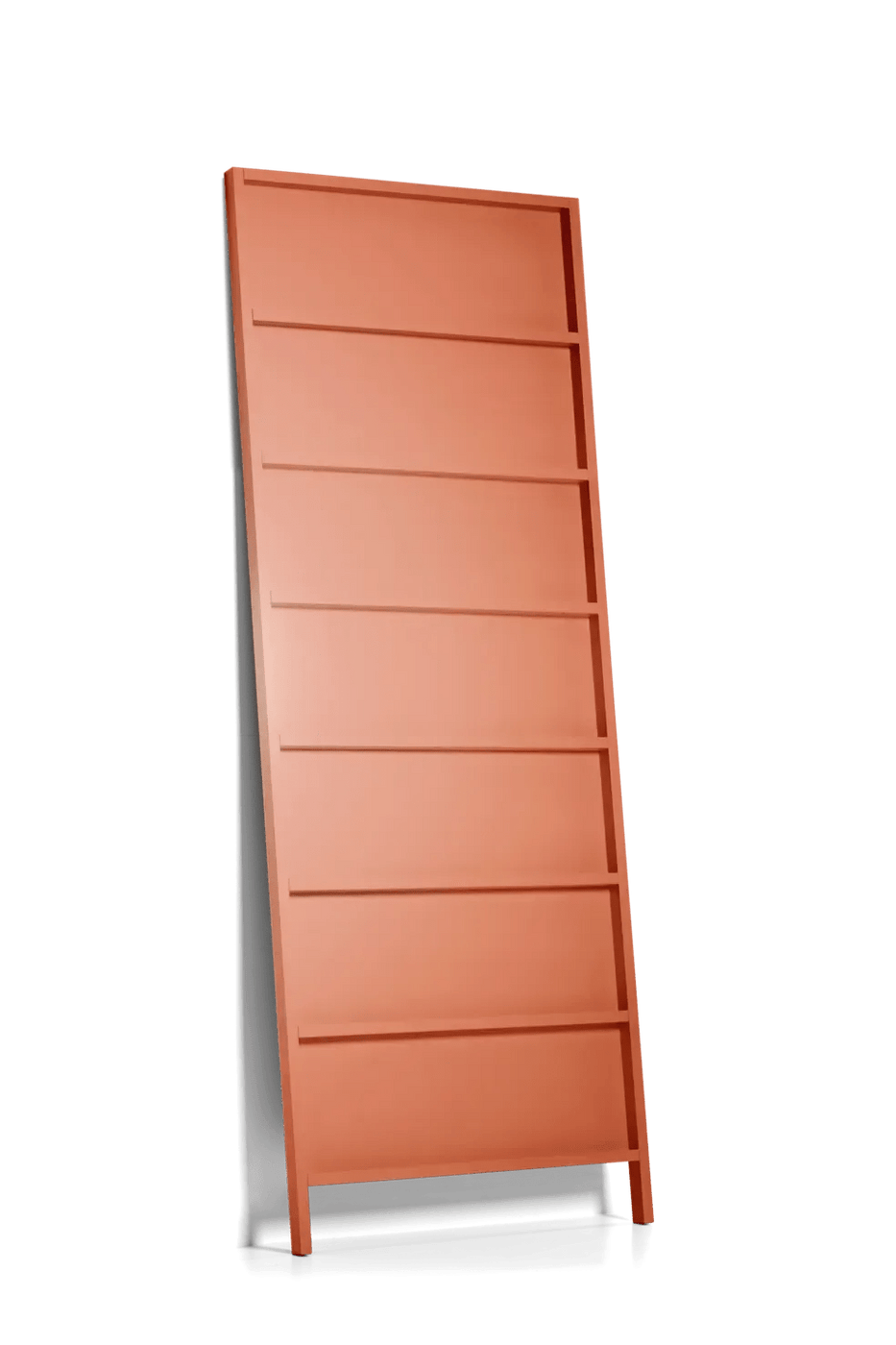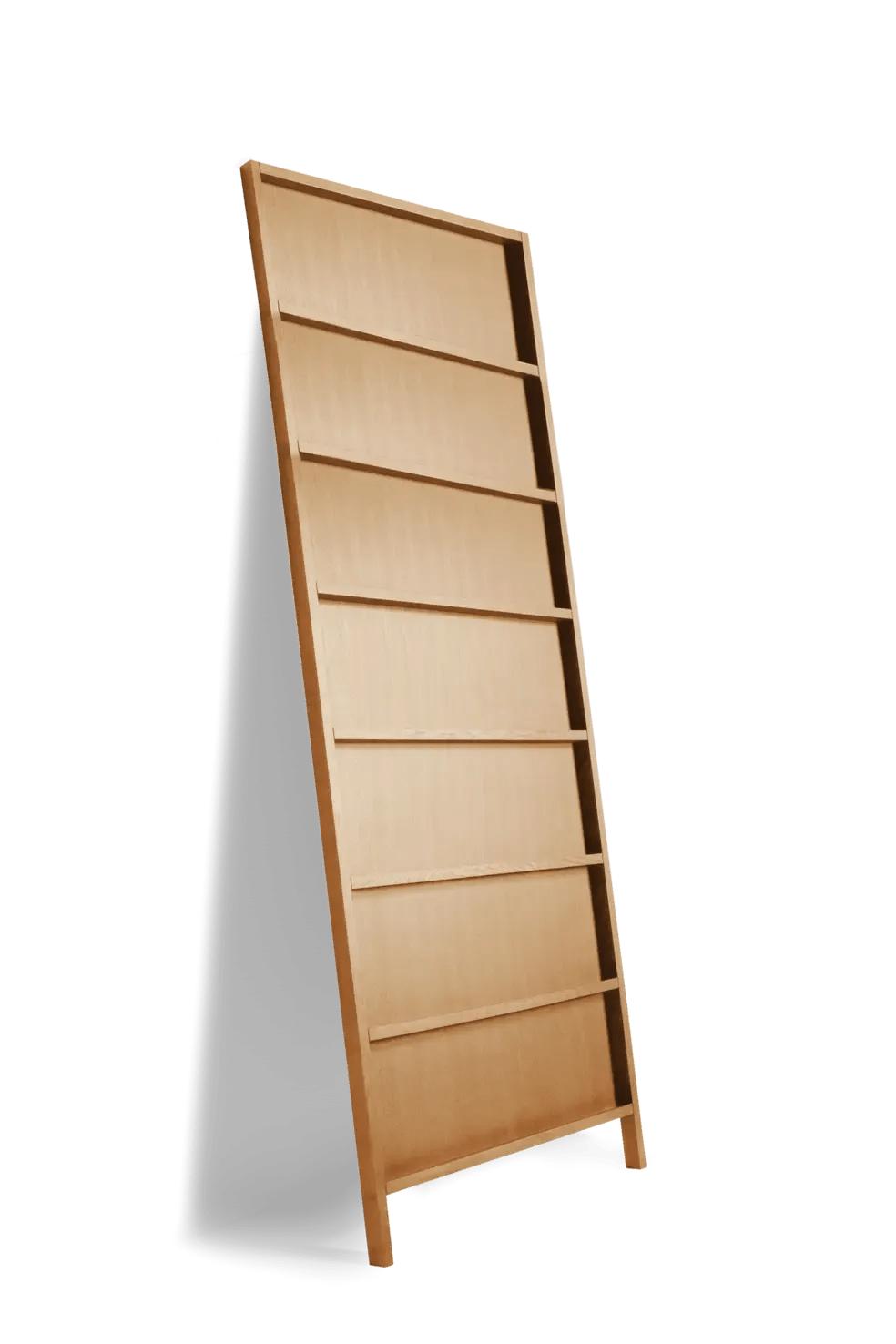 The Moooi Oblique is Marcel Wanders' solution to the problem of bookshelves taking up too much floor space - he just leaned the whole thing against the wall at an angle and called it done. Designed back in 2002, it's essentially a tall, narrow ladder-style shelf that props against your wall instead of mounting to it, which sounds precarious but works because of how the weight distribution and angle play out. The super-shallow 2.4-inch depth means this isn't for storing your hardcover collection, but it's perfect for displaying magazines, photo books, framed pictures, or creating what Wanders calls "the mood board of your lifestyle." The raised edge along each shelf stops everything from sliding off when the shelf leans back, which matters more than you'd think once you start loading it up with stuff. You can get it in solid oak with various stains or lacquered beech in a bunch of RAL colors including this traffic white, and the small version stands about 82 inches tall while the big one goes up to 112 inches. What makes the Oblique more practical than regular wall-mounted shelves is how you can move it around without drilling new holes or patching walls when you rearrange. The angled position creates this interesting visual break in a room - it's clearly a shelf but doesn't read as traditional furniture lined up parallel to everything else. You do need to position it correctly though - Moooi recommends placing the feet at a distance from the wall that's one-fifth the height of the unit, so the small one needs about 16 inches of clearance and the big one needs roughly 22 inches. The construction quality shows in how stable it feels despite just leaning there, and the solid wood material gives it enough weight that it's not going to tip over if you bump it. The narrow profile works well in hallways, behind doors, or in corners where a full-depth bookcase would block traffic flow. The lacquered beech version shows color really well if you go bold, while the oak options let the wood grain show through for a more natural look. Moooi's been Marcel Wanders' main platform since he co-founded it in 2001, and the Oblique was one of the brand's early designs that helped establish their approach of reimagining everyday objects. Wanders became famous for his Knotted Chair in the '90s and has been pushing conventional furniture design sideways ever since - he's Moooi's creative director and co-owner, so the brand reflects his philosophy pretty directly. His work tends to take familiar furniture types and shift them just enough that they feel fresh without being unusable, which is what the Oblique does with standard shelving. Made in the Netherlands with Dutch manufacturing standards, so you're getting solid construction instead of particle board that'll sag after six months. The design has stuck around for over twenty years because it solves an actual problem - needing display space without sacrificing floor area - while looking intentional rather than like you just propped some boards against the wall.