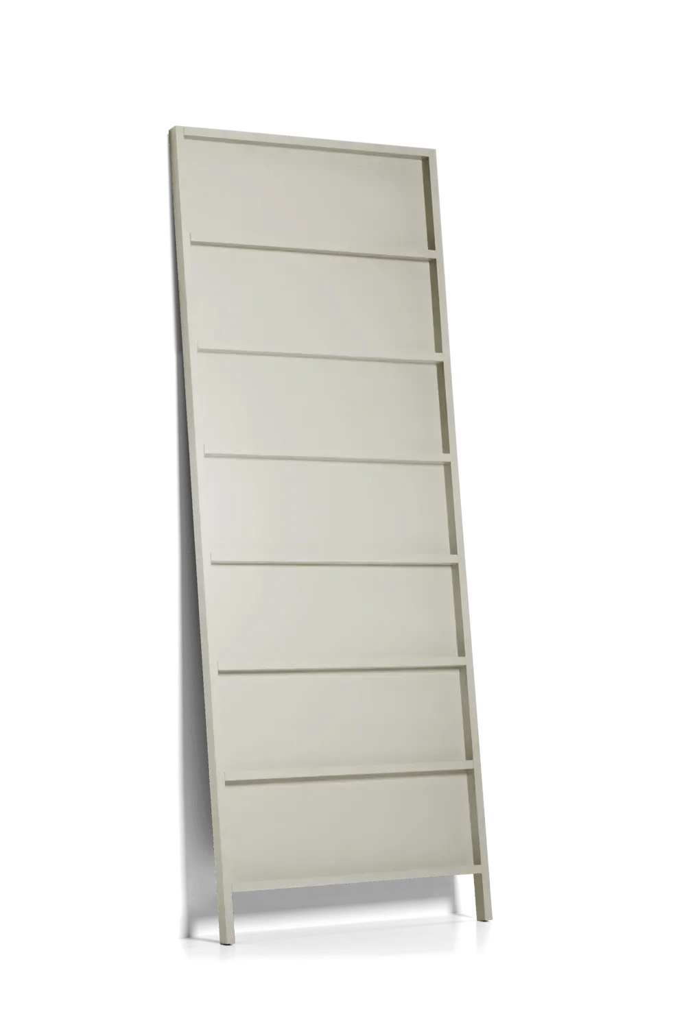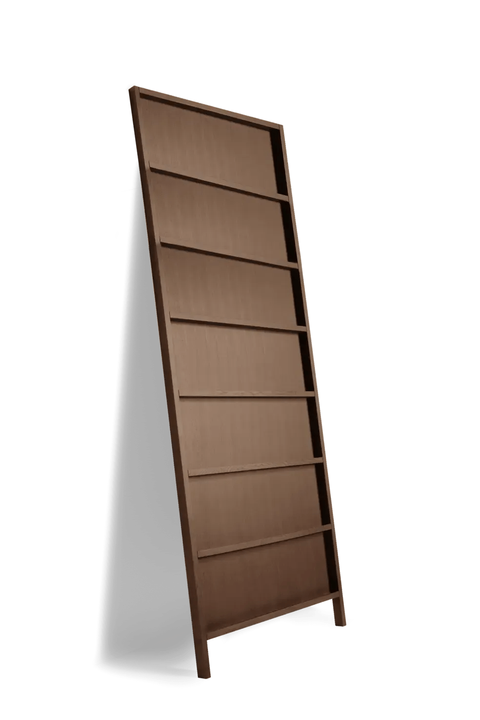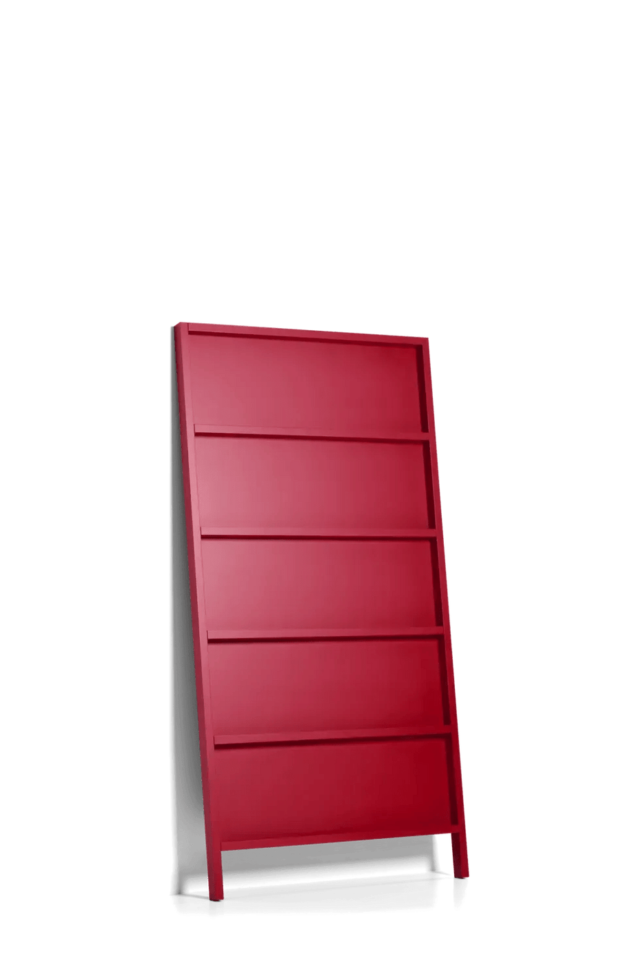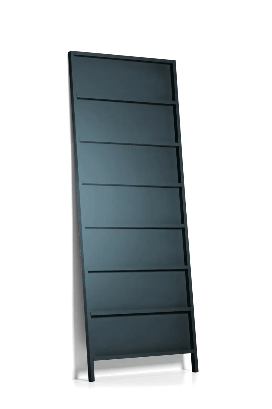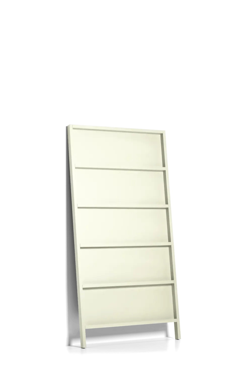 The Moooi Oblique is Marcel Wanders' solution to the problem of bookshelves taking up too much floor space - he just leaned the whole thing against the wall at an angle and called it done. Designed back in 2002, it's essentially a tall, narrow ladder-style shelf that props against your wall instead of mounting to it, which sounds precarious but works because of how the weight distribution and angle play out. The super-shallow 2.4-inch depth means this isn't for storing your hardcover collection, but it's perfect for displaying magazines, photo books, framed pictures, or creating what Wanders calls "the mood board of your lifestyle." The raised edge along each shelf stops everything from sliding off when the shelf leans back, which matters more than you'd think once you start loading it up with stuff. You can get it in solid oak with various stains or lacquered beech in a bunch of RAL colors including this traffic white, and the small version stands about 82 inches tall while the big one goes up to 112 inches. What makes the Oblique more practical than regular wall-mounted shelves is how you can move it around without drilling new holes or patching walls when you rearrange. The angled position creates this interesting visual break in a room - it's clearly a shelf but doesn't read as traditional furniture lined up parallel to everything else. You do need to position it correctly though - Moooi recommends placing the feet at a distance from the wall that's one-fifth the height of the unit, so the small one needs about 16 inches of clearance and the big one needs roughly 22 inches. The construction quality shows in how stable it feels despite just leaning there, and the solid wood material gives it enough weight that it's not going to tip over if you bump it. The narrow profile works well in hallways, behind doors, or in corners where a full-depth bookcase would block traffic flow. The lacquered beech version shows color really well if you go bold, while the oak options let the wood grain show through for a more natural look. Moooi's been Marcel Wanders' main platform since he co-founded it in 2001, and the Oblique was one of the brand's early designs that helped establish their approach of reimagining everyday objects. Wanders became famous for his Knotted Chair in the '90s and has been pushing conventional furniture design sideways ever since - he's Moooi's creative director and co-owner, so the brand reflects his philosophy pretty directly. His work tends to take familiar furniture types and shift them just enough that they feel fresh without being unusable, which is what the Oblique does with standard shelving. Made in the Netherlands with Dutch manufacturing standards, so you're getting solid construction instead of particle board that'll sag after six months. The design has stuck around for over twenty years because it solves an actual problem - needing display space without sacrificing floor area - while looking intentional rather than like you just propped some boards against the wall.