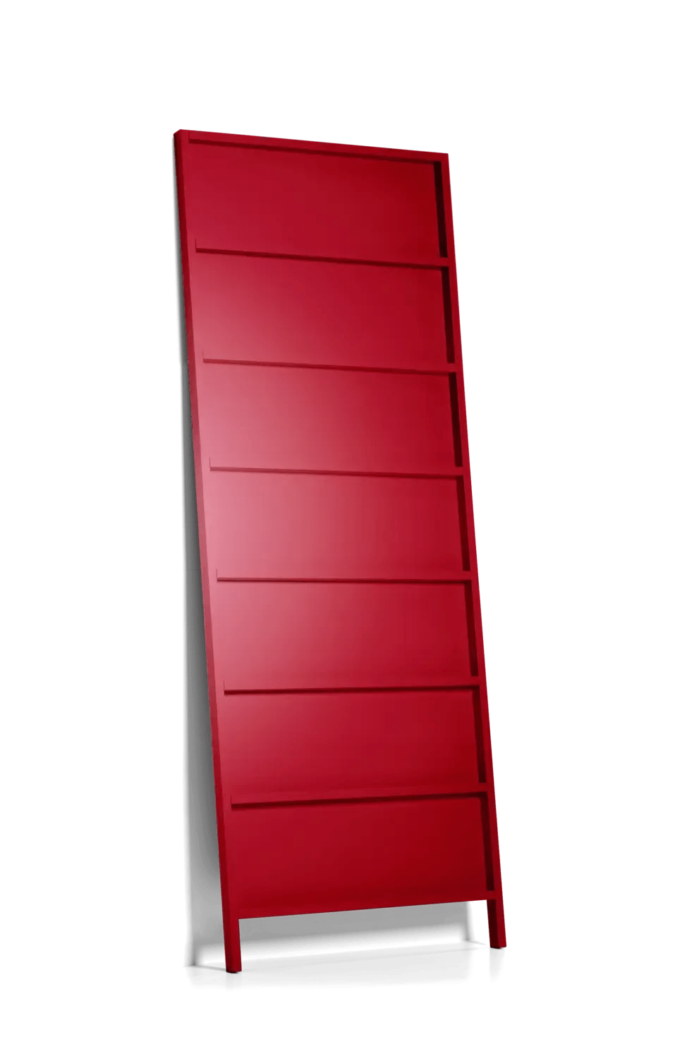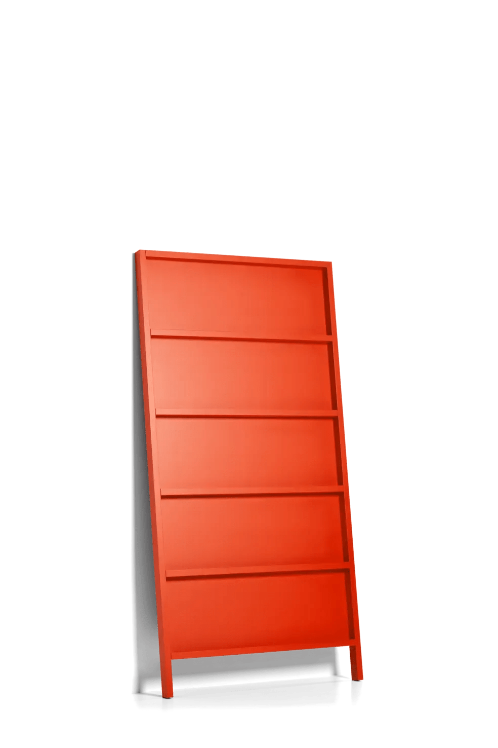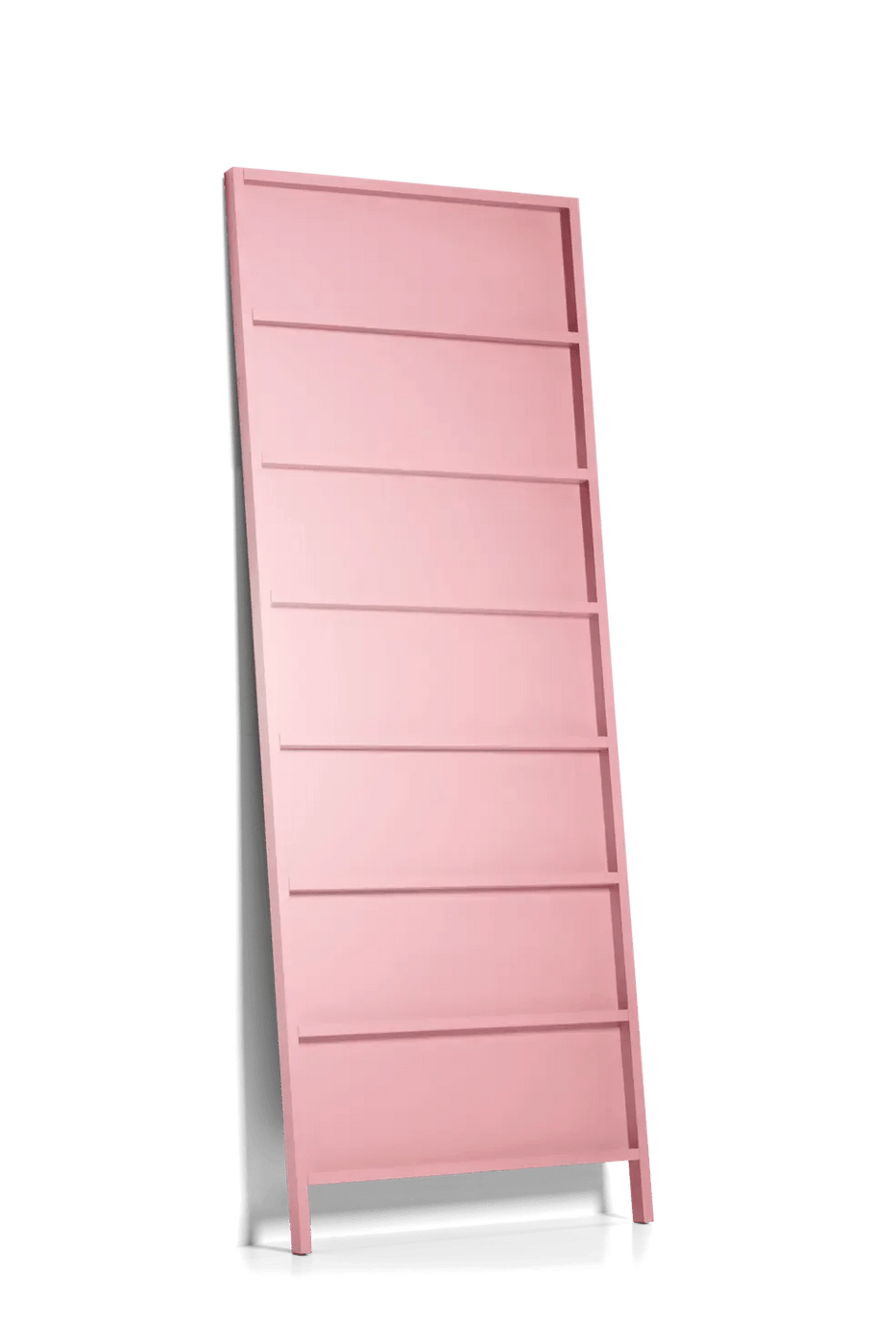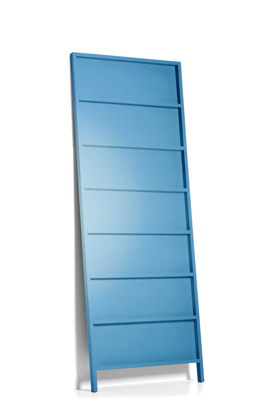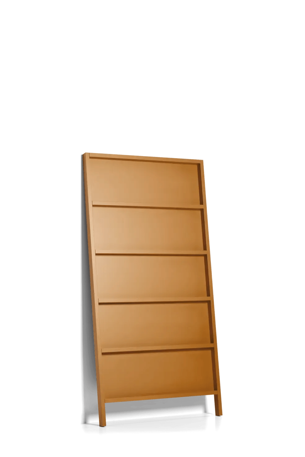 The Moooi Oblique is Marcel Wanders' solution to the problem of bookshelves taking up too much floor space - he just leaned the whole thing against the wall at an angle and called it done. Designed back in 2002, it's essentially a tall, narrow ladder-style shelf that props against your wall instead of mounting to it, which sounds precarious but works because of how the weight distribution and angle play out. The super-shallow 2.4-inch depth means this isn't for storing your hardcover collection, but it's perfect for displaying magazines, photo books, framed pictures, or creating what Wanders calls "the mood board of your lifestyle." The raised edge along each shelf stops everything from sliding off when the shelf leans back, which matters more than you'd think once you start loading it up with stuff. You can get it in solid oak with various stains or lacquered beech in a bunch of RAL colors including this traffic white, and the small version stands about 82 inches tall while the big one goes up to 112 inches. What makes the Oblique more practical than regular wall-mounted shelves is how you can move it around without drilling new holes or patching walls when you rearrange. The angled position creates this interesting visual break in a room - it's clearly a shelf but doesn't read as traditional furniture lined up parallel to everything else. You do need to position it correctly though - Moooi recommends placing the feet at a distance from the wall that's one-fifth the height of the unit, so the small one needs about 16 inches of clearance and the big one needs roughly 22 inches. The construction quality shows in how stable it feels despite just leaning there, and the solid wood material gives it enough weight that it's not going to tip over if you bump it. The narrow profile works well in hallways, behind doors, or in corners where a full-depth bookcase would block traffic flow. The lacquered beech version shows color really well if you go bold, while the oak options let the wood grain show through for a more natural look. Moooi's been Marcel Wanders' main platform since he co-founded it in 2001, and the Oblique was one of the brand's early designs that helped establish their approach of reimagining everyday objects. Wanders became famous for his Knotted Chair in the '90s and has been pushing conventional furniture design sideways ever since - he's Moooi's creative director and co-owner, so the brand reflects his philosophy pretty directly. His work tends to take familiar furniture types and shift them just enough that they feel fresh without being unusable, which is what the Oblique does with standard shelving. Made in the Netherlands with Dutch manufacturing standards, so you're getting solid construction instead of particle board that'll sag after six months. The design has stuck around for over twenty years because it solves an actual problem - needing display space without sacrificing floor area - while looking intentional rather than like you just propped some boards against the wall.