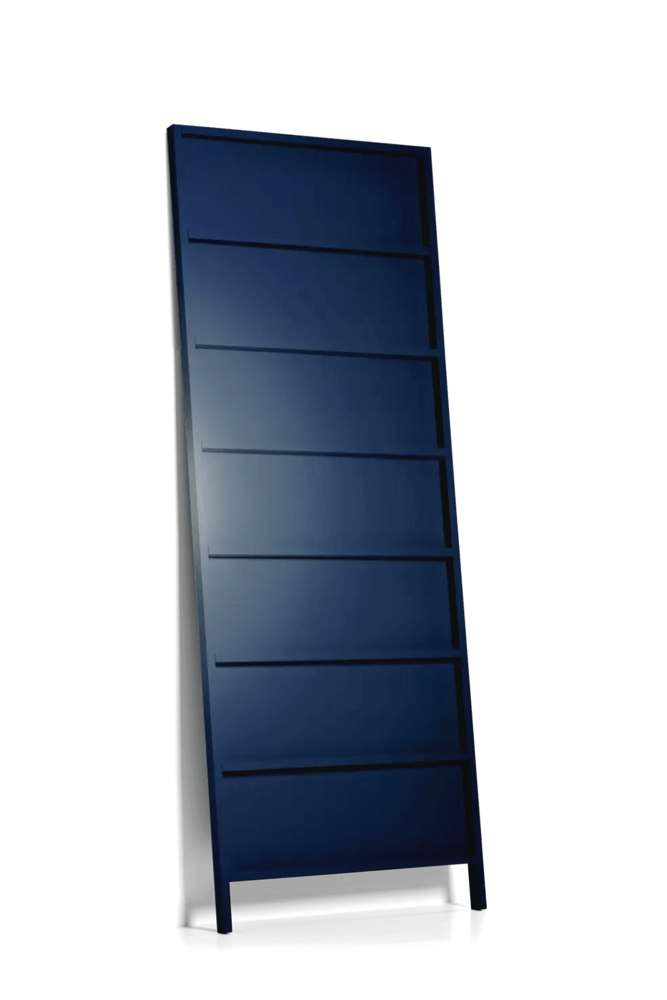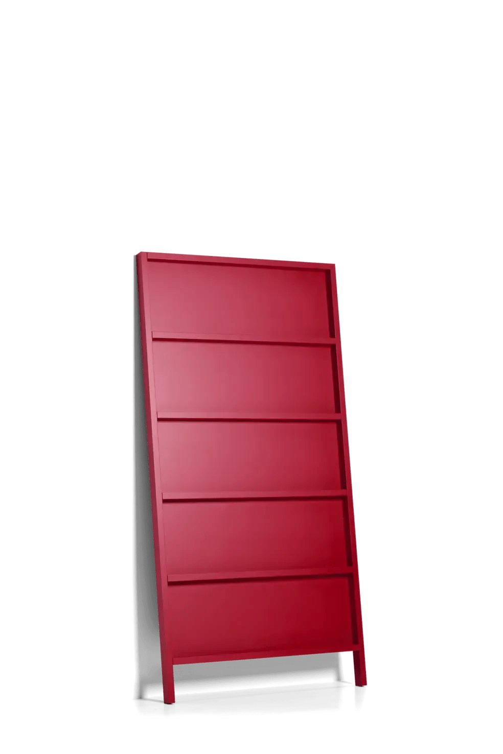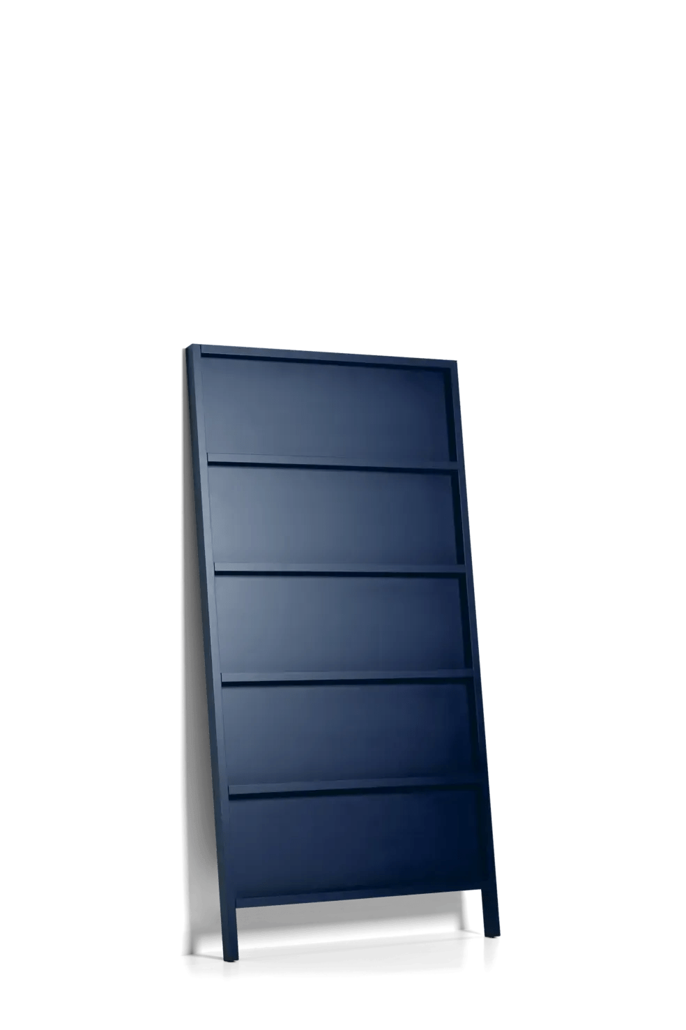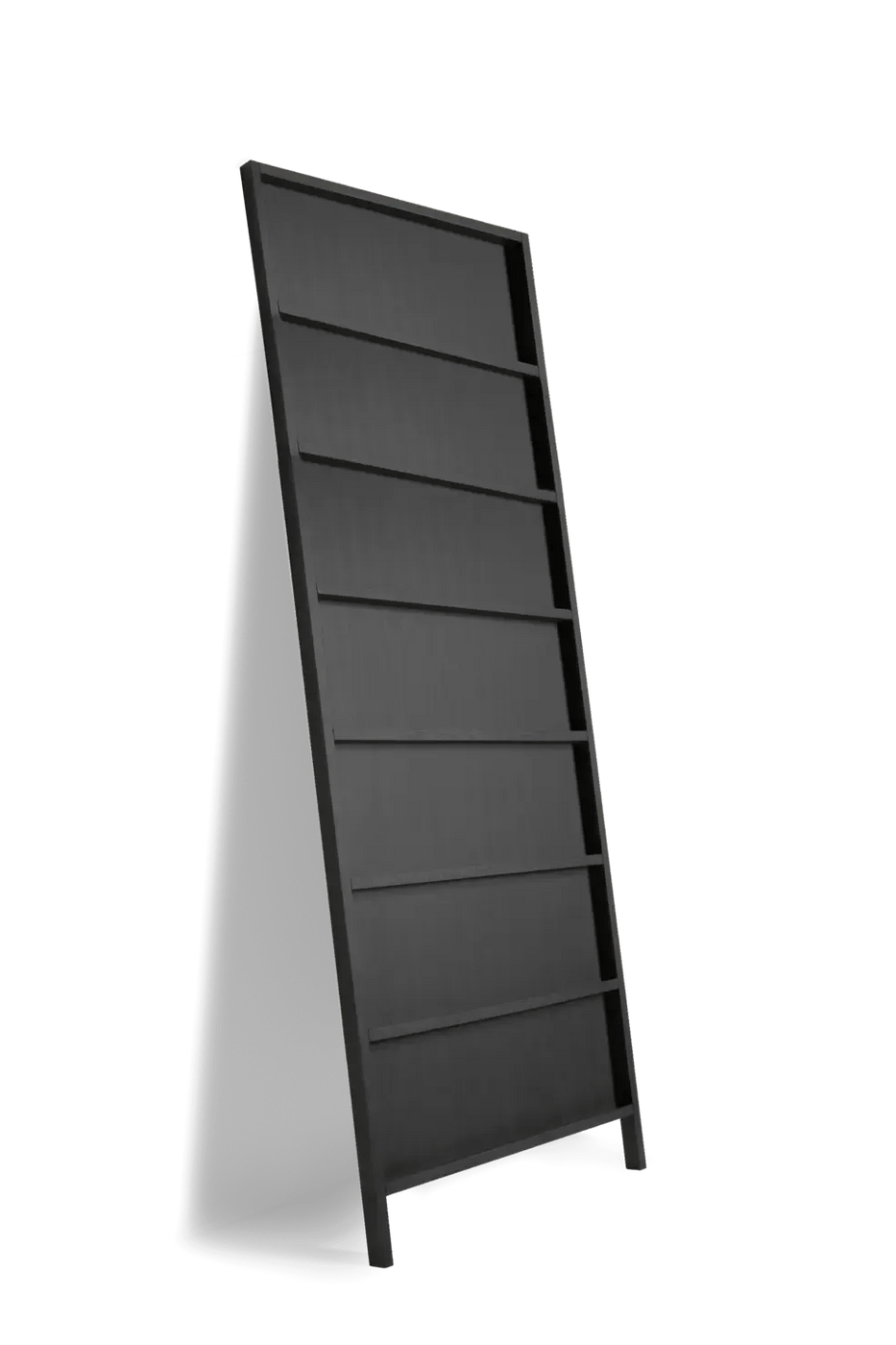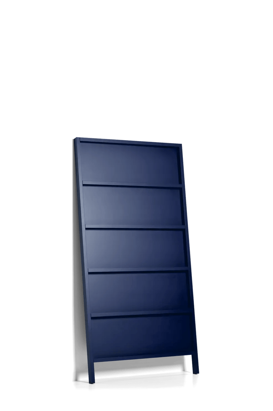 The Moooi Oblique is Marcel Wanders' solution to the problem of bookshelves taking up too much floor space - he just leaned the whole thing against the wall at an angle and called it done. Designed back in 2002, it's essentially a tall, narrow ladder-style shelf that props against your wall instead of mounting to it, which sounds precarious but works because of how the weight distribution and angle play out. The super-shallow 2.4-inch depth means this isn't for storing your hardcover collection, but it's perfect for displaying magazines, photo books, framed pictures, or creating what Wanders calls "the mood board of your lifestyle." The raised edge along each shelf stops everything from sliding off when the shelf leans back, which matters more than you'd think once you start loading it up with stuff. You can get it in solid oak with various stains or lacquered beech in a bunch of RAL colors including this traffic white, and the small version stands about 82 inches tall while the big one goes up to 112 inches. What makes the Oblique more practical than regular wall-mounted shelves is how you can move it around without drilling new holes or patching walls when you rearrange. The angled position creates this interesting visual break in a room - it's clearly a shelf but doesn't read as traditional furniture lined up parallel to everything else. You do need to position it correctly though - Moooi recommends placing the feet at a distance from the wall that's one-fifth the height of the unit, so the small one needs about 16 inches of clearance and the big one needs roughly 22 inches. The construction quality shows in how stable it feels despite just leaning there, and the solid wood material gives it enough weight that it's not going to tip over if you bump it. The narrow profile works well in hallways, behind doors, or in corners where a full-depth bookcase would block traffic flow. The lacquered beech version shows color really well if you go bold, while the oak options let the wood grain show through for a more natural look. Moooi's been Marcel Wanders' main platform since he co-founded it in 2001, and the Oblique was one of the brand's early designs that helped establish their approach of reimagining everyday objects. Wanders became famous for his Knotted Chair in the '90s and has been pushing conventional furniture design sideways ever since - he's Moooi's creative director and co-owner, so the brand reflects his philosophy pretty directly. His work tends to take familiar furniture types and shift them just enough that they feel fresh without being unusable, which is what the Oblique does with standard shelving. Made in the Netherlands with Dutch manufacturing standards, so you're getting solid construction instead of particle board that'll sag after six months. The design has stuck around for over twenty years because it solves an actual problem - needing display space without sacrificing floor area - while looking intentional rather than like you just propped some boards against the wall.