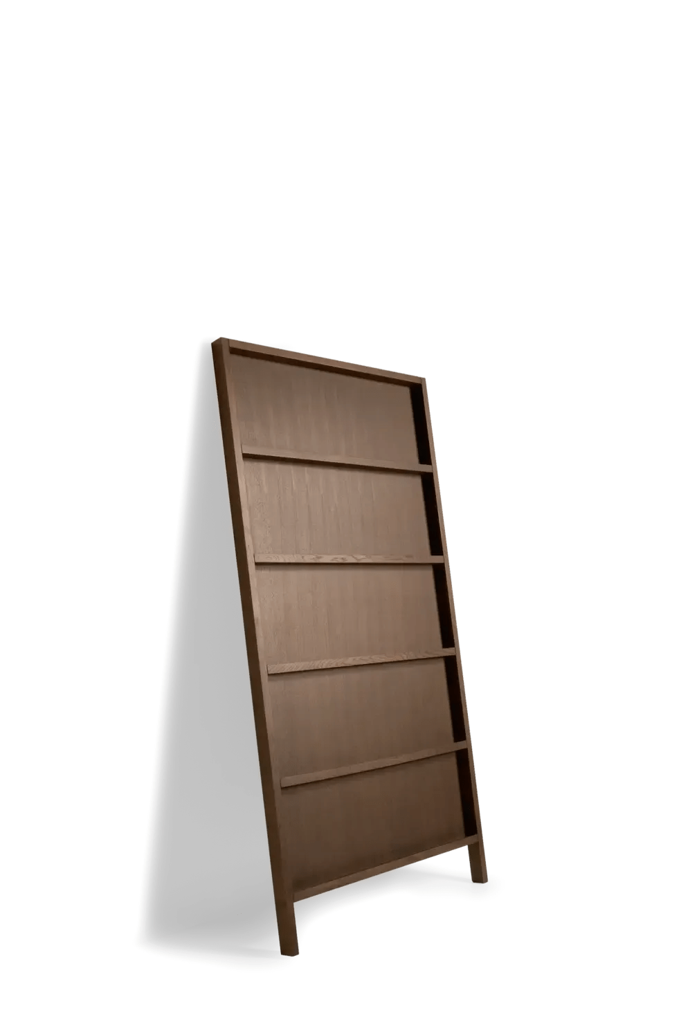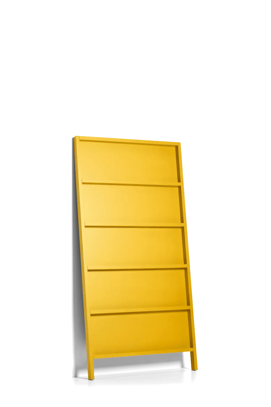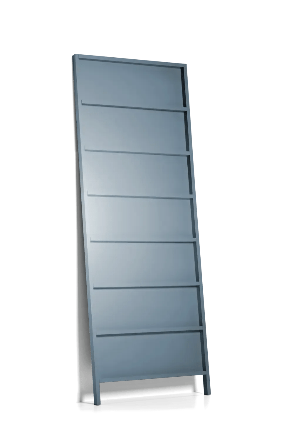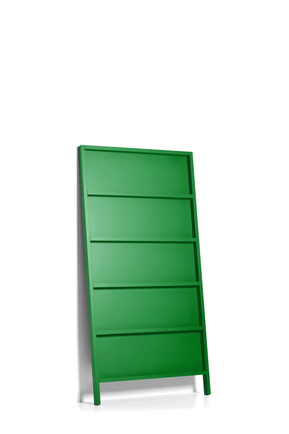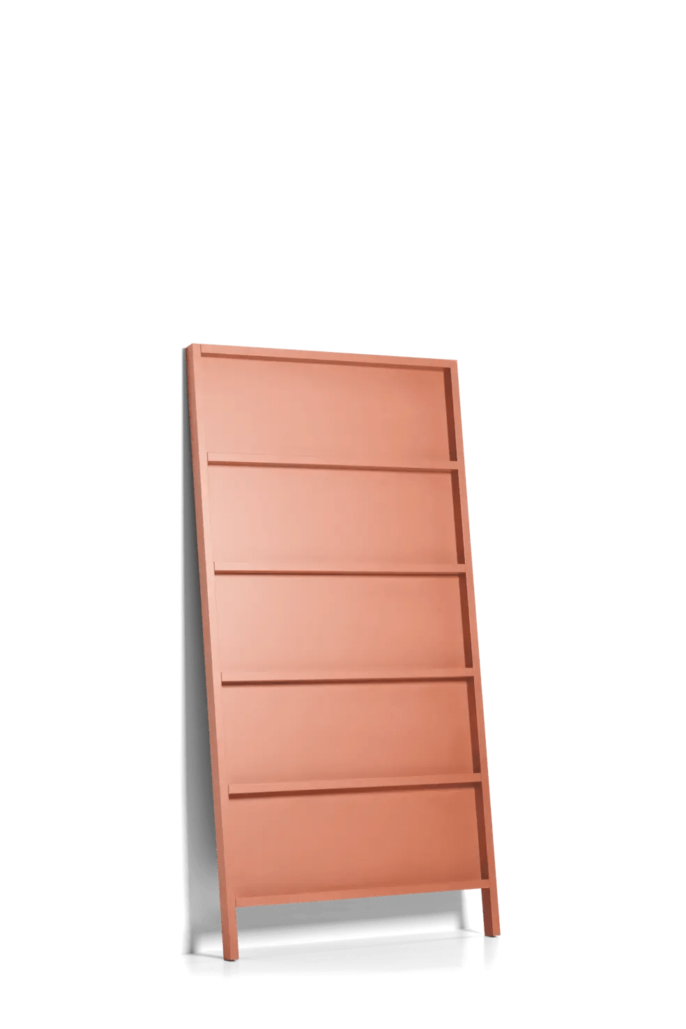 The Moooi Oblique is Marcel Wanders' solution to the problem of bookshelves taking up too much floor space - he just leaned the whole thing against the wall at an angle and called it done. Designed back in 2002, it's essentially a tall, narrow ladder-style shelf that props against your wall instead of mounting to it, which sounds precarious but works because of how the weight distribution and angle play out. The super-shallow 2.4-inch depth means this isn't for storing your hardcover collection, but it's perfect for displaying magazines, photo books, framed pictures, or creating what Wanders calls "the mood board of your lifestyle." The raised edge along each shelf stops everything from sliding off when the shelf leans back, which matters more than you'd think once you start loading it up with stuff. You can get it in solid oak with various stains or lacquered beech in a bunch of RAL colors including this traffic white, and the small version stands about 82 inches tall while the big one goes up to 112 inches. What makes the Oblique more practical than regular wall-mounted shelves is how you can move it around without drilling new holes or patching walls when you rearrange. The angled position creates this interesting visual break in a room - it's clearly a shelf but doesn't read as traditional furniture lined up parallel to everything else. You do need to position it correctly though - Moooi recommends placing the feet at a distance from the wall that's one-fifth the height of the unit, so the small one needs about 16 inches of clearance and the big one needs roughly 22 inches. The construction quality shows in how stable it feels despite just leaning there, and the solid wood material gives it enough weight that it's not going to tip over if you bump it. The narrow profile works well in hallways, behind doors, or in corners where a full-depth bookcase would block traffic flow. The lacquered beech version shows color really well if you go bold, while the oak options let the wood grain show through for a more natural look. Moooi's been Marcel Wanders' main platform since he co-founded it in 2001, and the Oblique was one of the brand's early designs that helped establish their approach of reimagining everyday objects. Wanders became famous for his Knotted Chair in the '90s and has been pushing conventional furniture design sideways ever since - he's Moooi's creative director and co-owner, so the brand reflects his philosophy pretty directly. His work tends to take familiar furniture types and shift them just enough that they feel fresh without being unusable, which is what the Oblique does with standard shelving. Made in the Netherlands with Dutch manufacturing standards, so you're getting solid construction instead of particle board that'll sag after six months. The design has stuck around for over twenty years because it solves an actual problem - needing display space without sacrificing floor area - while looking intentional rather than like you just propped some boards against the wall.
