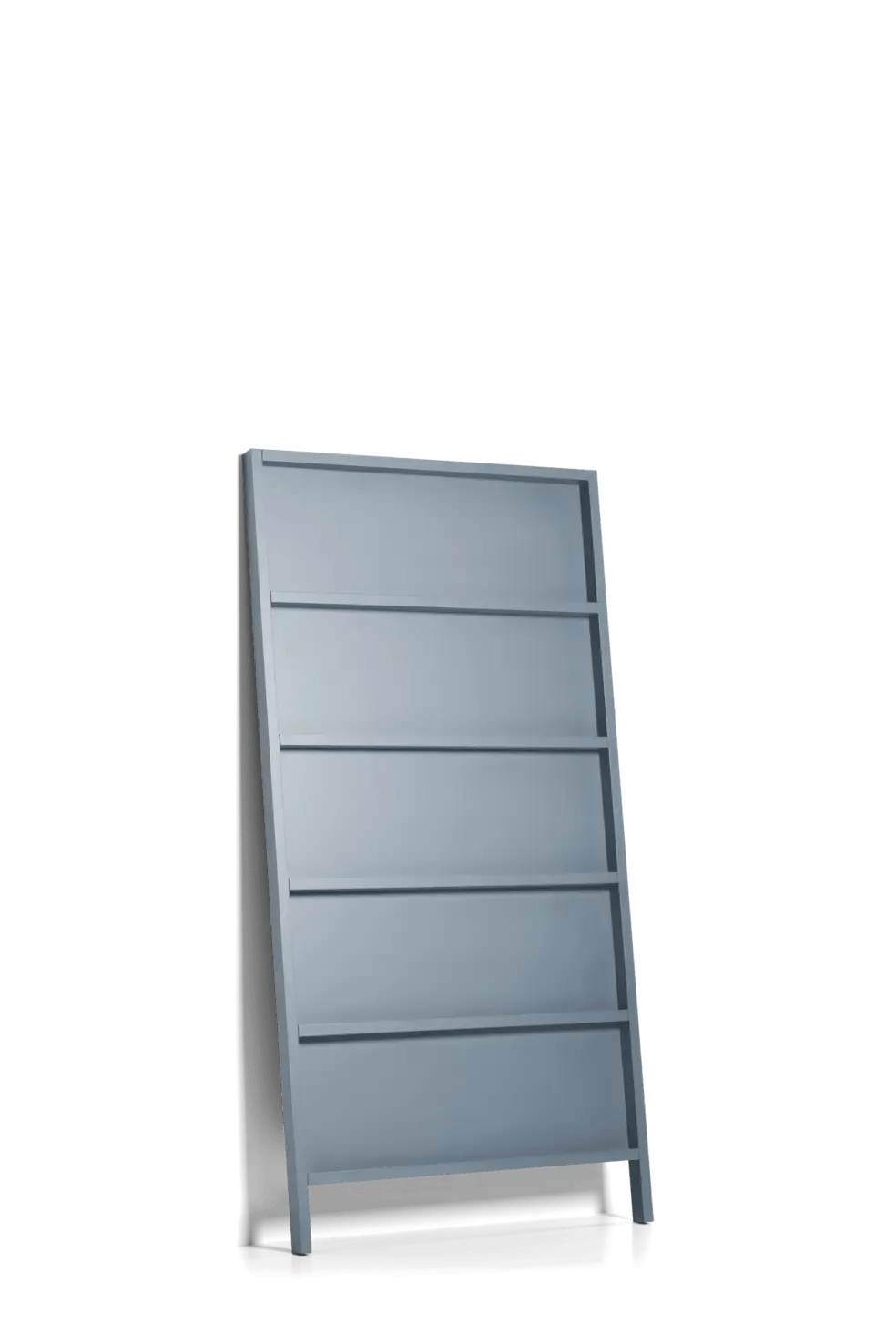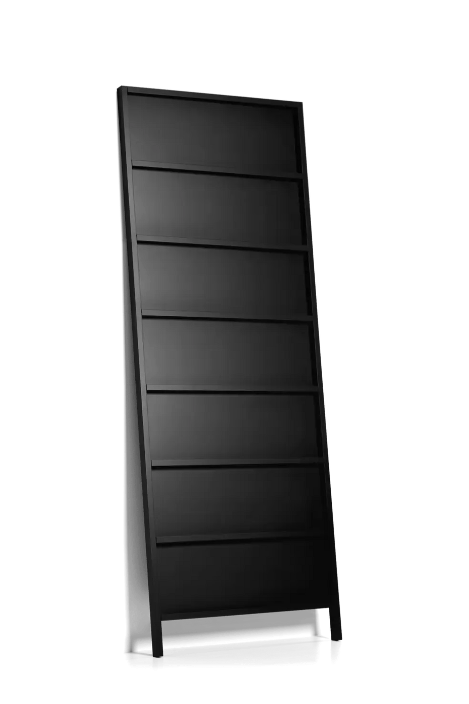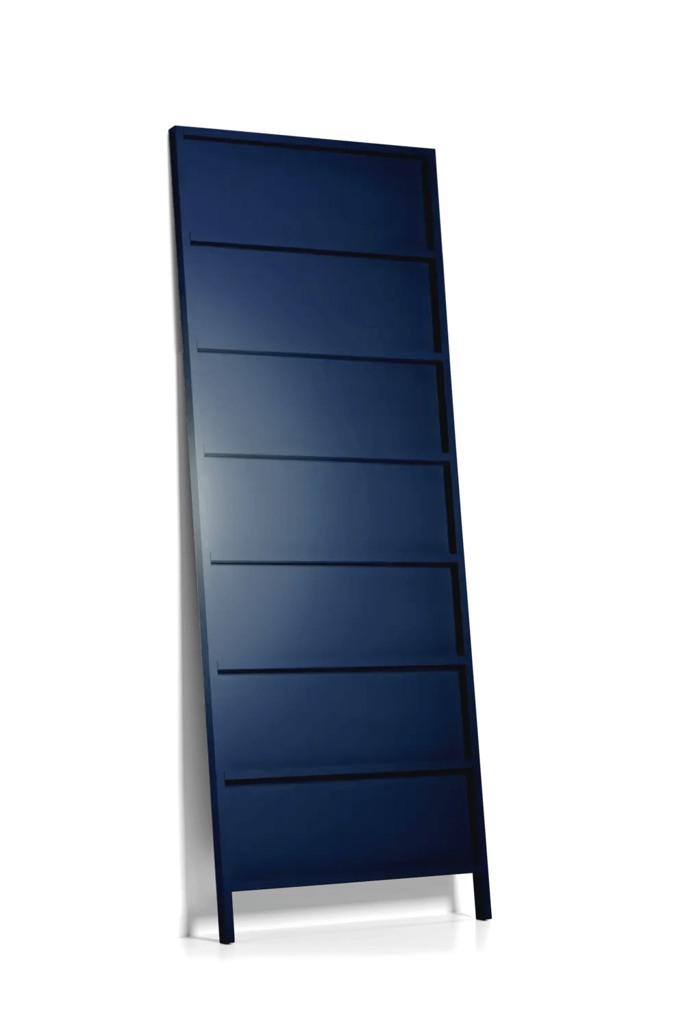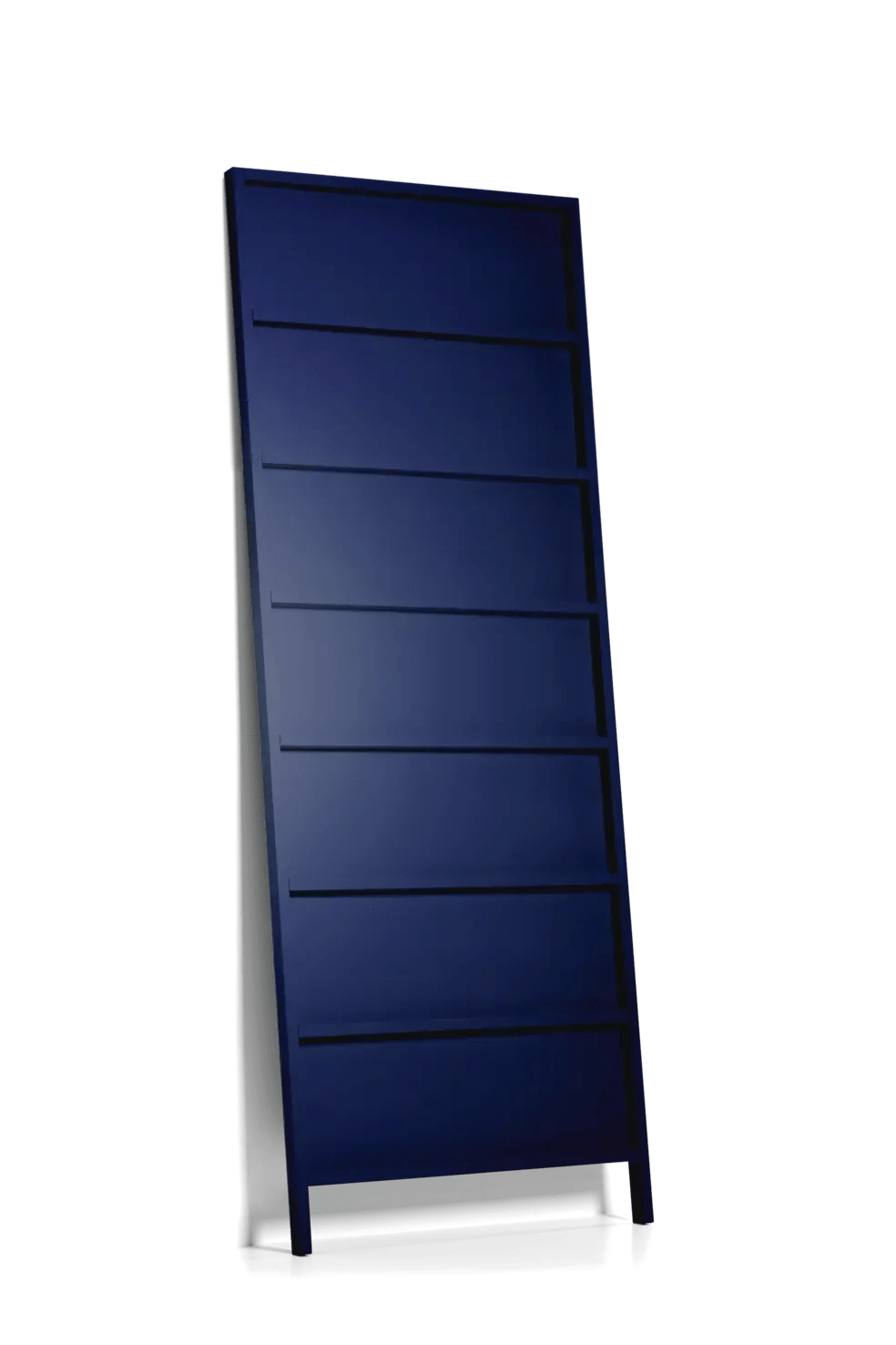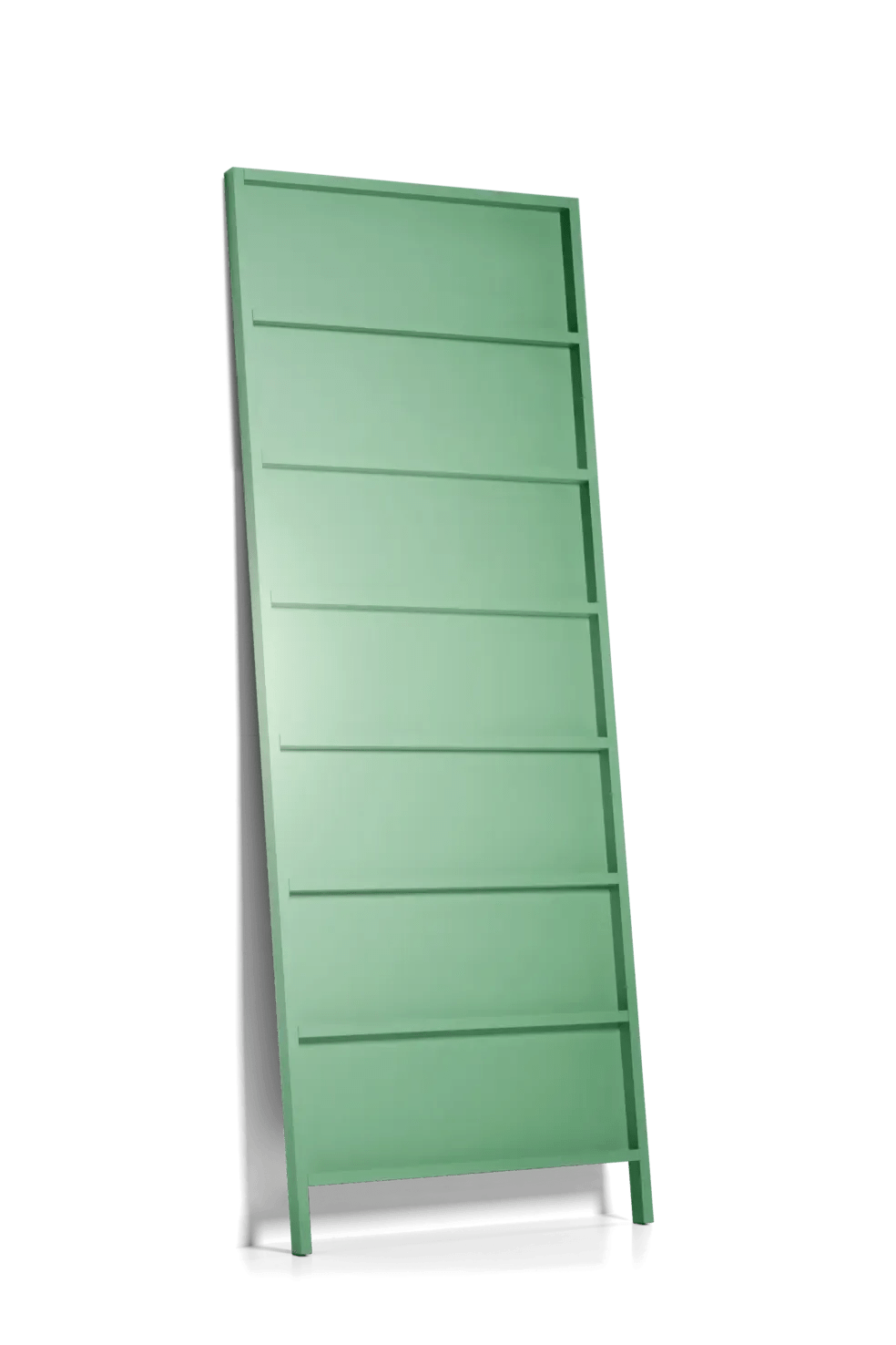 The Moooi Oblique is Marcel Wanders' solution to the problem of bookshelves taking up too much floor space - he just leaned the whole thing against the wall at an angle and called it done. Designed back in 2002, it's essentially a tall, narrow ladder-style shelf that props against your wall instead of mounting to it, which sounds precarious but works because of how the weight distribution and angle play out. The super-shallow 2.4-inch depth means this isn't for storing your hardcover collection, but it's perfect for displaying magazines, photo books, framed pictures, or creating what Wanders calls "the mood board of your lifestyle." The raised edge along each shelf stops everything from sliding off when the shelf leans back, which matters more than you'd think once you start loading it up with stuff. You can get it in solid oak with various stains or lacquered beech in a bunch of RAL colors including this traffic white, and the small version stands about 82 inches tall while the big one goes up to 112 inches. What makes the Oblique more practical than regular wall-mounted shelves is how you can move it around without drilling new holes or patching walls when you rearrange. The angled position creates this interesting visual break in a room - it's clearly a shelf but doesn't read as traditional furniture lined up parallel to everything else. You do need to position it correctly though - Moooi recommends placing the feet at a distance from the wall that's one-fifth the height of the unit, so the small one needs about 16 inches of clearance and the big one needs roughly 22 inches. The construction quality shows in how stable it feels despite just leaning there, and the solid wood material gives it enough weight that it's not going to tip over if you bump it. The narrow profile works well in hallways, behind doors, or in corners where a full-depth bookcase would block traffic flow. The lacquered beech version shows color really well if you go bold, while the oak options let the wood grain show through for a more natural look. Moooi's been Marcel Wanders' main platform since he co-founded it in 2001, and the Oblique was one of the brand's early designs that helped establish their approach of reimagining everyday objects. Wanders became famous for his Knotted Chair in the '90s and has been pushing conventional furniture design sideways ever since - he's Moooi's creative director and co-owner, so the brand reflects his philosophy pretty directly. His work tends to take familiar furniture types and shift them just enough that they feel fresh without being unusable, which is what the Oblique does with standard shelving. Made in the Netherlands with Dutch manufacturing standards, so you're getting solid construction instead of particle board that'll sag after six months. The design has stuck around for over twenty years because it solves an actual problem - needing display space without sacrificing floor area - while looking intentional rather than like you just propped some boards against the wall.