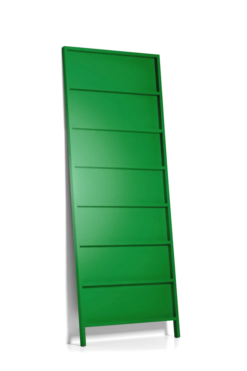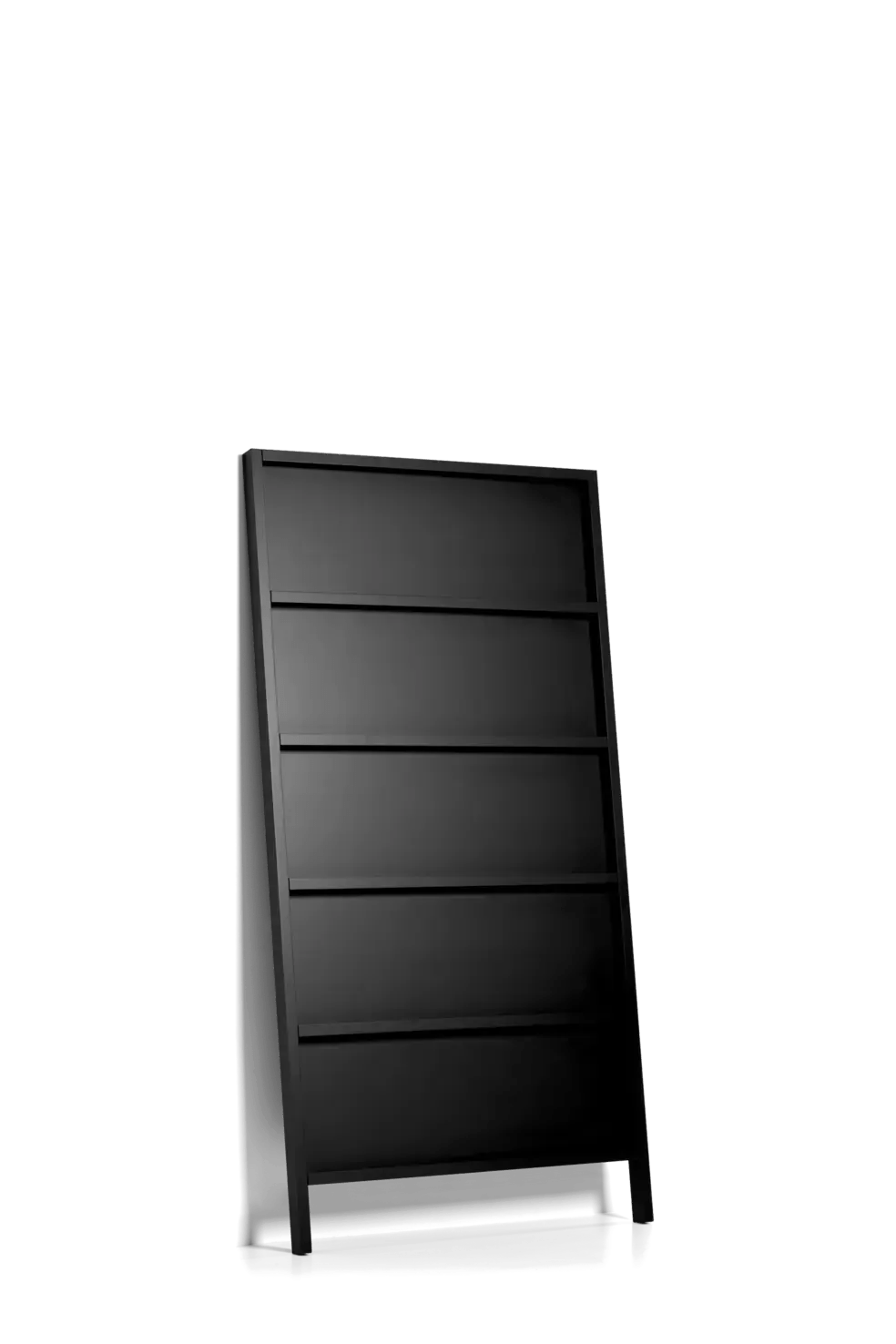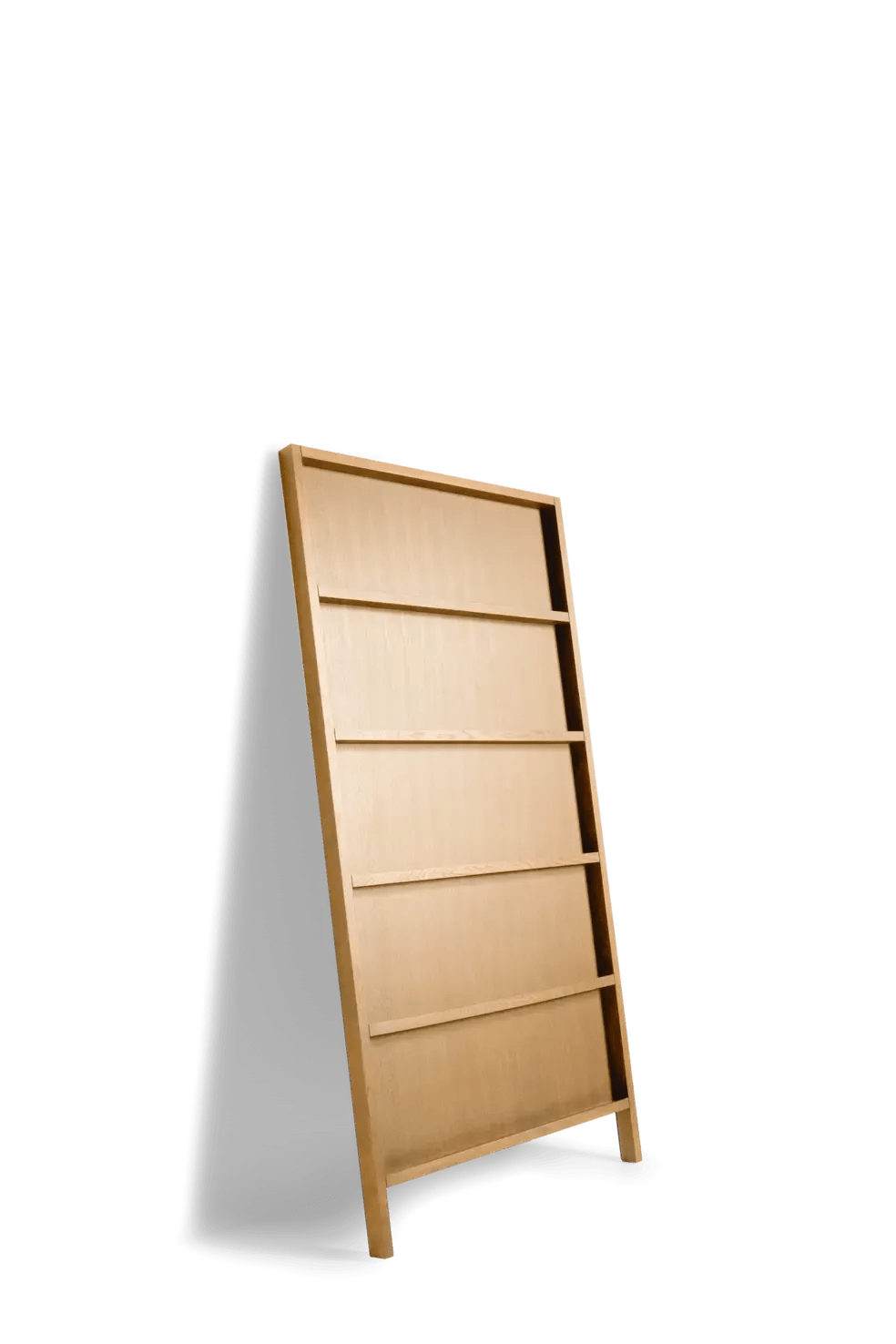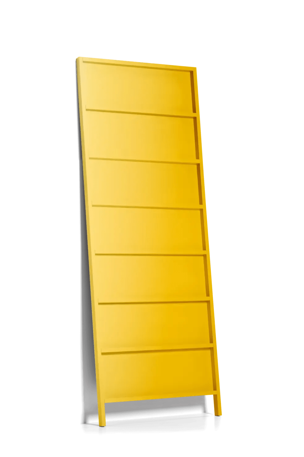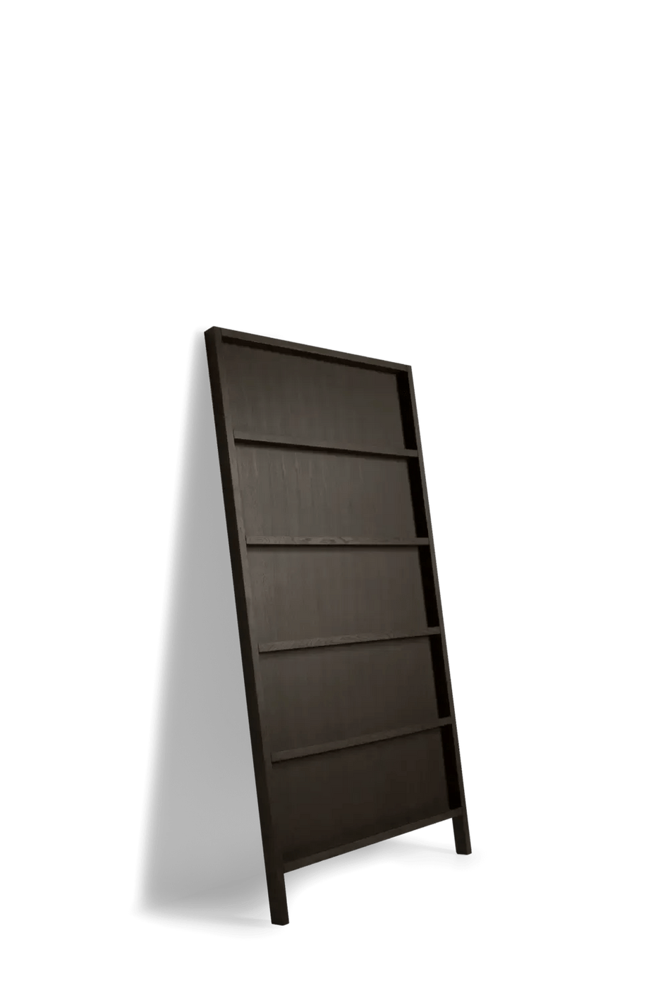 The Moooi Oblique is Marcel Wanders' solution to the problem of bookshelves taking up too much floor space - he just leaned the whole thing against the wall at an angle and called it done. Designed back in 2002, it's essentially a tall, narrow ladder-style shelf that props against your wall instead of mounting to it, which sounds precarious but works because of how the weight distribution and angle play out. The super-shallow 2.4-inch depth means this isn't for storing your hardcover collection, but it's perfect for displaying magazines, photo books, framed pictures, or creating what Wanders calls "the mood board of your lifestyle." The raised edge along each shelf stops everything from sliding off when the shelf leans back, which matters more than you'd think once you start loading it up with stuff. You can get it in solid oak with various stains or lacquered beech in a bunch of RAL colors including this traffic white, and the small version stands about 82 inches tall while the big one goes up to 112 inches. What makes the Oblique more practical than regular wall-mounted shelves is how you can move it around without drilling new holes or patching walls when you rearrange. The angled position creates this interesting visual break in a room - it's clearly a shelf but doesn't read as traditional furniture lined up parallel to everything else. You do need to position it correctly though - Moooi recommends placing the feet at a distance from the wall that's one-fifth the height of the unit, so the small one needs about 16 inches of clearance and the big one needs roughly 22 inches. The construction quality shows in how stable it feels despite just leaning there, and the solid wood material gives it enough weight that it's not going to tip over if you bump it. The narrow profile works well in hallways, behind doors, or in corners where a full-depth bookcase would block traffic flow. The lacquered beech version shows color really well if you go bold, while the oak options let the wood grain show through for a more natural look. Moooi's been Marcel Wanders' main platform since he co-founded it in 2001, and the Oblique was one of the brand's early designs that helped establish their approach of reimagining everyday objects. Wanders became famous for his Knotted Chair in the '90s and has been pushing conventional furniture design sideways ever since - he's Moooi's creative director and co-owner, so the brand reflects his philosophy pretty directly. His work tends to take familiar furniture types and shift them just enough that they feel fresh without being unusable, which is what the Oblique does with standard shelving. Made in the Netherlands with Dutch manufacturing standards, so you're getting solid construction instead of particle board that'll sag after six months. The design has stuck around for over twenty years because it solves an actual problem - needing display space without sacrificing floor area - while looking intentional rather than like you just propped some boards against the wall.