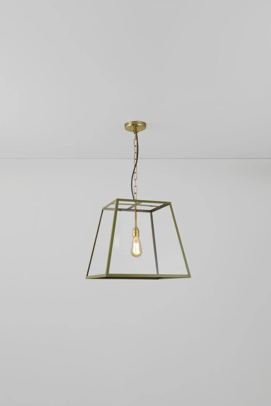 This sloped box pendant with green glass plates is suspended by dual metal chain and features internally glazed construction that ensures optimal light distribution while protecting the distinctive colored glass. Skillfully crafted using centuries-old techniques from London's East India Docks, each light is carefully soldered, glazed, and weathered by hand for exceptional quality. The large dimensions of 17.7" width, 16.9" height, and 17.7" depth provide commanding presence perfect for substantial rooms and high ceilings. Suspended from coordinating chain with 71-inch cord for flexible height adjustment, E26 compatibility supports up to 100W bulbs with dimmable options, and UL listing ensures safe installation. The distinctive green glass offers a unique alternative to traditional clear glass while maintaining the authentic industrial aesthetic.