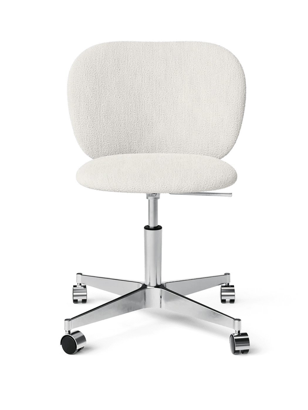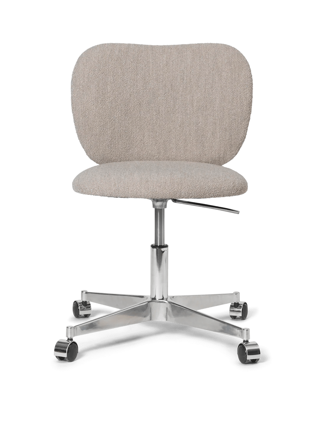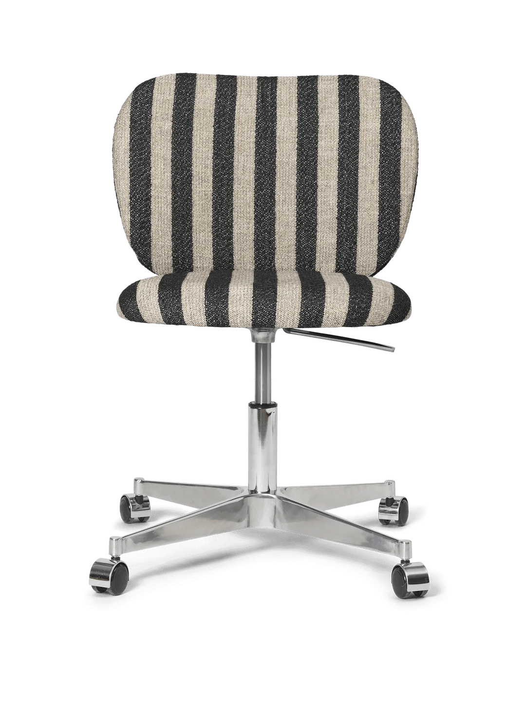 The Ferm Living Rico Chair with Castors brings those signature Rico curves and comfort to your workspace, crafted as a made-to-order piece so you can choose from their complete fabric collection including soft bouclé, Louisiana striped patterns, and other premium options that perfectly match your office or home aesthetic. What makes this mobile version special is how it maintains the embracing, cocooning quality of the Rico design while adding the practical features you actually need for desk work - smooth-rolling castors and integrated height adjustment that lets you find your perfect sitting position. The polished aluminum base creates this beautiful contrast against the soft upholstered shell, and the whole design manages to look sophisticated enough for professional settings while being comfortable enough for those long work-from-home sessions. The functionality really shines when you're using it daily for everything from video calls to focused writing sessions. The height adjustment range from 44-55.5cm seat height means it works for different desk heights and body types, while the castors let you roll easily between workstations or pull closer to the table for meetings. The molded foam construction with inner steel structure in the backrest provides real ergonomic support, and the wooden frame in the seat ensures it maintains its shape even with daily use. At 74cm wide, it's substantial enough to feel comfortable but not so large that it overwhelms smaller home offices or tight workspace corners. Ferm Living approaches office furniture from Copenhagen with that Danish understanding that work chairs need to enhance productivity without sacrificing style or comfort. They recognize that modern work happens everywhere - from kitchen tables to dedicated home offices to co-working spaces - so their designs need to be versatile enough to fit different environments while providing genuine ergonomic support. The Rico Chair with Castors reflects their philosophy of creating pieces that make daily routines more pleasant through thoughtful design and quality construction. Through their commitment to premium materials and responsible manufacturing, they create furniture that becomes an integral part of how you work rather than just something you sit on during business hours.