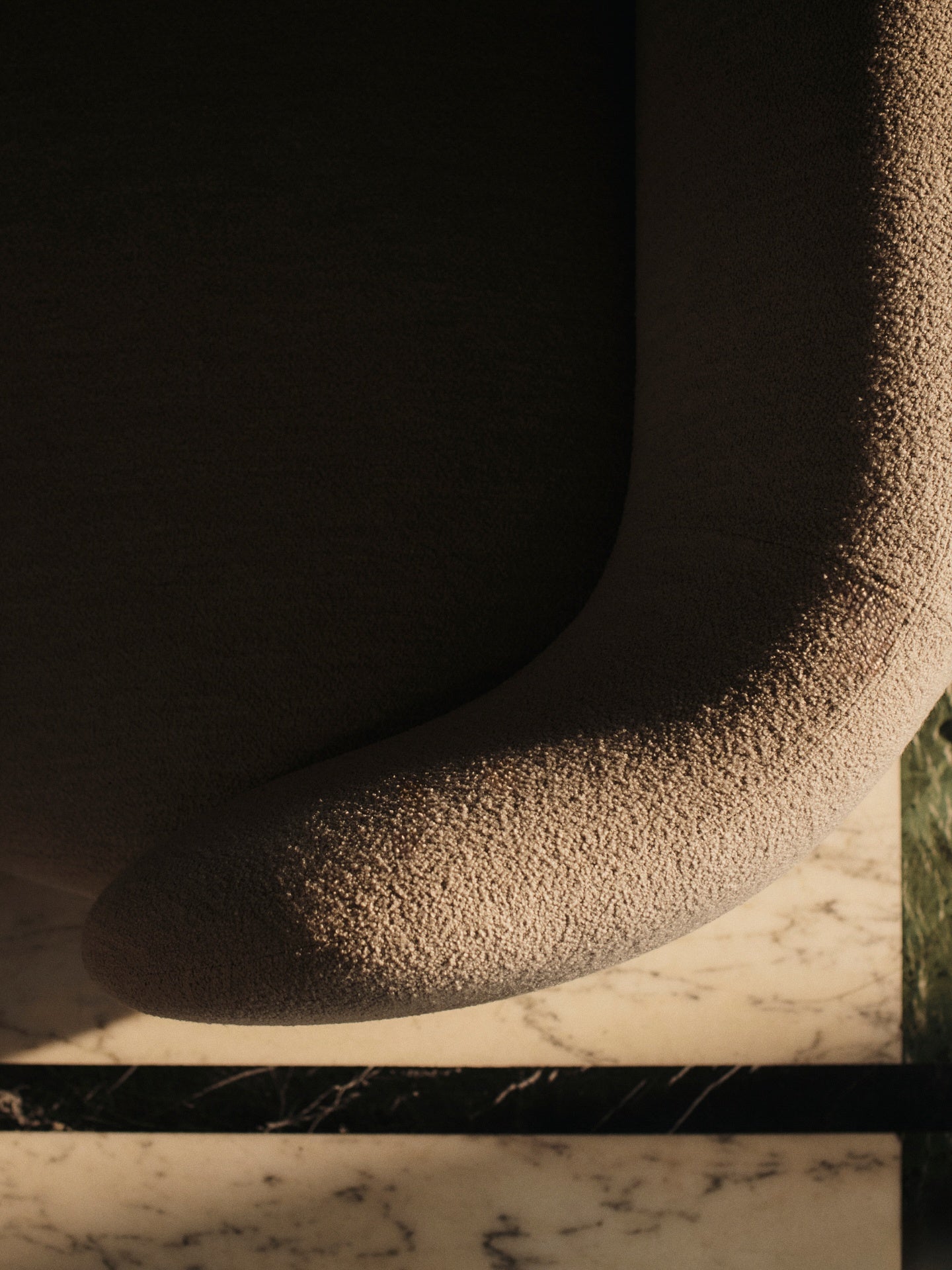 Fabric: Soft Bouclé. 90% polyester, 5% cotton, 5% acrylic fibres. Backrest: Moulded foam with inner steel structure. Seat: PU foam with FSC™ Mix-certified inner wooden structure. Feet: Low density polyethylene.