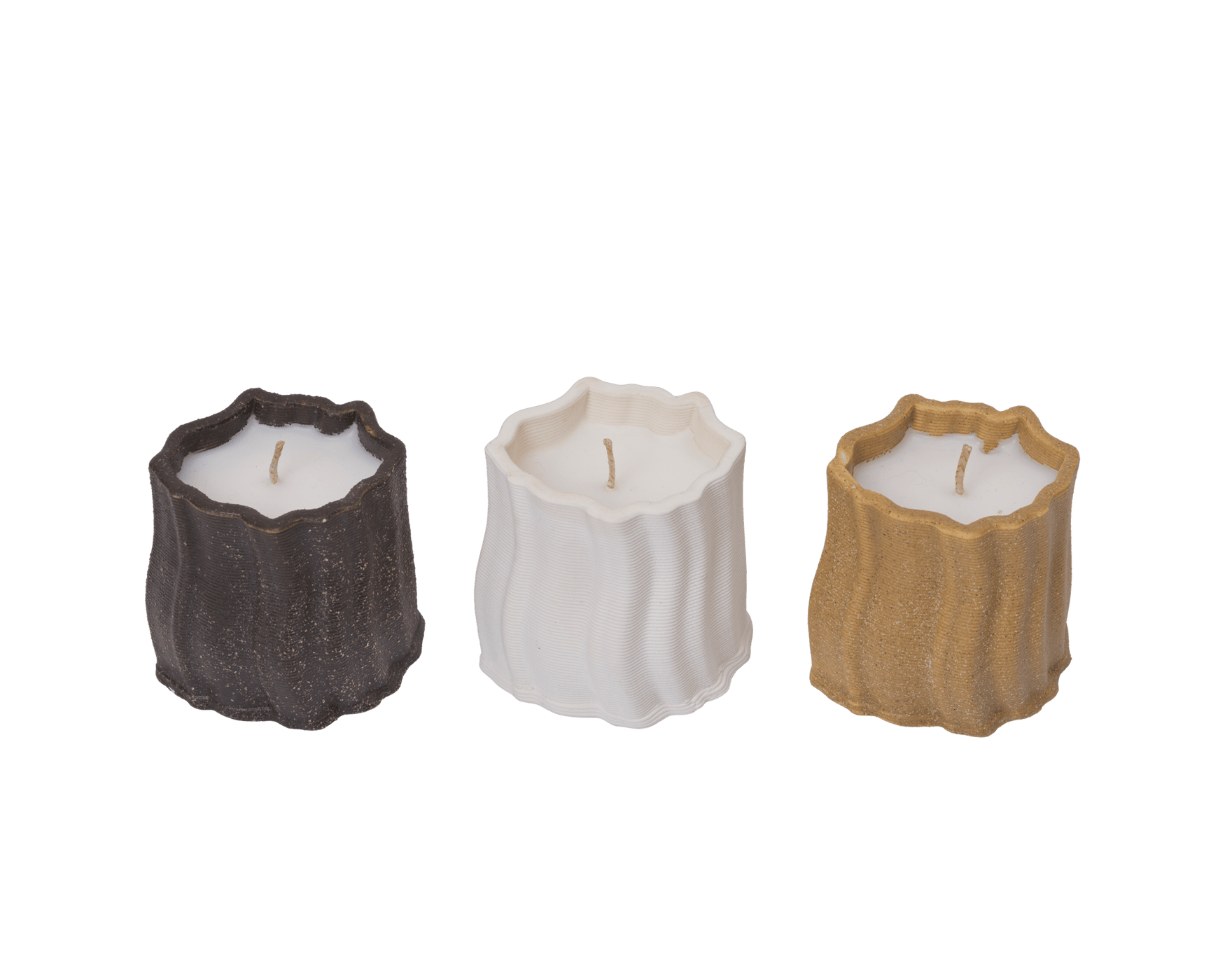 Crafted from 3D-printed ceramic, the Rylith Scented Candles evoke the organic beauty of natural stone formations. Vertical, undulating ridges flow along each vessel, while subtle twists in the geometry create a sense of movement. Once the candle has burned out, the sculptural vessel can be repurposed as a decorative object.