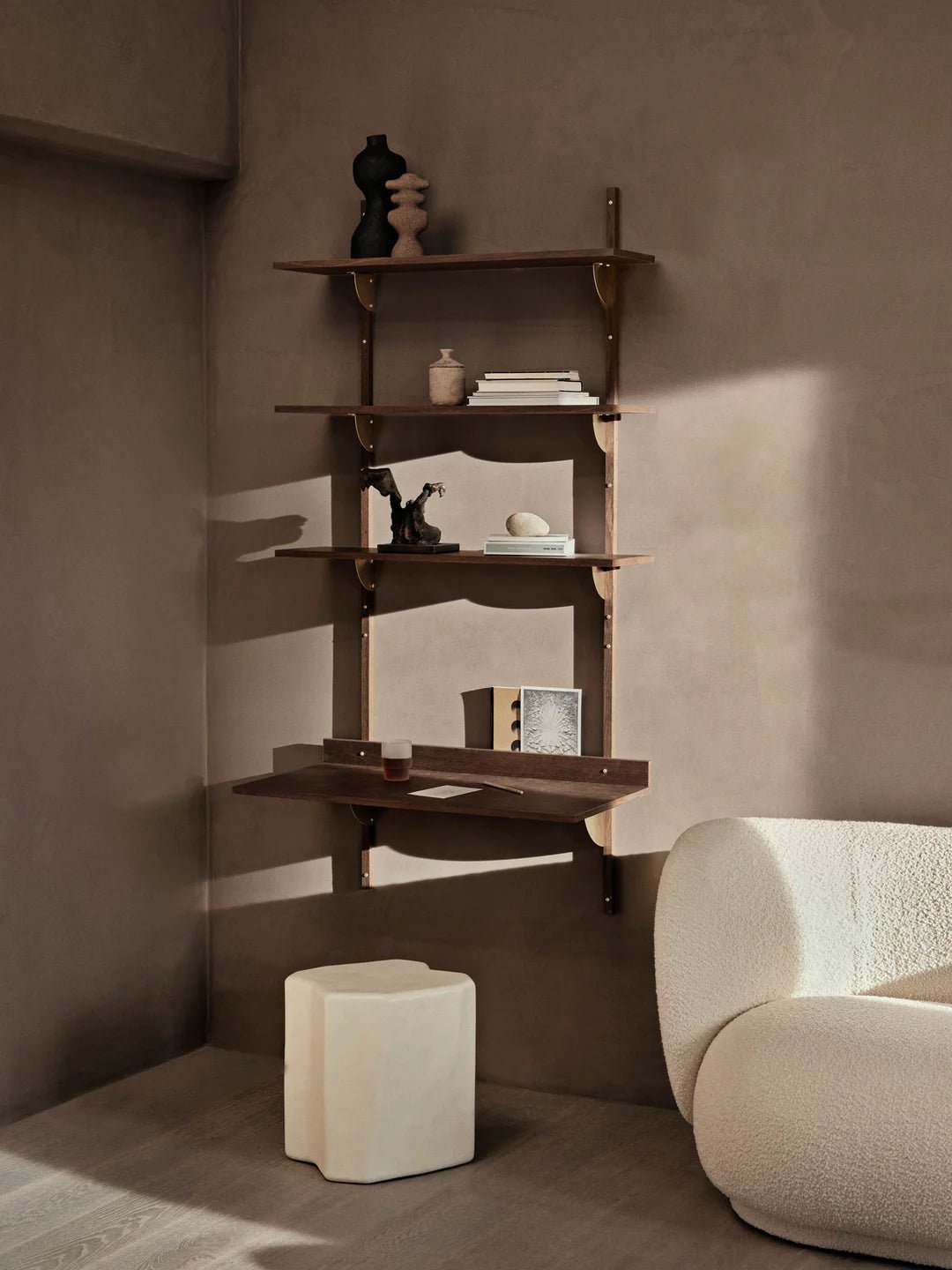 - Material: Shelves: Smoked oak veneer with MDF core. Profiles: Smoked solid oak. Brackets and rack: Brass. FSC™ Mix certified wood