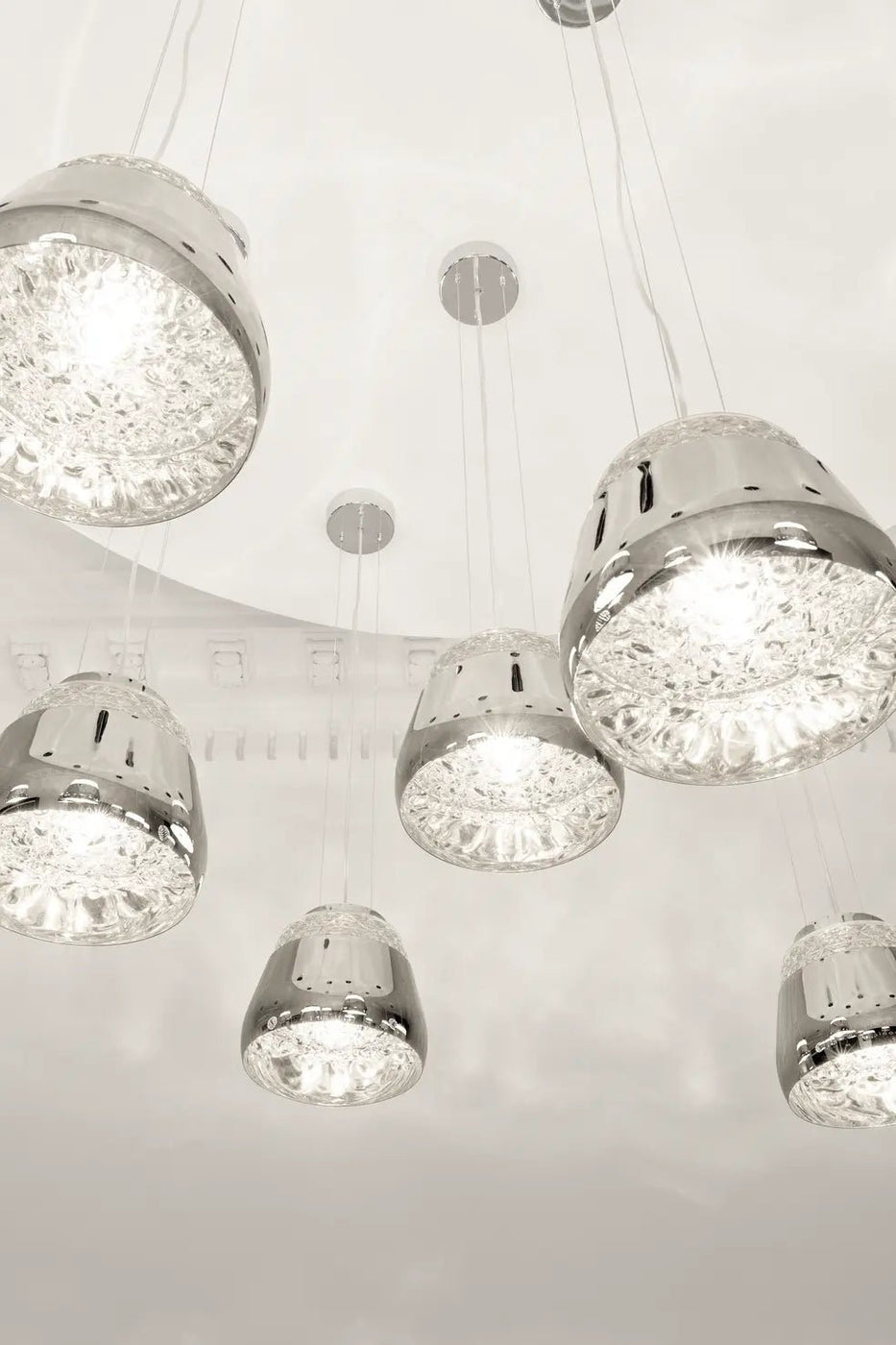 The Moooi Valentine Suspended by Marcel Wanders brings pure romance to lighting through this stunning jewel-like pendant that transforms crystal-clear blown glass into what looks like an endless bouquet of flowers frozen in time. The magic happens in how the reflective metallic shell - available in silver, gold, chrome, or black - acts like a mirror that multiplies and frames the crystalline interior, creating this incredible optical illusion where simple glass becomes a meadow of sparkling light. Available in baby and large sizes, the Valentine captures that excitement of unwrapping a carefully chosen gift, with each crystal formation catching and refracting light in ways that make the whole fixture shimmer and dance. The rounded form gradually expands toward the base, creating this organic flower-like silhouette that feels both precious and approachable. The technical execution is what makes this romantic concept actually work beautifully in real spaces rather than just looking impressive in showrooms. The baby size at just over 8 inches works perfectly for intimate spaces like bedrooms or cozy dining nooks, while the larger version handles more substantial rooms without losing that delicate, jewelry-like quality. The standard E12 socket in the baby version accepts up to 60W bulbs, giving you flexibility to choose the exact warmth and brightness that creates the mood you want. The transparent cord and matching ceiling canopy keep the focus on that incredible crystal and mirror interplay, while the UL listing ensures safe installation. The lightweight construction at around 5.5 pounds means straightforward mounting, though the visual impact makes it feel much more substantial. Moooi collaborates with visionary designers like Marcel Wanders because they understand that lighting should connect with our emotions rather than just illuminating spaces efficiently. Wanders' approach to design comes from his belief that "the true quality and meaning of design is measured in the heart and head of our audience," and the Valentine perfectly embodies this philosophy by creating genuine wonder and delight rather than just functional lighting. The brand's Dutch commitment to craftsmanship and innovation shows in how they've manufactured something that looks impossibly delicate while being durable enough for daily use, proving that when artistic vision meets technical expertise, you get pieces that enhance how we feel in our spaces rather than just how we see them.
