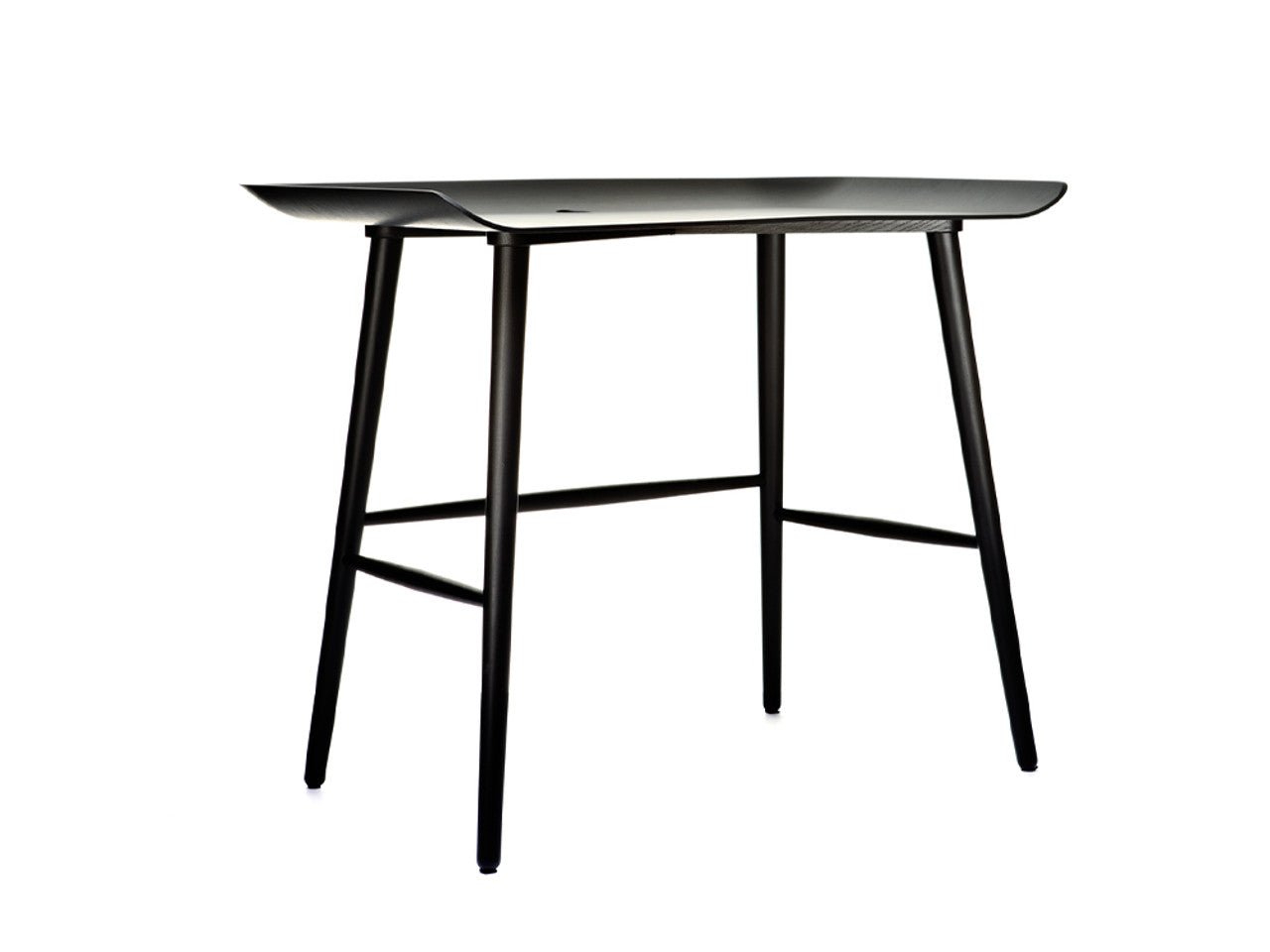 The Moooi Woood Desk is Marcel Wanders figuring out how to make a desk that doesn't look like every other rectangular workspace in existence. Designed in 2010, the whole thing centers on this 3D-pressed oak veneer top that's scooped out like someone carved it from a single piece of wood - except it's actually ultra-thin veneer pressed and bent using 3D technology to create those raised, curved edges. The effect makes the desk feel more like a sculptural object than office furniture, with the outer edges rising up slightly while the inner surface stays relatively flat for actual work. What's smart about the construction is how those curved sides turn the desktop into this tray-like shape that naturally contains your stuff without needing drawer organizers or desk accessories. The solid beech frame with its turned legs gives the piece enough weight and stability that it doesn't wobble when you're typing or leaning on it, and there's a 2-inch cable hole punched through the top so you can route chargers and cords without them snaking over the edge. The versatility is where this desk proves more useful than its dramatic appearance might suggest. It works as a proper writing desk or home office setup, but the scooped surface also makes it function as a side table where you can display books, art, or even use it as an oversized fruit bowl if that's your thing. The dimensions - about 39 inches wide, 22 inches deep, and 31 inches tall - give you enough workspace for a laptop and some papers without dominating smaller rooms, and the black stained finish hides the daily wear better than lighter woods that show every coffee ring. The raised edges mean pens and small items don't roll off onto the floor constantly, which sounds minor until you've used a completely flat desk and spent half your time retrieving stuff. The turned legs have this traditional craftsmanship quality that contrasts nicely with the modern pressed top, and the horizontal stretchers between the legs provide foot rests and structural support. Moooi's been Marcel Wanders' main creative platform since he co-founded it with Casper Vissers in 2001, and the Woood Desk reflects his approach of pushing furniture forms into unexpected territory while maintaining functionality. Wanders became famous for his Knotted Chair in the '90s and built his reputation on adding what he calls "romance and whimsy" to industrial design - he's Moooi's creative director and co-owner, so the brand's aesthetic is heavily his vision. The 3D pressing technology used on the tabletop was innovative when this launched, allowing Moooi to create those dramatic curves without laminating thick pieces of wood together. Made in the Netherlands with FSC-certified wood, so you're getting sustainable materials and Dutch manufacturing quality instead of particle board that sags after a year. The design has stuck around for over a decade because it solves the problem of wanting a desk with personality that still functions for actual work.