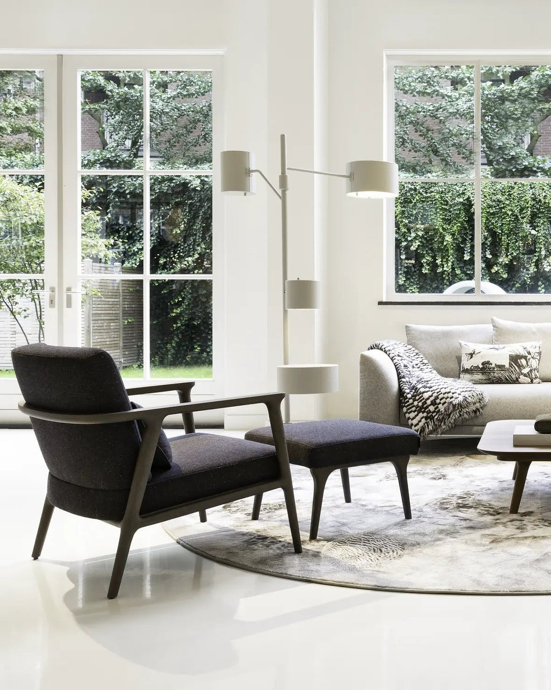 The Moooi Zio Lounge Chair is Marcel Wanders' take on mixing organic wood shapes with these clean, almost architectural cuts that keep it from looking too rustic or craftsy. The solid oak frame has this flowing quality where the arms and back connect in smooth curves, but then everything's finished with these sharp, straight edges that give it a contemporary edge. The wood itself comes in cinnamon stain, white washed, or this interesting combo of both if you can't decide between warm and cool tones. What's nice is how the proportions feel generous without being bulky - the armrests sit at a comfortable height for actually resting your arms instead of that awkward position where you're either reaching up or slouching down to use them. The upholstery options let you dial in exactly how much visual weight you want the chair to have in your space. Go with a lighter fabric and the wood structure stays prominent, or choose something bold and the cushioning becomes more of the focus. The seat and back cushions have enough depth to be genuinely comfortable for extended sitting sessions, not just those chairs that look inviting but you're shifting around after twenty minutes trying to find a comfortable position. The construction feels solid when you sit down - no flexing or creaking that makes you wonder if it'll hold up over time. Works well as a standalone reading chair or paired with the matching footstool if you want full reclining capability. Moooi operates out of the Netherlands with Marcel Wanders as co-founder and artistic director, bringing that Dutch design sensibility where furniture should have personality without being gimmicky about it. Wanders designed the Zio collection back in 2013 as part of this larger family that includes dining chairs, footstools, and tables that all share the same design language. The brand's known for producing pieces that manage to be both artistic and practical for everyday use, using quality materials and construction methods that justify the investment. They work with designers who understand that furniture needs to function well beyond just looking good in staged photos, which is why pieces like the Zio show up in actual homes rather than just design showrooms.